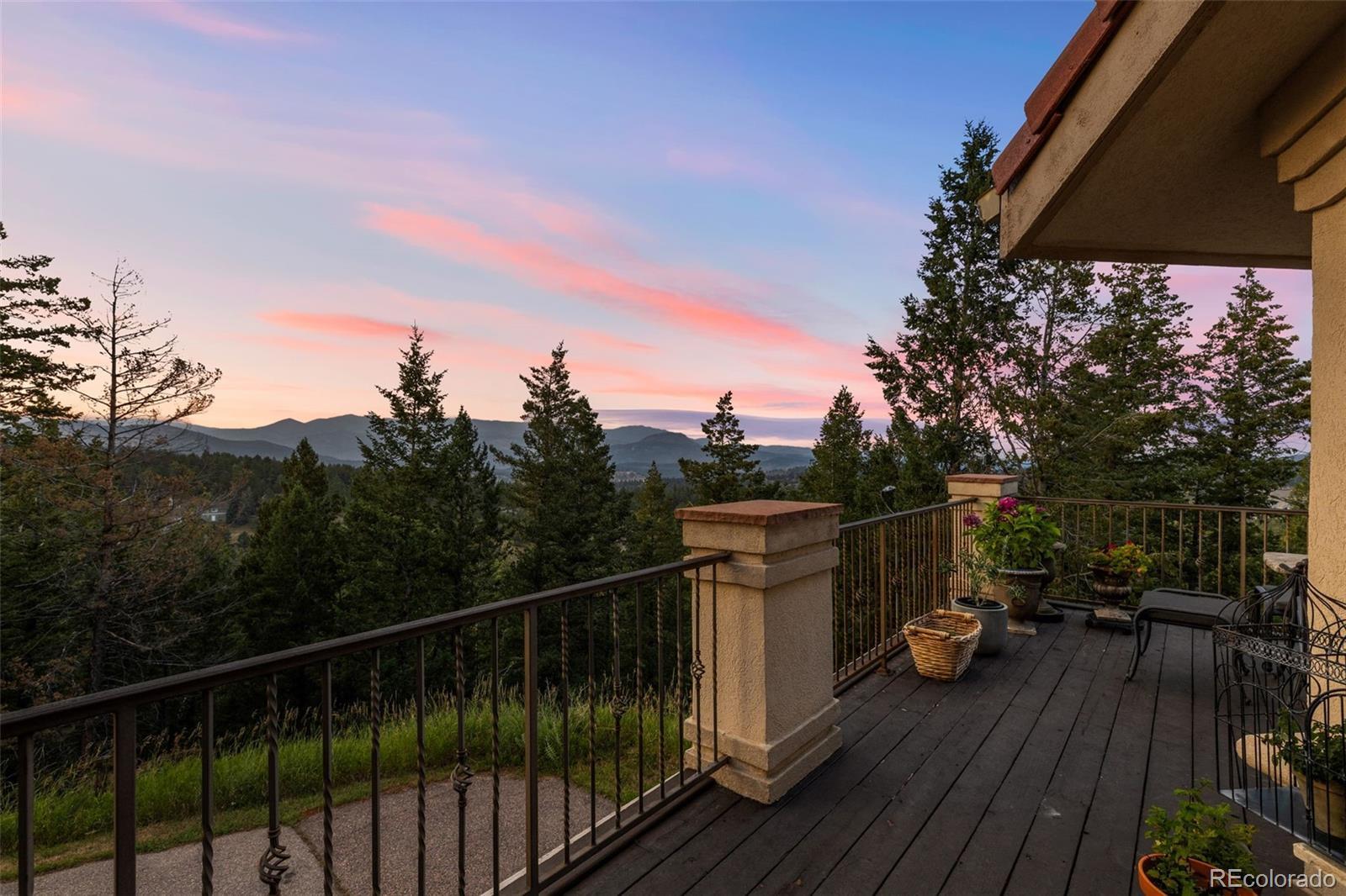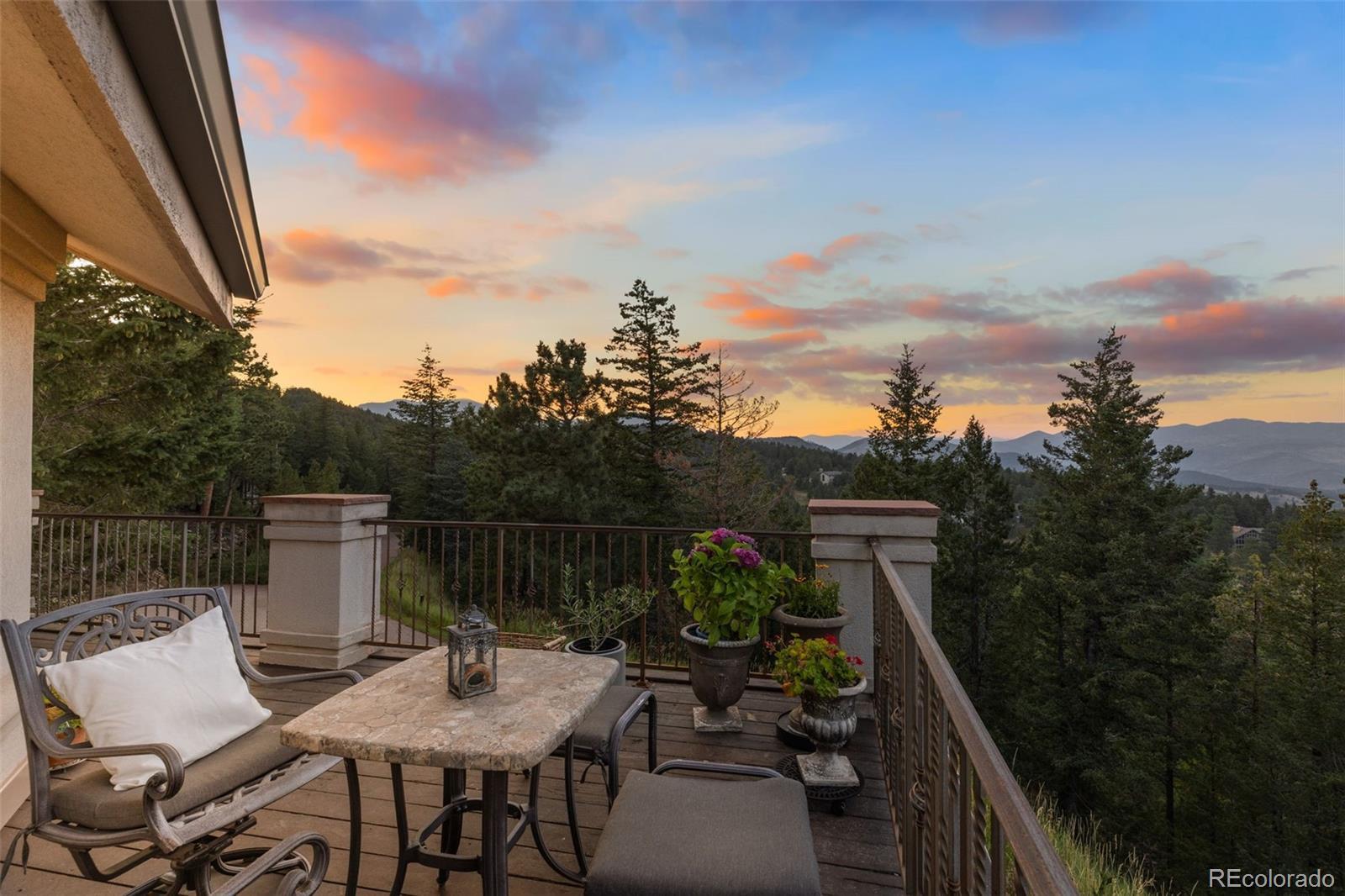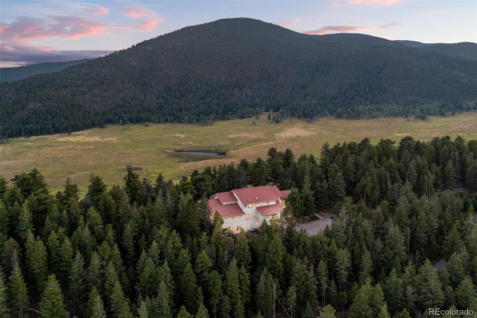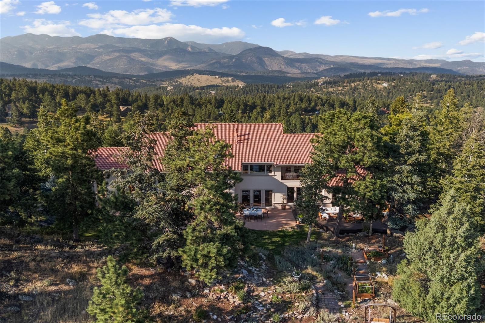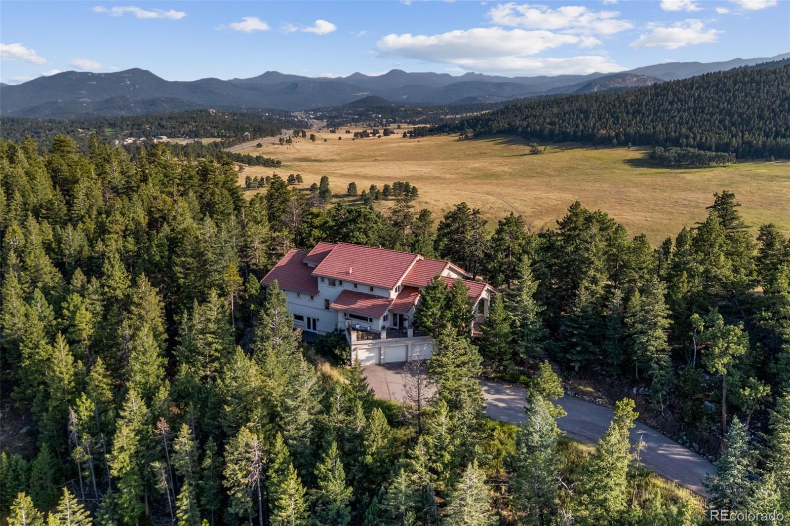 Soda Creek Mountain Retreat with Breathtaking Views! Discover the ultimate Colorado lifestyle in this expansive mountain estate, perfectly set on nearly seven private acres of serene pines with sweeping views of rolling meadows and layered peaks. Arrive down the private driveway and step into a setting of pure tranquility. Inside, a grand foyer welcomes you with soaring ceilings, a graceful curved staircase, and walls of natural light. The main level is ideal for everyday living and entertaining, featuring a spacious kitchen with island seating that seamlessly flows into the dining and family rooms, connected by the double-sided fireplace. Step outside to patios and wraparound decks that capture majestic mountain views in every direction, easily accessed from nearly every room in the house. Upstairs, the luxurious primary suite offers a private terrace, fireplace, spa-like bath, and a generous walk-in closet. Additional bedrooms upstairs and on the main level feature ensuite baths, perfect for family and guests. The walk-out lower level expands your living space with a home theater, wine cellar, bar, bonus rooms, and access to a heated three-car garage with workshop. All of this comes with an unbeatable location—just minutes from I-70. Enjoy quick access to Bergen Park, downtown Evergreen, and Denver, or head west to world-class ski resorts. Private, elegant, and endlessly inspiring, this one-of-a-kind Soda Creek estate offers the perfect blend of luxury and Colorado adventure.