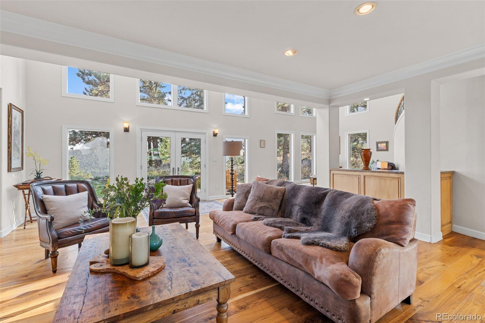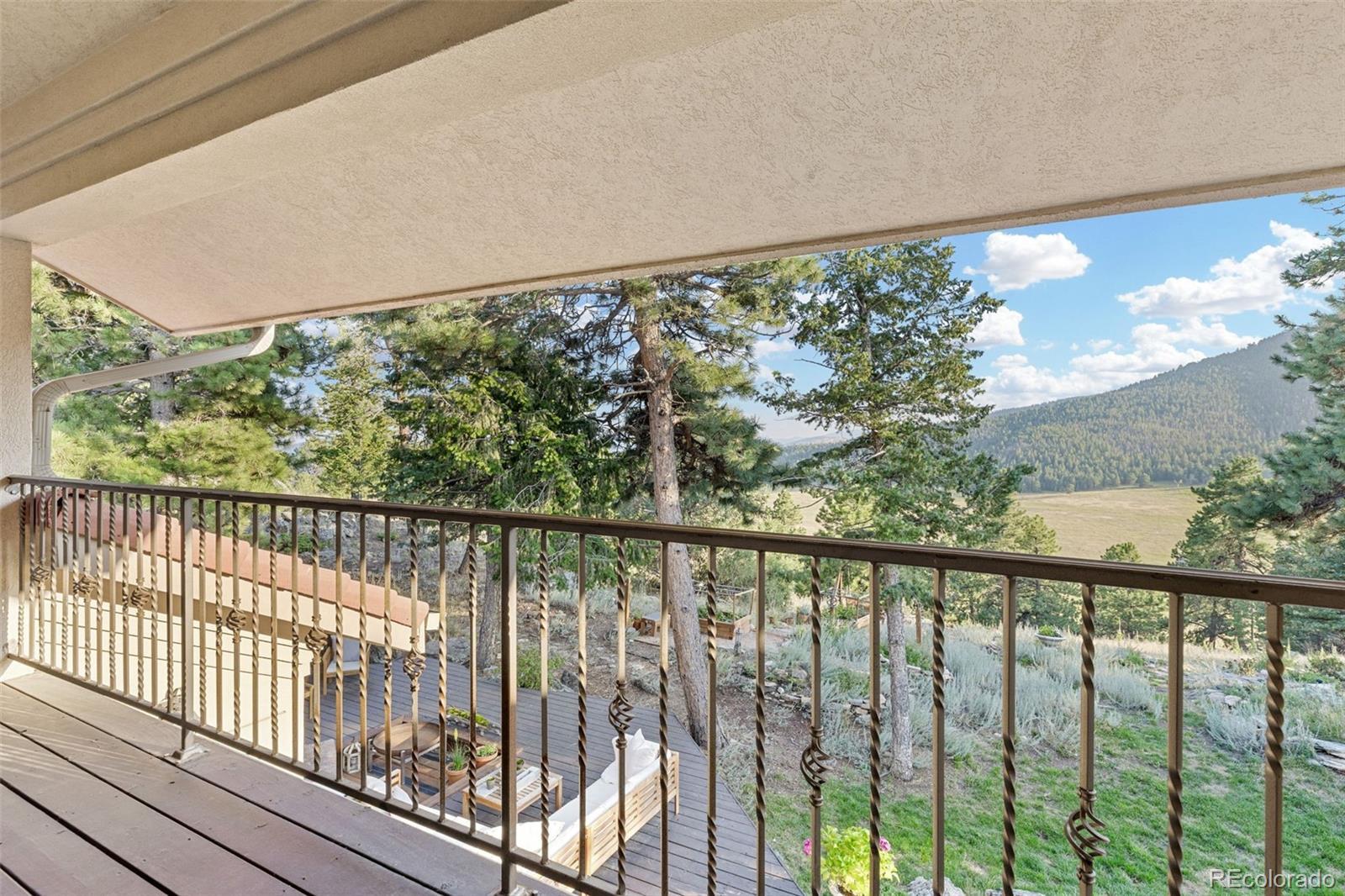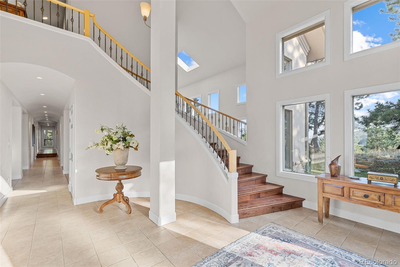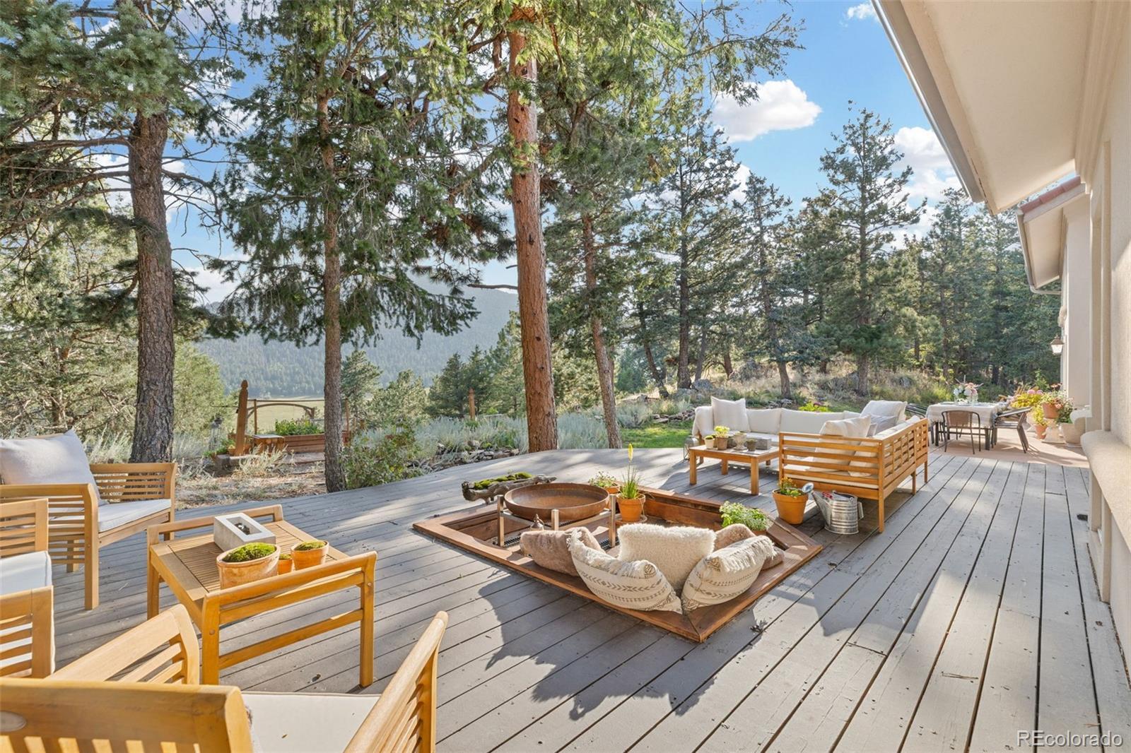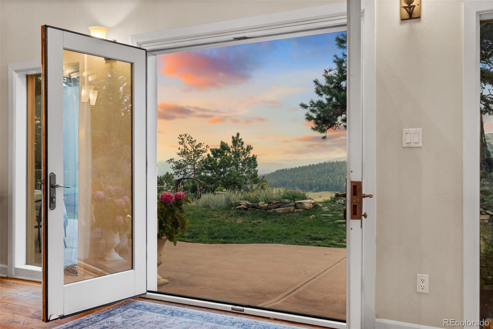 Soda Creek Mountain Retreat with Breathtaking Views! Discover the ultimate Colorado lifestyle in this expansive mountain estate, perfectly set on nearly seven private acres of serene pines with sweeping views of rolling meadows and layered peaks. Arrive down the private driveway and step into a setting of pure tranquility. Inside, a grand foyer welcomes you with soaring ceilings, a graceful curved staircase, and walls of natural light. The main level is ideal for everyday living and entertaining, featuring a spacious kitchen with island seating that seamlessly flows into the dining and family rooms, connected by the double-sided fireplace. Step outside to patios and wraparound decks that capture majestic mountain views in every direction, easily accessed from nearly every room in the house. Upstairs, the luxurious primary suite offers a private terrace, fireplace, spa-like bath, and a generous walk-in closet. Additional bedrooms upstairs and on the main level feature ensuite baths, perfect for family and guests. The walk-out lower level expands your living space with a home theater, wine cellar, bar, bonus rooms, and access to a heated three-car garage with workshop. All of this comes with an unbeatable location—just minutes from I-70. Enjoy quick access to Bergen Park, downtown Evergreen, and Denver, or head west to world-class ski resorts. Private, elegant, and endlessly inspiring, this one-of-a-kind Soda Creek estate offers the perfect blend of luxury and Colorado adventure.