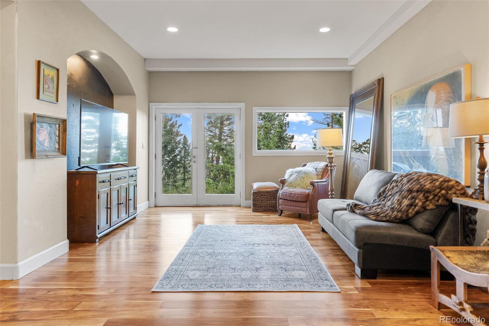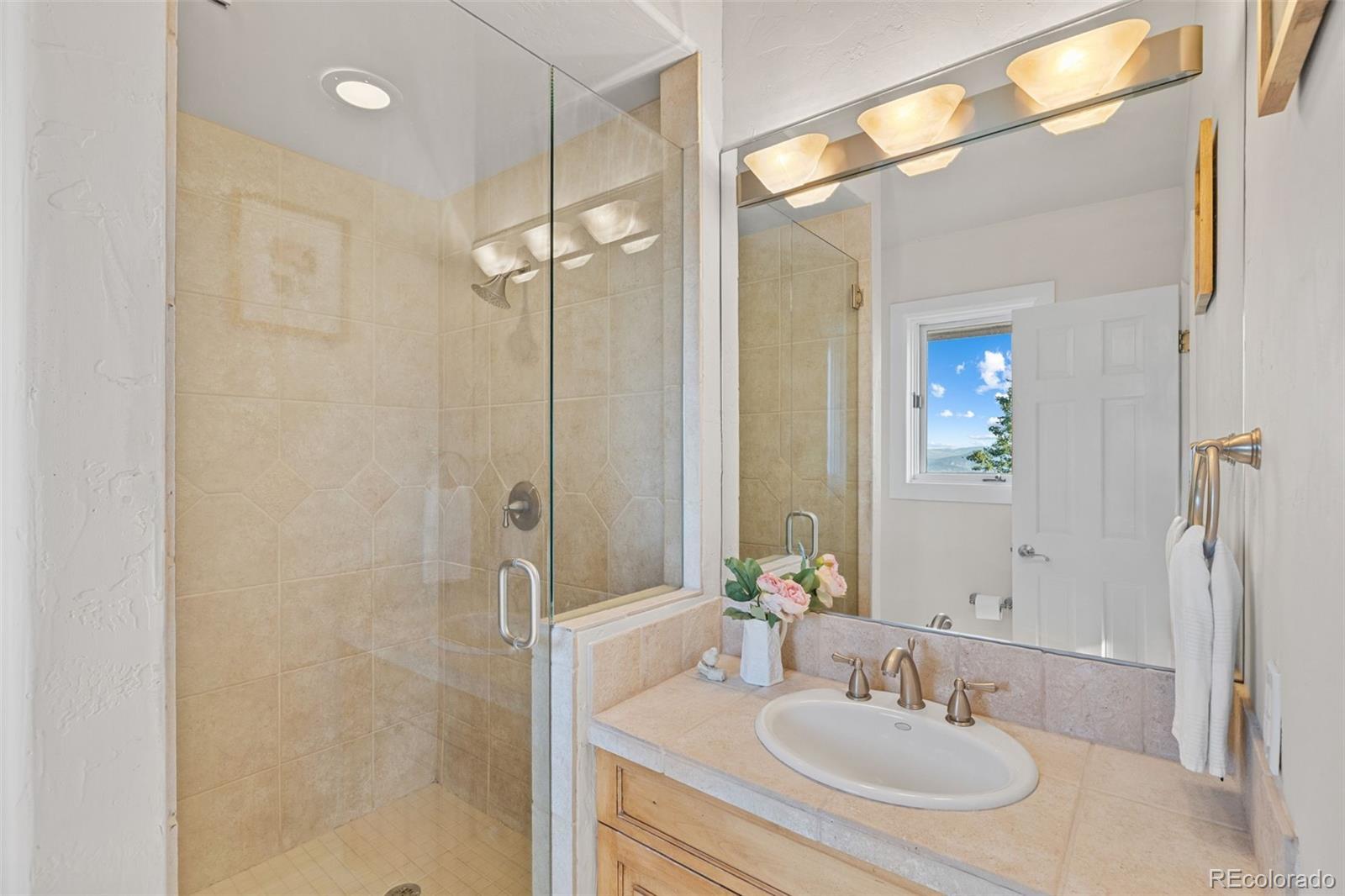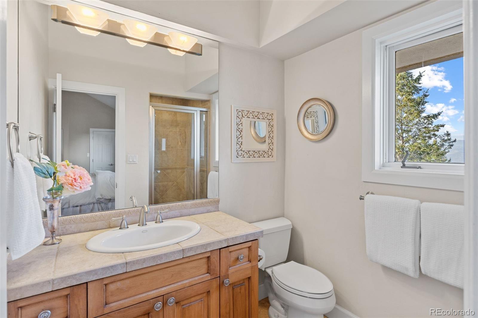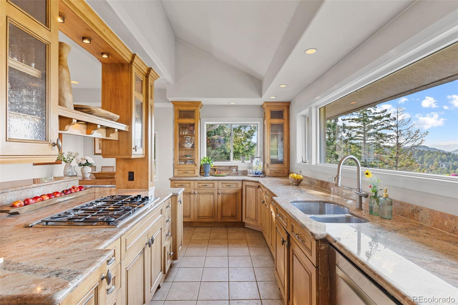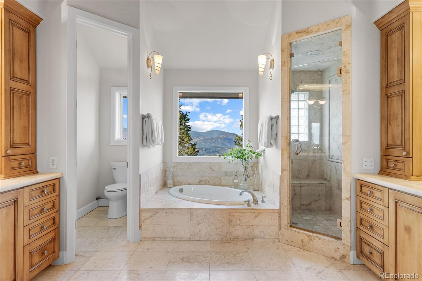 Soda Creek Mountain Retreat with Breathtaking Views! Discover the ultimate Colorado lifestyle in this expansive mountain estate, perfectly set on nearly seven private acres of serene pines with sweeping views of rolling meadows and layered peaks. Arrive down the private driveway and step into a setting of pure tranquility. Inside, a grand foyer welcomes you with soaring ceilings, a graceful curved staircase, and walls of natural light. The main level is ideal for everyday living and entertaining, featuring a spacious kitchen with island seating that seamlessly flows into the dining and family rooms, connected by the double-sided fireplace. Step outside to patios and wraparound decks that capture majestic mountain views in every direction, easily accessed from nearly every room in the house. Upstairs, the luxurious primary suite offers a private terrace, fireplace, spa-like bath, and a generous walk-in closet. Additional bedrooms upstairs and on the main level feature ensuite baths, perfect for family and guests. The walk-out lower level expands your living space with a home theater, wine cellar, bar, bonus rooms, and access to a heated three-car garage with workshop. All of this comes with an unbeatable location—just minutes from I-70. Enjoy quick access to Bergen Park, downtown Evergreen, and Denver, or head west to world-class ski resorts. Private, elegant, and endlessly inspiring, this one-of-a-kind Soda Creek estate offers the perfect blend of luxury and Colorado adventure.