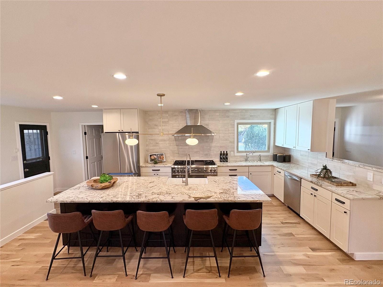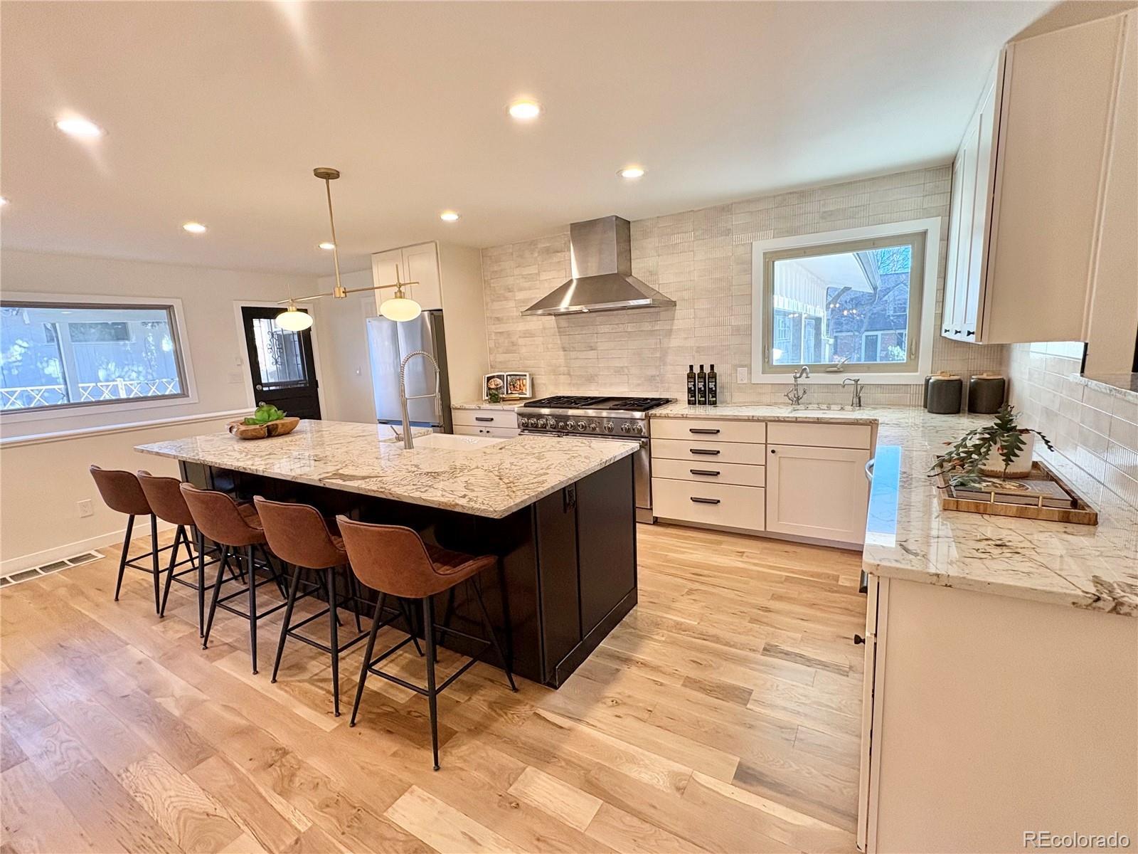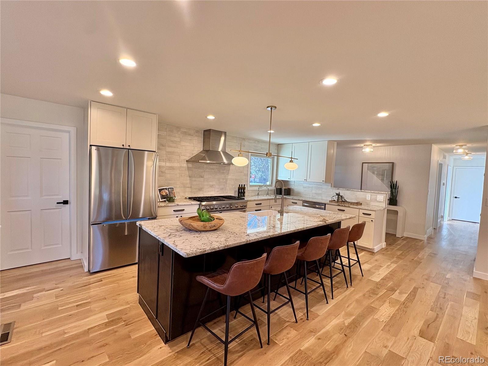 Welcome to this beautifully updated ranch-style residence in the highly desirable Applewood neighborhood of Golden. Sitting proudly on an oversized corner lot. Inside, you’ll find a bright, open layout featuring an open custom kitchen shaker style cabinets with a 48in commercial thermador gas range with double ovens, six burners and a griddle! A large island and seamless flow into the family and dining room, perfect for entertaining. French doors open to a stunning backyard with a water feature, covered gazebo and flagstone patios, perfect for entertaining. The main level includes two private bedroom suites, each with its own full bath, along with oak hardwood flooring throughout. The finished basement expands the living space with a wet bar, egress windows in both bedrooms, and plenty of room for guests or recreation. Enjoy peace of mind with recent upgrades including new interior and exterior paint, new carpet, new double-pane windows, and two brand-new garage doors with openers. All four bathrooms have new: Tile, vanities, countertops and plumbing fixtures.