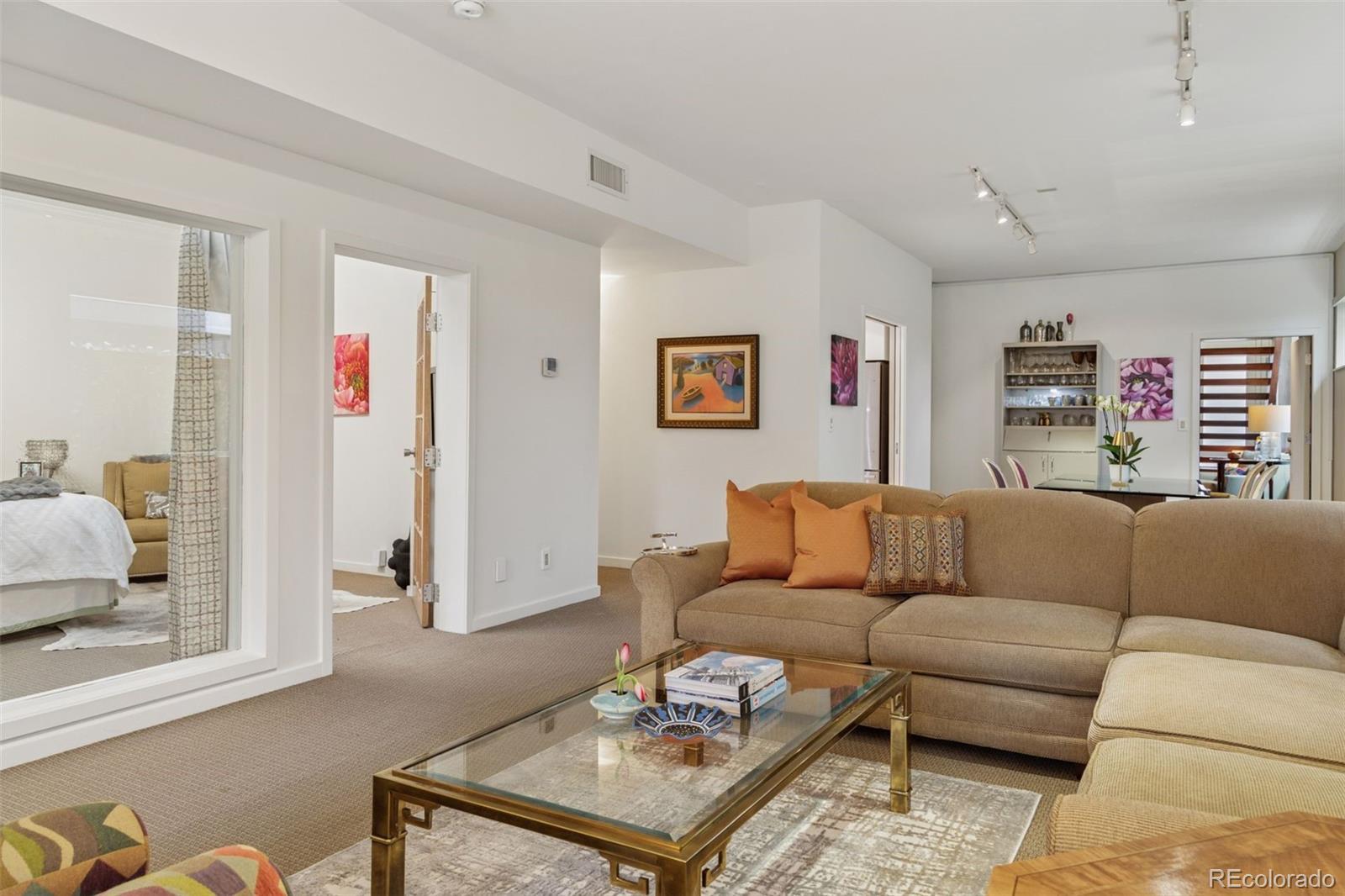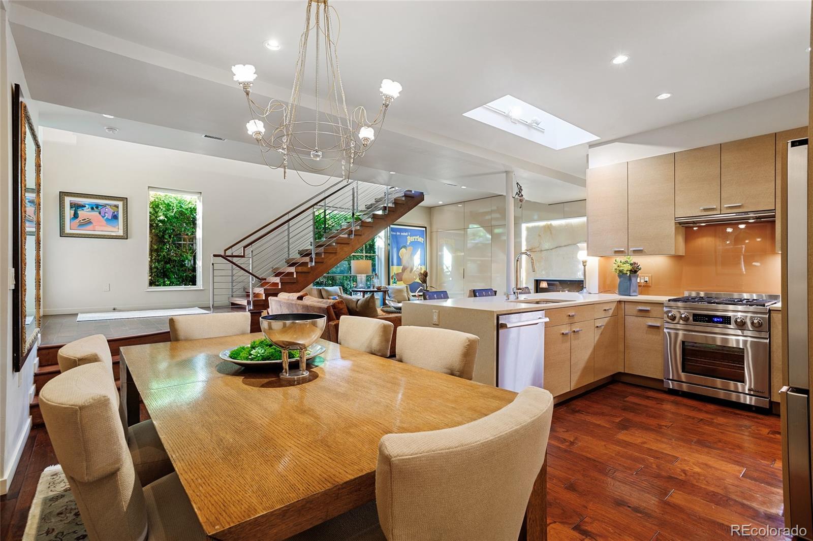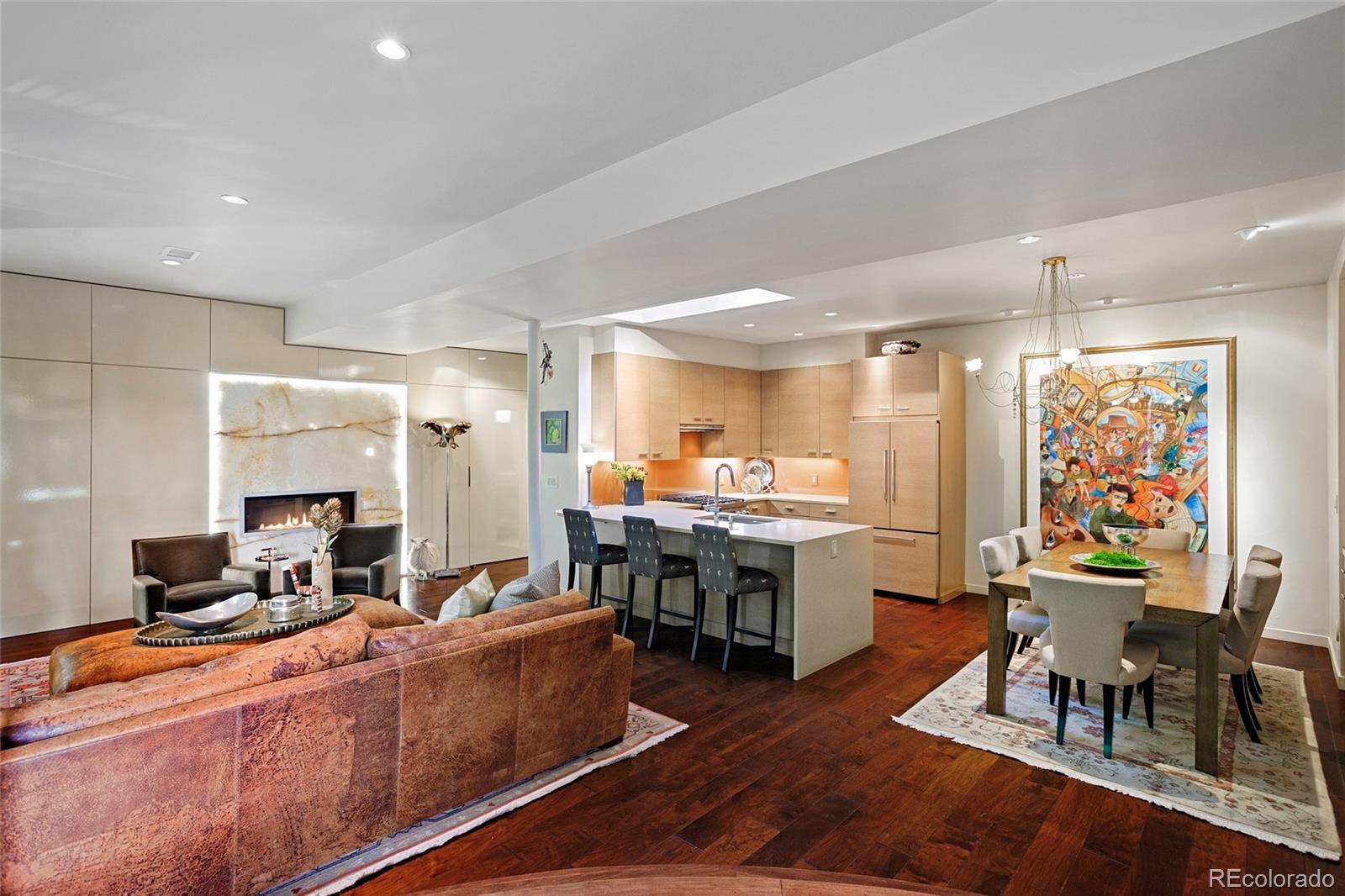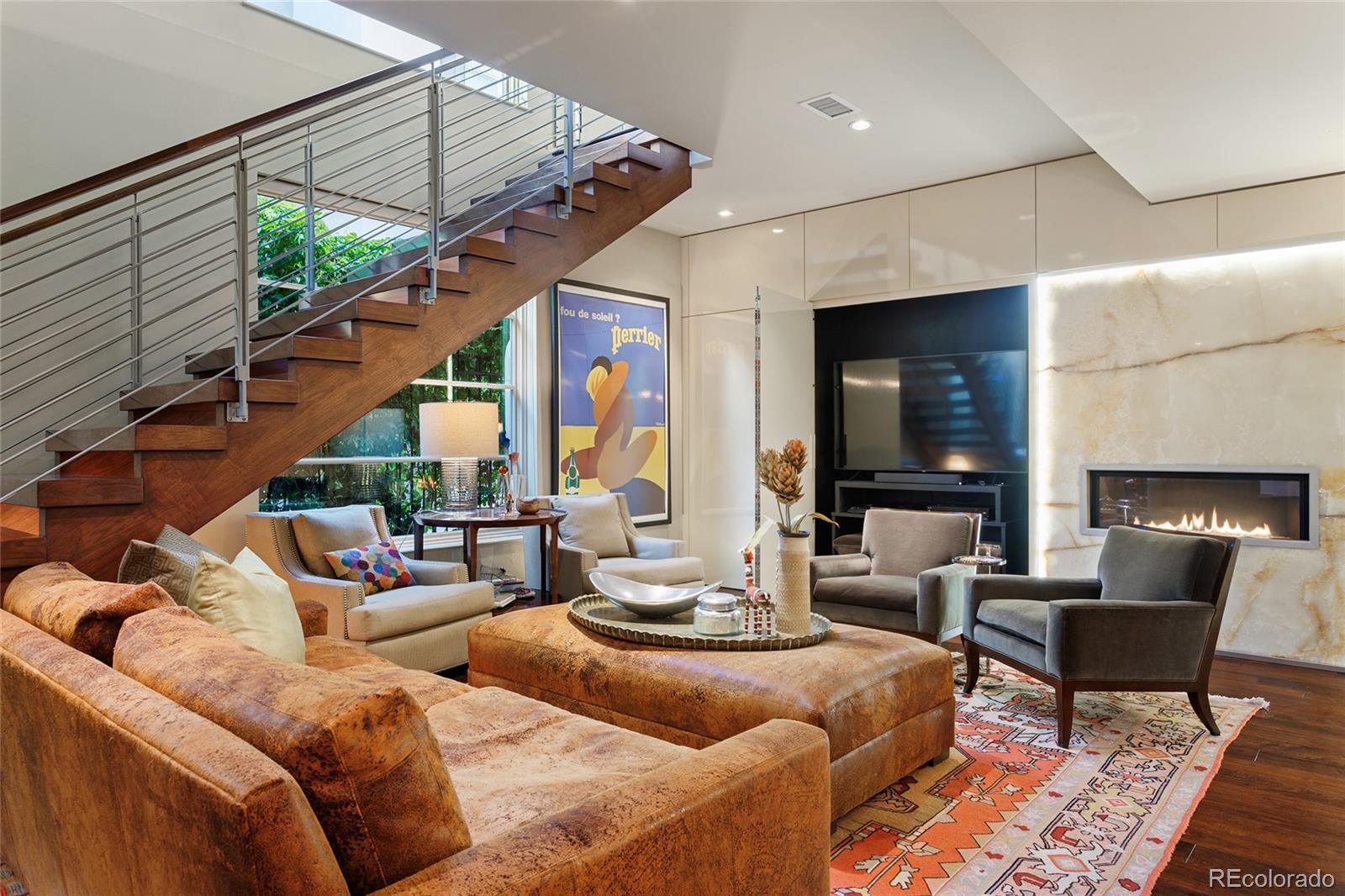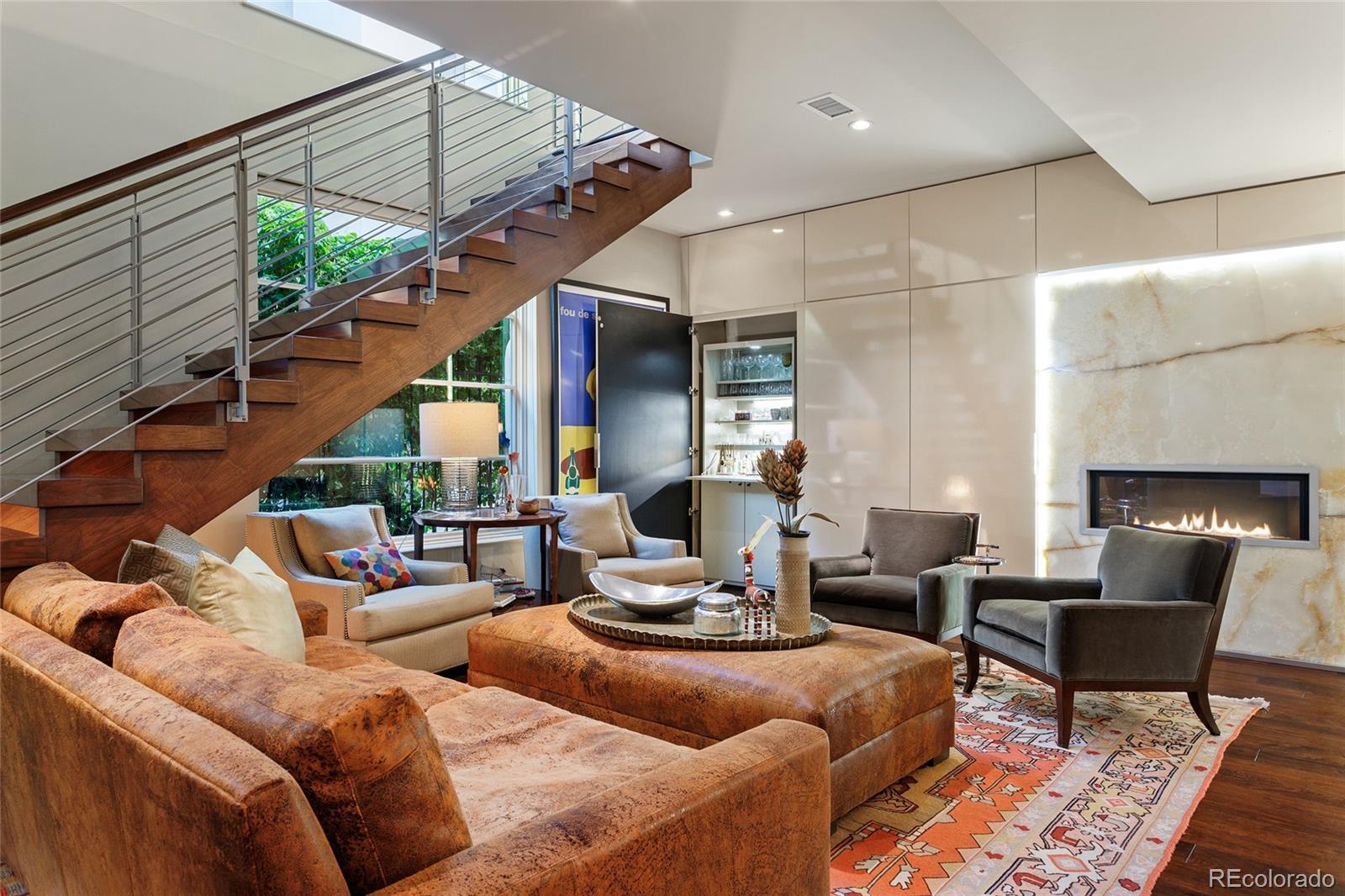 A rare blend of mid-century sophistication and modern versatility awaits at 865 Delaware, where striking design meets endless possibilities. This exceptional residence offers two fully self-contained living spaces, giving you the flexibility to create a luxurious single home, a multigenerational retreat, or a high-performing income property. The lower-level 2-bedroom suite features its own entrance, kitchen, living area, and baths, making it ideal for guests, rental opportunities, or a turnkey Airbnb. The main residence spans behind and above, unveiling an open-concept living space anchored by an illuminated onyx fireplace. High-end finishes abound, including Caesarstone countertops, Dacor appliances, Brookhaven cabinetry, and a cleverly integrated cocktail station that tucks away for seamless entertaining. A floating walnut staircase leads to a dramatic 22-foot-high open office and a lavish primary suite complete with steam shower, soaking tub, walk-in closet, and in-unit laundry. For those with vision, G-RX-5 zoning allows the potential to add up to three more stories—an extraordinary opportunity to elevate both lifestyle and investment value. Step outside to a private 1,250 sq ft rooftop deck that feels like a resort in the sky. With a 15-foot arched overhang, gas fireplace, dining and lounge areas, and tree-canopy views of Sunken Gardens Park, it’s an unmatched urban sanctuary just minutes from downtowns' great restaurants, Ball Arena, Coors Field, and what may soon be the new Broncos stadium. 865 Delaware isn’t just a residence—it’s a statement of design, luxury, and limitless potential.