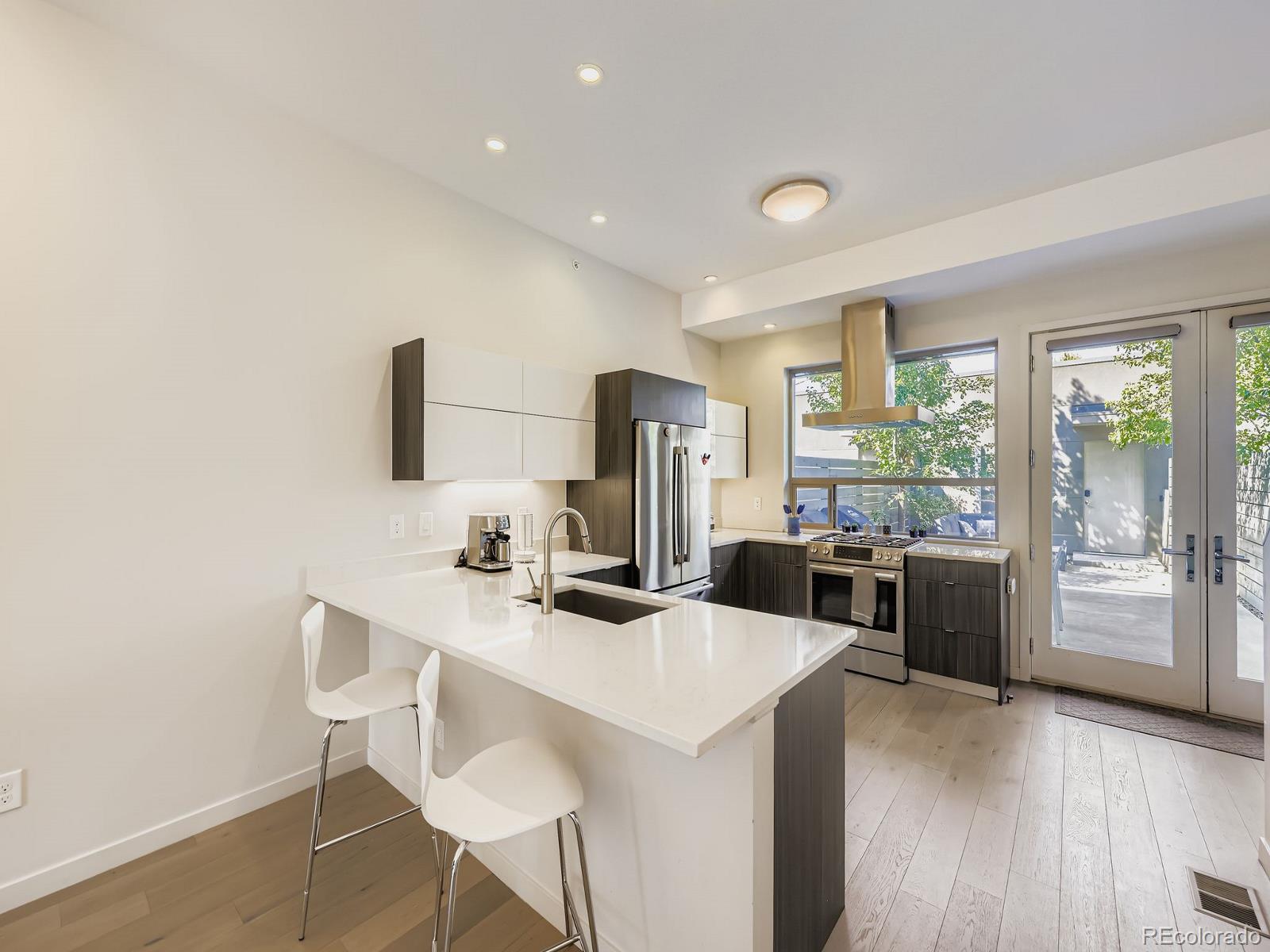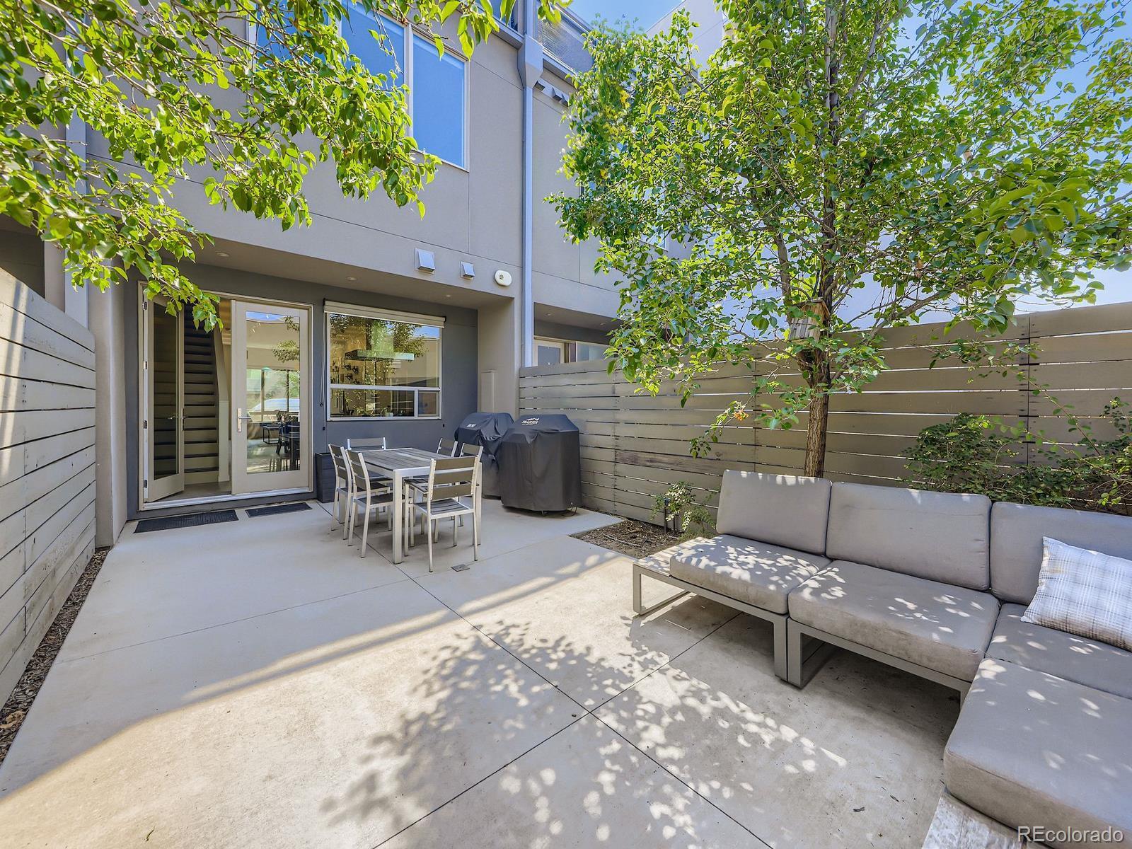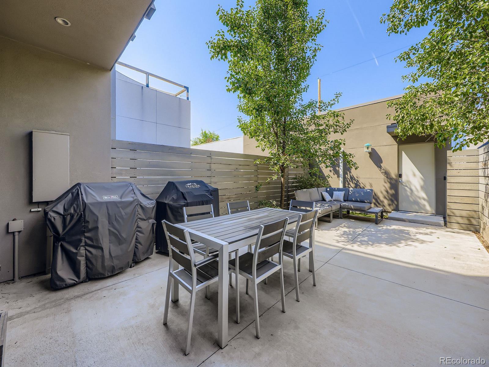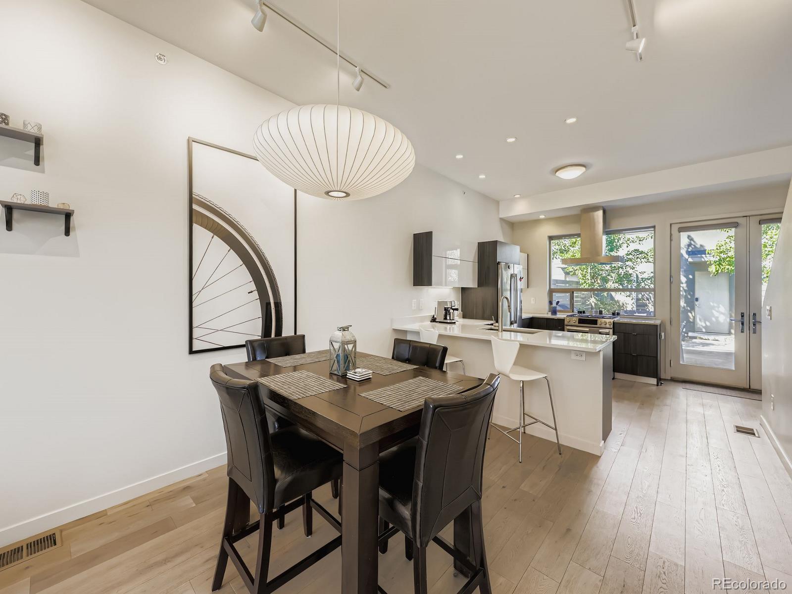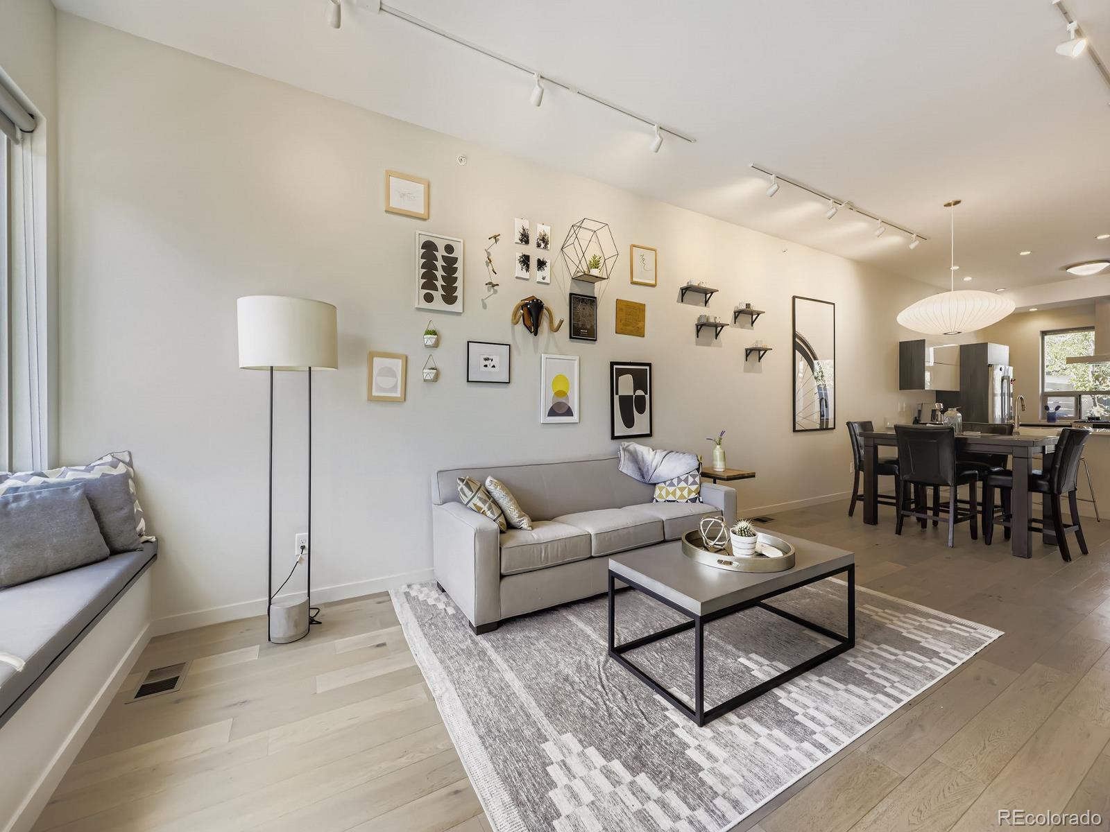 Modern 2018 townhome in Baker offering three levels of light-filled living, mountain views, and no HOA; the 2,192 sq ft layout features wide-plank hardwoods, custom lighting (including lighted stairs), solid-core doors, double-pane windows, and a smart thermostat, while the gourmet kitchen showcases local Abacus cabinetry, quartz counters, and a Bosch stainless suite with five-burner range, convection oven, and microwave drawer that opens to a private courtyard with gas tap; upstairs are two generous bedroom suites and an upper-level laundry, and the third floor is a 36' x 11' flex space that can serve as a palatial primary bedroom with wet bar and a partially covered 12' x 16' deck with hot tub and gas hookup—perfect for Front Range sunsets; parking is a standout with an oversized detached one-car garage (built-in storage and EV charger), driveway space for an additional car, and ample street parking (rare for many Denver neighborhoods); the setting is notably quiet thanks to the low-traffic street and a low-activity commercial neighbor at the rear; all just blocks from the Santa Fe Arts District, The Yard, and South Broadway with light rail about a mile away—call today to schedule your private showing!