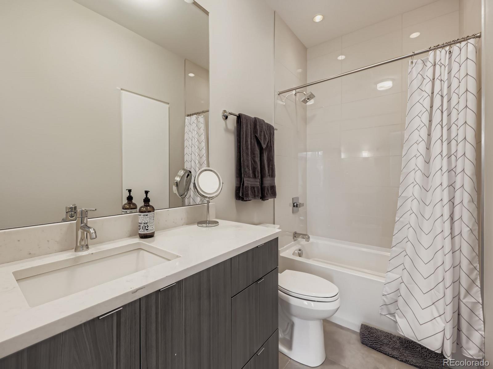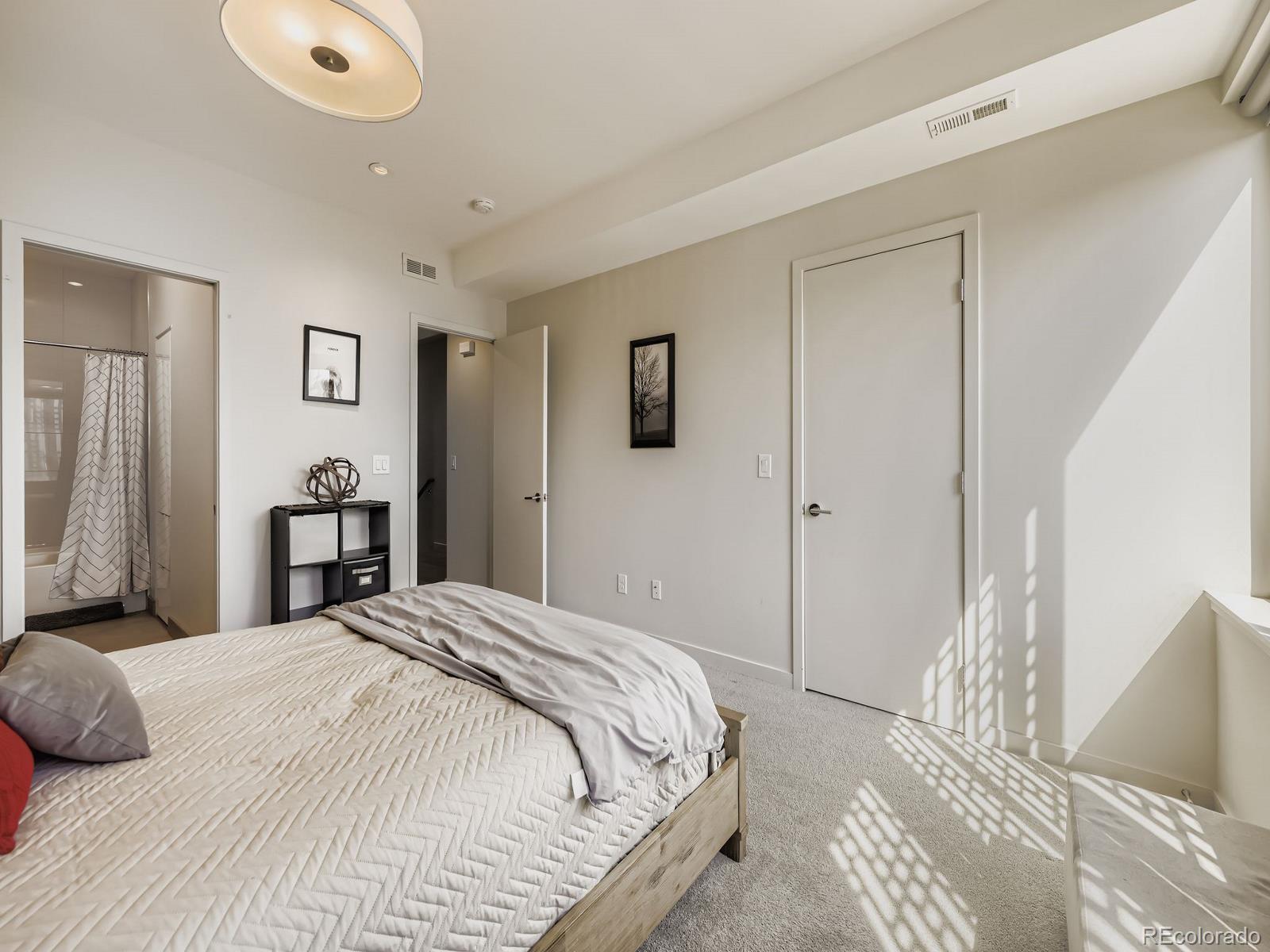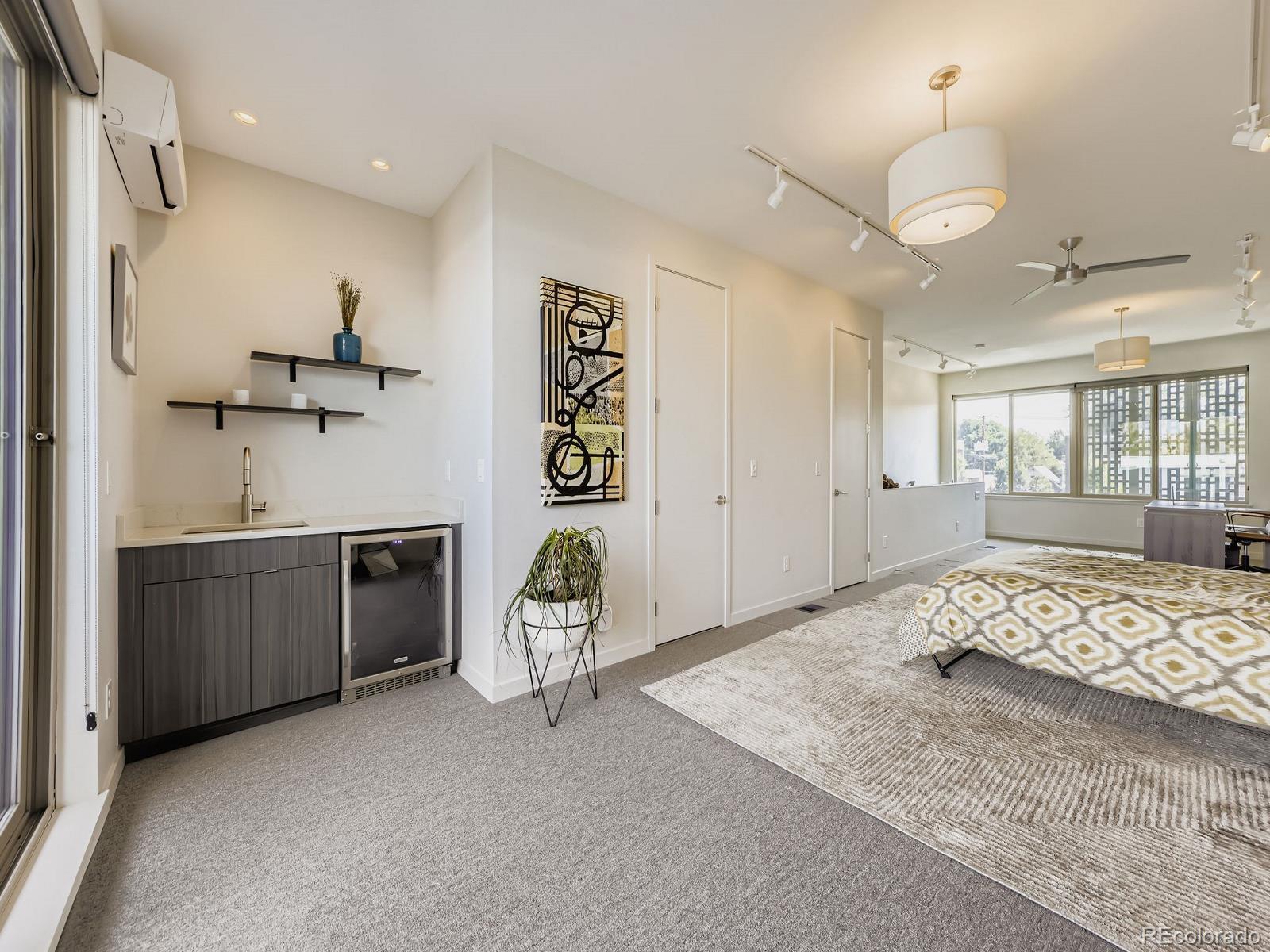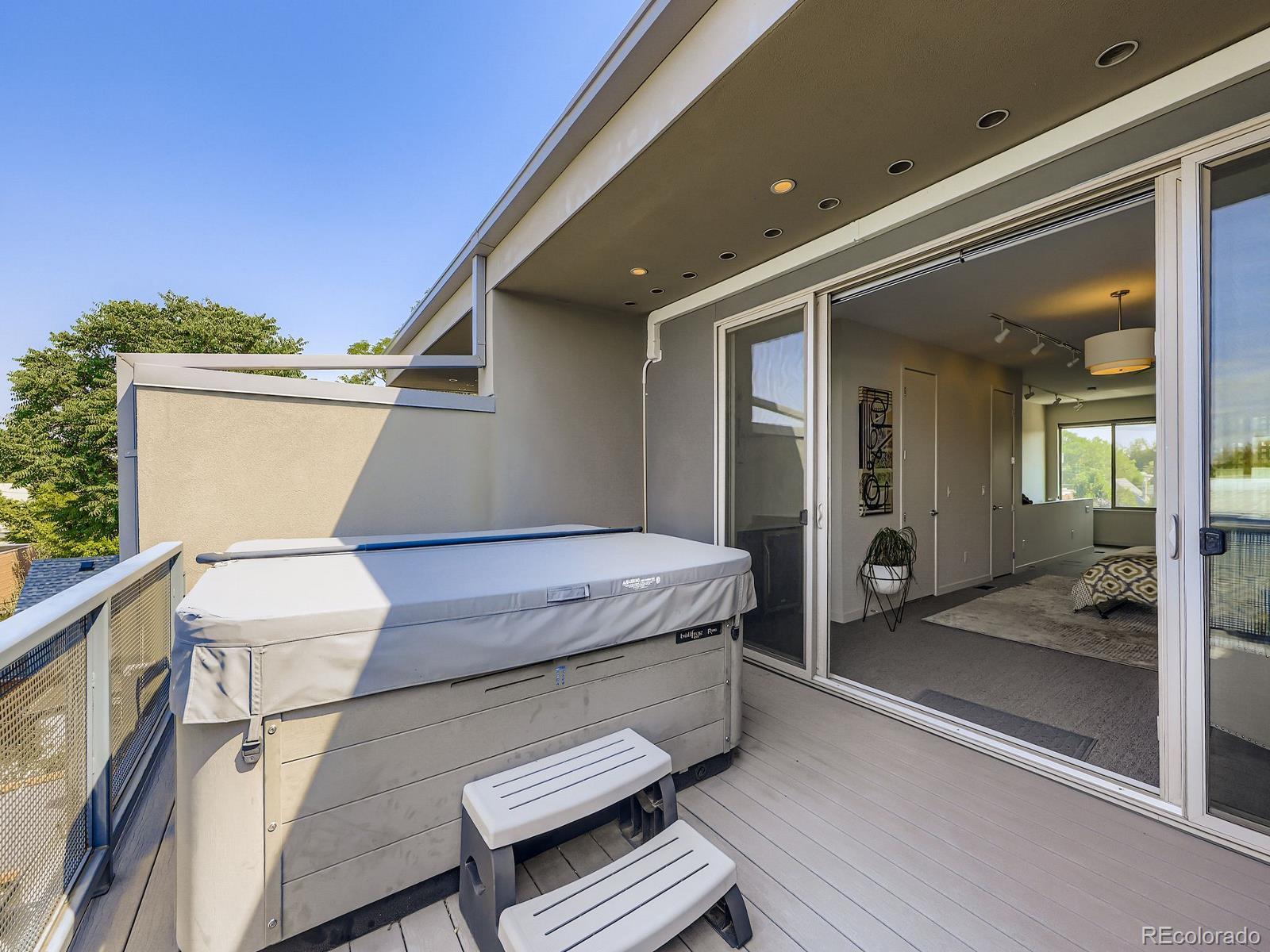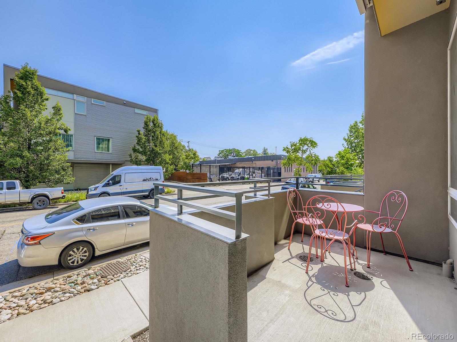 Modern 2018 townhome in Baker offering three levels of light-filled living, mountain views, and no HOA; the 2,192 sq ft layout features wide-plank hardwoods, custom lighting (including lighted stairs), solid-core doors, double-pane windows, and a smart thermostat, while the gourmet kitchen showcases local Abacus cabinetry, quartz counters, and a Bosch stainless suite with five-burner range, convection oven, and microwave drawer that opens to a private courtyard with gas tap; upstairs are two generous bedroom suites and an upper-level laundry, and the third floor is a 36' x 11' flex space that can serve as a palatial primary bedroom with wet bar and a partially covered 12' x 16' deck with hot tub and gas hookup—perfect for Front Range sunsets; parking is a standout with an oversized detached one-car garage (built-in storage and EV charger), driveway space for an additional car, and ample street parking (rare for many Denver neighborhoods); the setting is notably quiet thanks to the low-traffic street and a low-activity commercial neighbor at the rear; all just blocks from the Santa Fe Arts District, The Yard, and South Broadway with light rail about a mile away—call today to schedule your private showing!