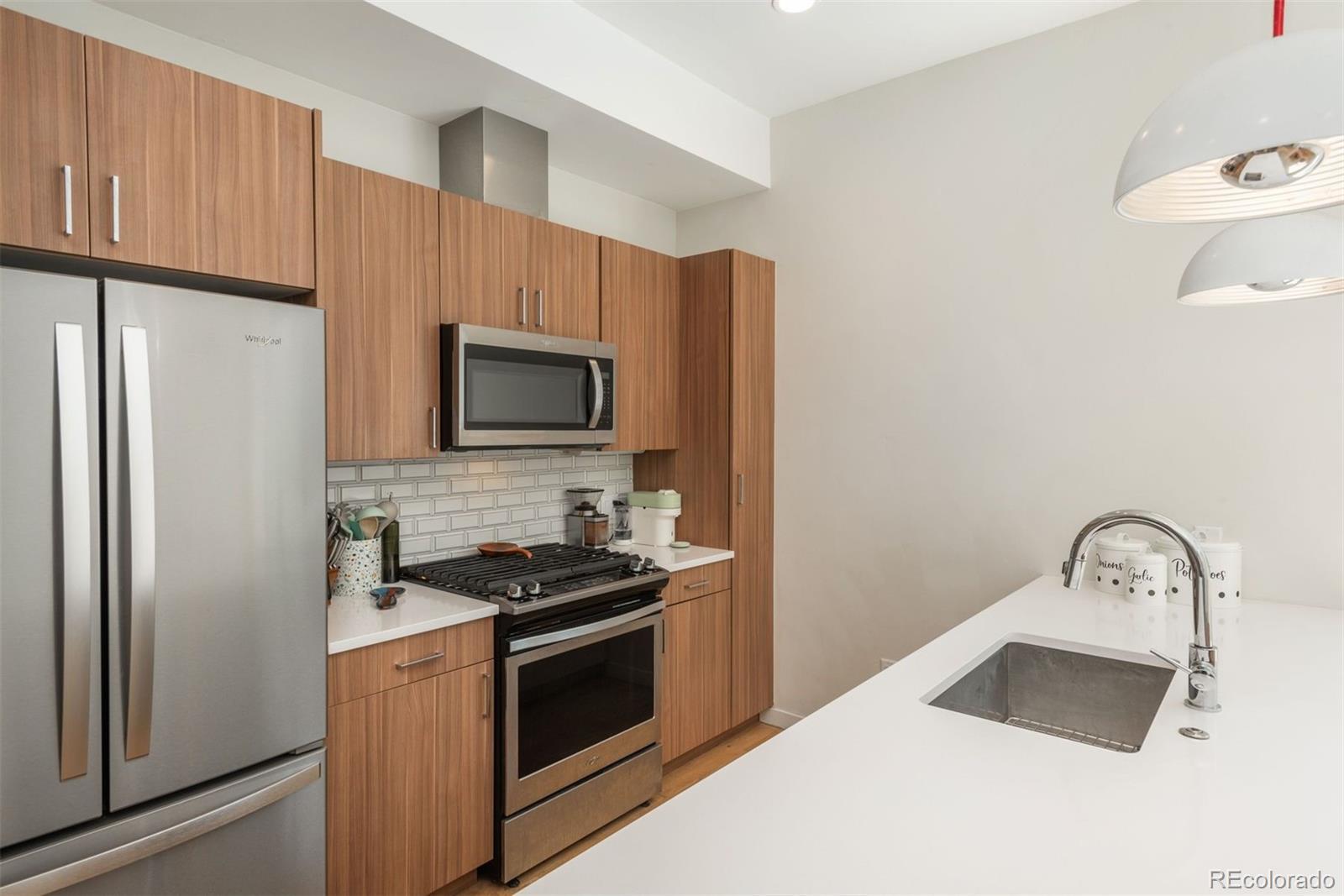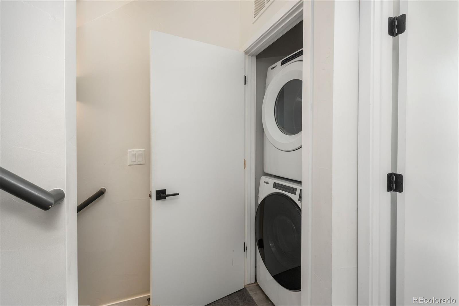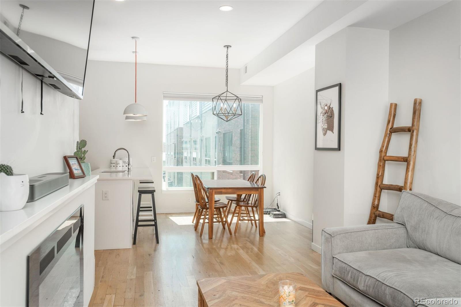 Experience modernist living at its finest in this freshly painted townhome located in the thriving transit-oriented development of Railhouse in Sunnyside. Boasting a premium location with unbeatable rooftop views of downtown Denver and the majestic mountains, this 4-story unit offers luxury living at its best. Upon entering, you'll be greeted by a spacious foyer with a convenient closet and access to an attached 2-car garage - a rare luxury in the city. The second floor showcases an open-concept layout featuring a sleek kitchen with quartz countertops, stainless steel appliances, and soft close cabinetry. The kitchen seamlessly flows into the dining and living areas, all adorned with hardwood flooring and oversized windows that flood the space with natural light. A cozy electric fireplace adds warmth, while a tucked-away powder room is perfect for guests. The bedroom level houses two primary suites, each with their own quartz and tiled baths and ample closet space. A stackable laundry unit is conveniently located next to the bedrooms. On the upper level, step out through an atrium door onto the rooftop deck to enjoy breathtaking views of the city skyline and mountains - perfect for entertaining guests or unwinding with a glass of wine. Located just a block away from the 41st and Fox Street light rail station, this home offers easy access to D.I.A. and is situated near the Platte River and Cherry Creek paths, ideal for outdoor enthusiasts. Within walking distance you'll find a variety of yoga studios and restaurants, including popular spots like Waldschanke Ciders & Coffee, Huckleberry Roasters Coffee, and Diebolt Brewing Company. Experience urban living at its best in this prime Sunnyside location, with the community sharing the cost of snow removal and exterior maintenance for added convenience. Don't miss out on this exceptional opportunity to own a piece of urban paradise!