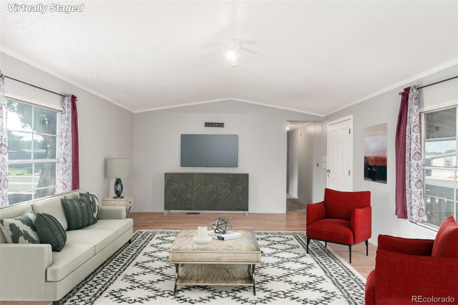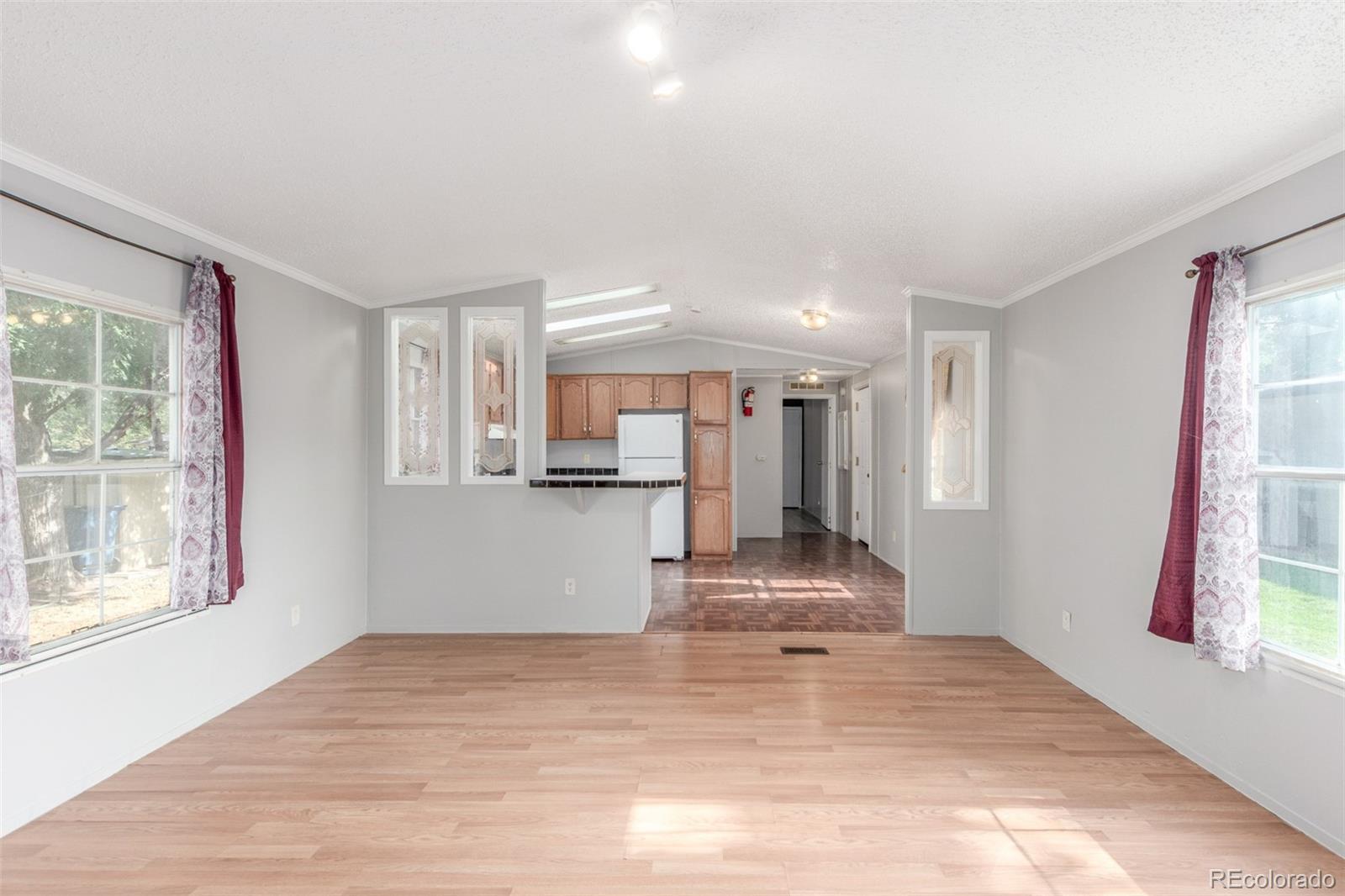 A sense of comfort and functionality defines this three-bedroom, two-bath manufactured home, presenting an approachable opportunity for homeownership without compromise. Offering 1,216 square feet of living space, the thoughtfully designed layout emphasizes light, flow, and connection, ensuring each room feels purposeful while maintaining a welcoming charm. The kitchen serves as a bright centerpiece, enhanced by a skylight and window that draw in natural light to highlight honey-toned cabinetry and parquet flooring. A clever passthrough with counter seating connects the kitchen to the living room, allowing conversations to carry easily and making entertaining feel effortless. The living room itself provides an inviting atmosphere with space for both everyday living and gatherings, while the open flow creates continuity between shared areas. Each bedroom is generously sized and well-appointed with excellent storage, offering flexibility for rest, work, or hobbies. The primary suite is a retreat of its own, complete with a large soaking tub, a separate shower, and ample vanity space designed for comfort and ease. Functionality continues with the convenience of in-unit laundry, while outside, mature trees and an adjacent greenbelt bring a sense of calm and privacy to the setting. This natural backdrop offers a refreshing oasis just beyond the door, a rare find at this price point. Practical details make life simpler, too, with the HOA handling road maintenance and snow removal, providing year-round ease and peace of mind. Together, these elements create a home that is both attainable and enriching, blending affordability with thoughtful design and a connection to its surroundings.