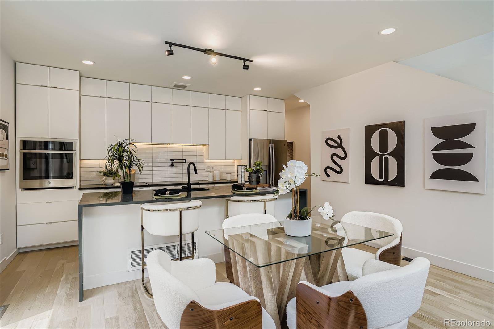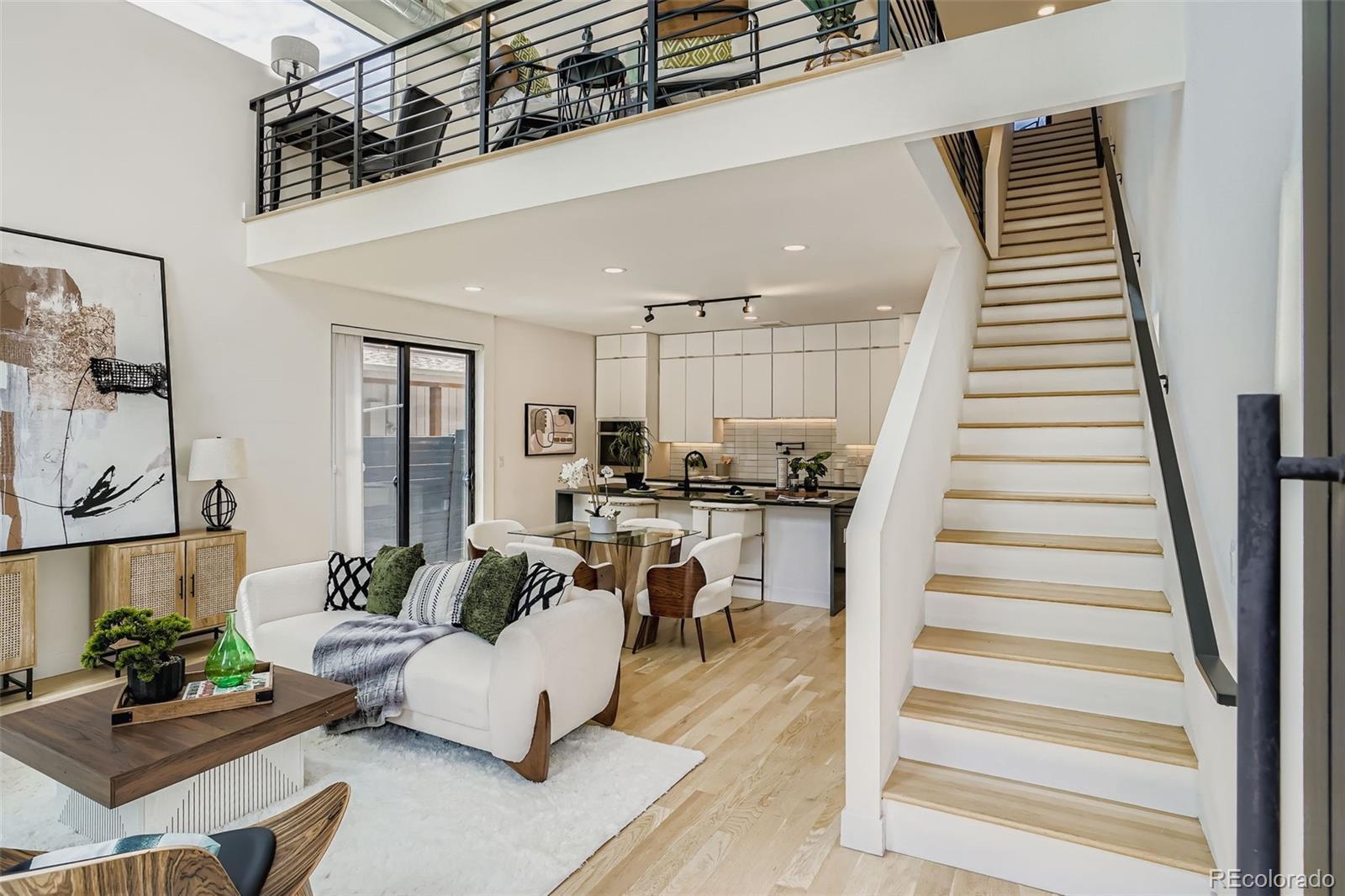 This description highlights a stunning contemporary townhome located in the highly desirable Sunnyside neighborhood across the street from the beautiful La Razza park, perfect for walks for your dog, this park is currently being under construction with an 8 million dollar renovation. The open floor plan is bathed in natural light, thanks to dramatic floor-to-ceiling windows and skylights. The chef’s kitchen is a standout, featuring ample counter space, stainless steel appliances, quartz countertops, a large island, an under-mount sink, and an in-wall pot filler. The main floor boasts a bedroom with an ensuite, five-piece bathroom and a spacious walk-in closet, could easily be used as another main floor master. Upstairs, the second floor includes a 2nd floor master suite with 3/4 bath, an additional bedroom and full bath and a cozy loft offering park and city views. The third level serves as a private retreat with a wet bar and a west-facing balcony. The finished basement impresses with tall ceilings, two egress windows, a large recreation room, a guest bedroom, a full bathroom, and additional storage. The low maintenance backyard offers privacy and features a two-car detached garage. Additional amenities include oak hardwood floors, custom light fixtures, sleek metal railings, a multi-zone heating and cooling system, a tankless water heater, solar panels owned by seller, and a welcoming front deck. With excellent walkability, this home is just a short stroll from popular shops and restaurants, making it a truly exceptional property. Please note the average utilities are $100 per month due to solar.