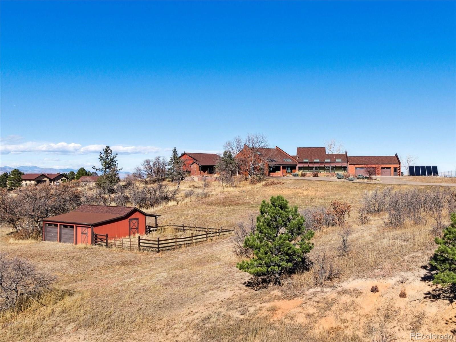 Perched on one of the highest elevations within desirable Indian Creek Ranch, the stunning Sacco Estate is situated perfectly on 5 acres at the end of a quiet cul-de-sac. A black iron gate opens to reveal this “one of a kind” spanning 10,239 sq ft, 5 BR estate featuring hardwood floors, 3 fireplaces, skylights, breathtaking mtn & city views. For the true culinary enthusiast, the kitchen features Silestone quartz countertops, SS appls, island/breakfast bar, built-in desk, 55” high custom cabinets, amazing mountain views & Denver downtown city views. A unique aspect of this estate is its exceptional design, its configured to accommodate extended family, rental income or cater to multigenerational living through its distinct west & east wing separation. East wing has a mother-in-law suite w/soaring ceilings, stone gas fireplace, nice full-sized kitchen, nook, ¾ bath, laundry & separate main floor entry. You'll love the extraordinary pool & entertaining room, which is unlike any you've ever seen; featuring a swimming pool, relaxing hot tub, dedicated bar, indoor sauna & elegant waterfall cascading into the pool. Not interested in a pool? Convert this grand room into basketball court, ballroom, sizable gym, whatever you desire! The BRs including the primary BR have en suite remodeled baths & walk-in cls! Check out the oversized attached 3-Car garage and the detached garage/barn w/room for 2 cars and 2 horse stalls w/paddocks. Newer windows & roof, Solar panels (paid for), 2 septic systems with Use permit! Fire Hydrant off driveway - low insurance $! Community clubhouse, playground, equestrian arena & bridle path that goes thru the neighborhood. Take an adventure up the canyon w/Pikes Natl Forest, OHV riding at Rampart Range, world-class rafting & fishing. Sedalia offers a small-town vibe w/easy access to city amenities, shopping, restaurants & C470/I-25. Low HOA, great schools, nice neighbors! Acquiring an estate such as this is truly a rare opportunity!