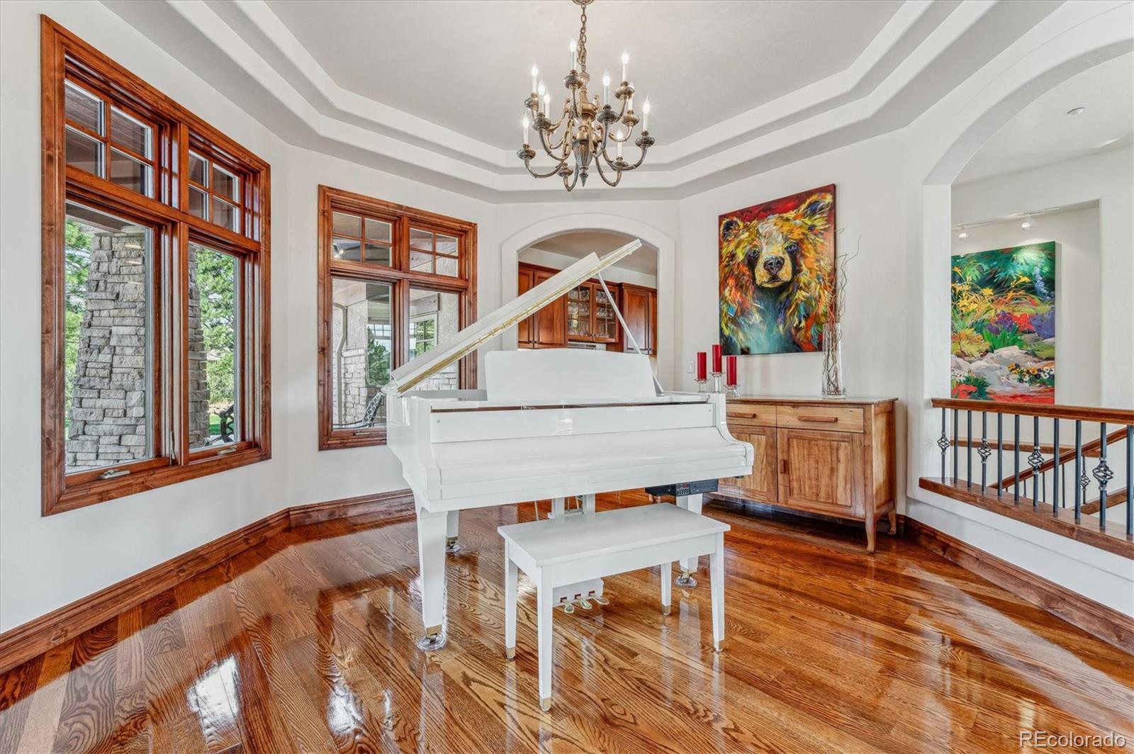 Discover this exceptional Summit Chalet home, distinguished by its unique design and expansive ranch floorplan. Enter through a grand foyer to literally gleaming hardwood floors to find a formal living room, dining room and main floor office. The gourmet kitchen has everything you would ever need including a gas cooktop, breakfast nook and fabulous island. The huge main floor master suite includes a luxurious 5-piece spa like master bath and walk-in closet with built-ins. Marvel at the floor-to-ceiling windows offering unparalleled 360-degree views. The home features large bedrooms with generous walk-in closets and a stunning walkout lower level with a huge family room, built-in bar, entertainment area, and library. Art niches, sculptured drywall and three fireplaces are just a few of the many features. Over six acres of land adorned with pine trees, scrub oak, and Juniper trees enhance the charm. Wildlife is abundant, and the landscape is beautifully designed with moss rock retaining walls. The property boasts upper and lower decks and thousands of acres of open space just across the street. Additional amenities include a security system, humidifier, fire protection sprinkler system, and central vacuum system readiness. Recent updates include new exterior paint and stain, a new deck, and a new dishwasher.