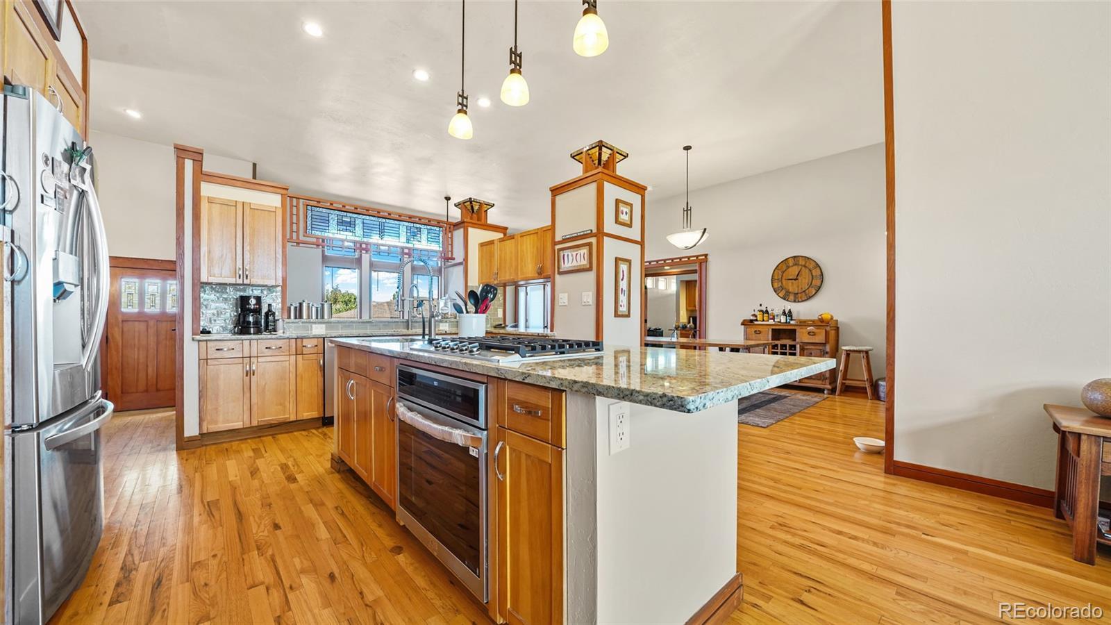 HUGE Price Reduction! Architecturally stunning custom home inspired by Frank Lloyd Wright, showcasing soaring ceilings, warm hardwood floors, and walls of windows that flood the interior with natural light. The open-concept living room features a dramatic curved fireplace and flows seamlessly into the dining area and gourmet kitchen. The chef’s kitchen is equipped with granite counters, a gas cooktop island, pendant lighting, abundant cabinetry, and an oversized walk-in pantry—perfect for entertaining or everyday living. The luxurious primary suite offers vaulted ceilings, a dual-sided fireplace, and a spa-like bath with soaking tub, dual vanities, walk-in shower, makeup vanity, and extensive cabinetry. Two spacious en-suite bedrooms provide privacy and comfort, while a dedicated home office with French doors and a bonus suite with private entrance and bath offer incredible flexibility for guests, hobbies, or multi-generational living. Outdoors, enjoy a flagstone patio, lush fenced yard, and mature landscaping. Oversized 3-car garage with built-in storage plus gated RV/boat parking. This home combines architectural elegance with everyday comfort in one of Grand Junction’s most convenient locations—an opportunity not to be missed.