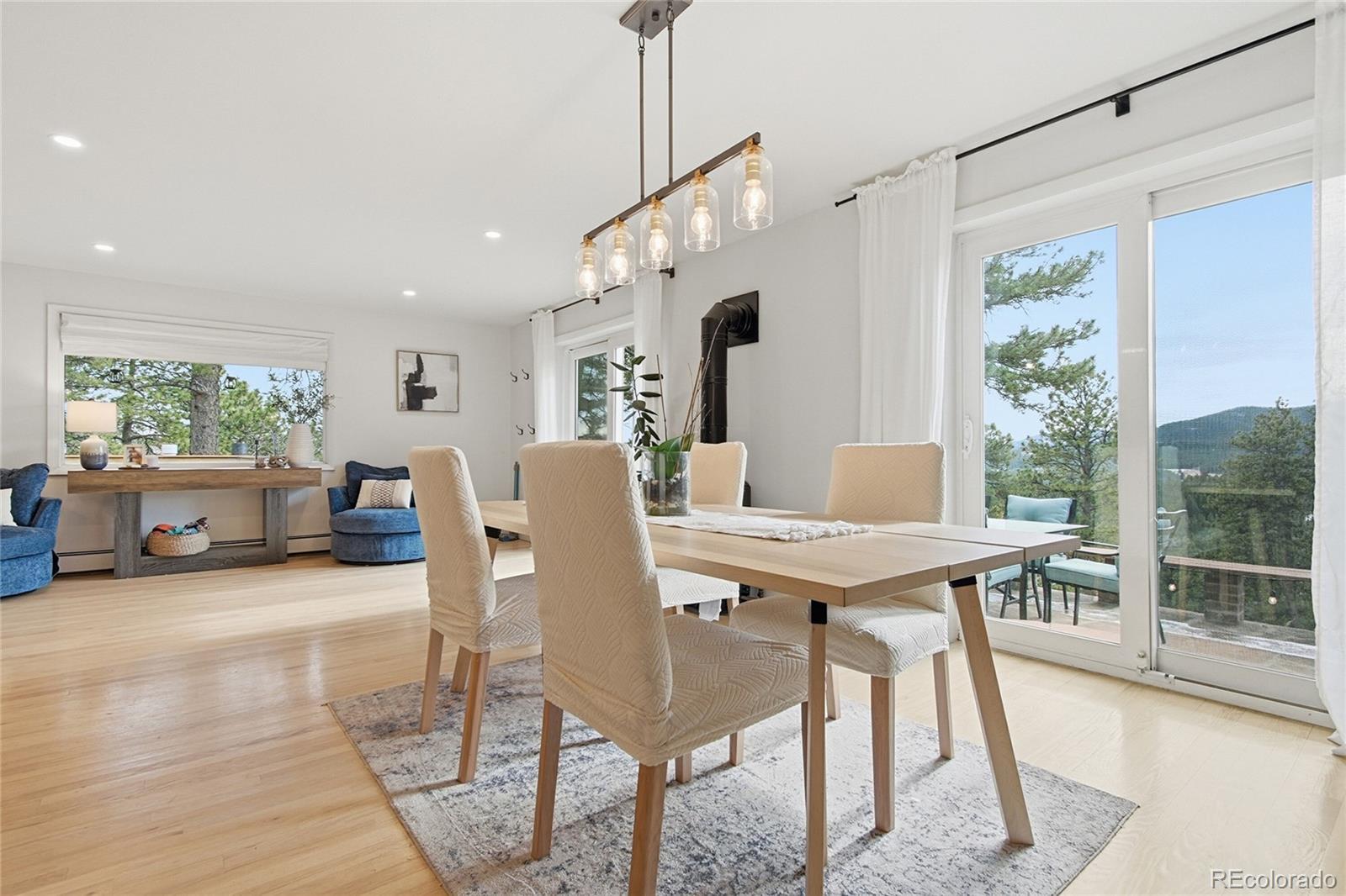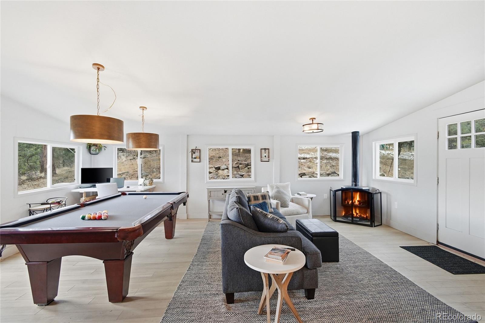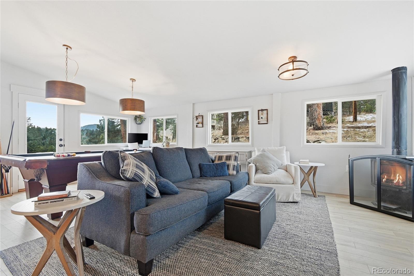 North Turkey Creek Road presents a beautifully renovated mountain retreat that seamlessly combines contemporary features with tranquil Colorado living. Nestled on over an acre of land, this tri-level home boasts breathtaking mountain views. The property includes a spacious 45 x 18 flagstone front patio deck with a wraparound bench and a hot tub for relaxation. Inside, you'll find brand-new windows throughout and hardwood floors on the main level connecting the open-concept kitchen, dining area, and family room with a gas fireplace. The modern kitchen is equipped with premium appliances, including a French door refrigerator, a five-burner all-gas stove, dishwasher, and trash compactor, complemented by new soft-close cabinets and drawers. There's an under-counter sink featuring a reverse osmosis water spigot. Downstairs, the living area showcases a full-wall brick fireplace that burns real wood, creating a cozy atmosphere on snowy days. The game room/living room features exposed wood beams, another gas fireplace, and generous windows framing the forested scenery. Additionally, the property comes with a separate building, perfect for use as a workshop or a home gym. Seller is leaving the Pool Table and Hot Tub - Gym equipment in outer shed is negotiable