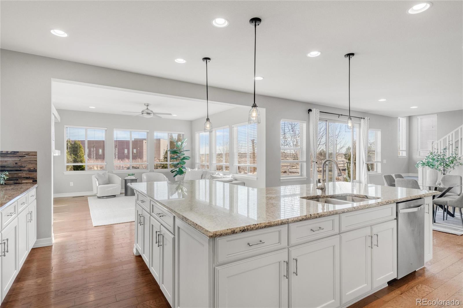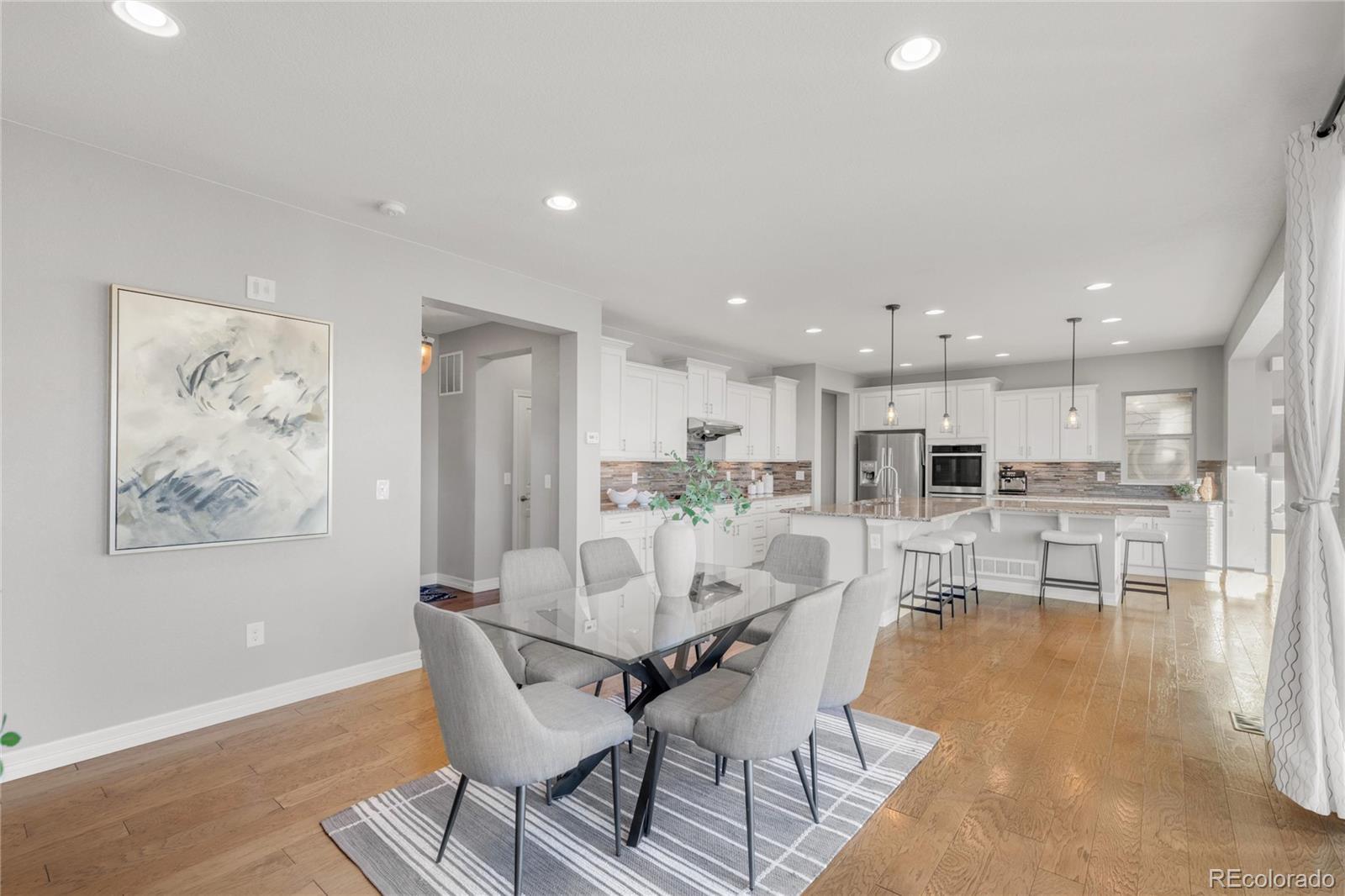 Discover 16554 Prospect Lane, a beautifully updated home in the highly sought-after Anthem Highlands community. Built in 2015, this newer-design home is filled with abundant natural light from its south- and west-facing windows. It sits on a premier lot with no neighbors behind, backing to open space with a walking trail just outside the backyard, where mountain views can be enjoyed. The property is within walking distance to the top-rated K–12 charter school, Prospect Ridge Academy. Inside, the kitchen has been tastefully upgraded with cream-white cabinetry, granite countertops, and a stone backsplash, offering timeless style and functionality. A unique angled kitchen island enhances the main-floor flow with generous counter space, seating, and ample storage. The family room, open to the kitchen, features six south- and west-facing windows, a cozy fireplace, and a thoughtfully designed TV space with double sliding doors. The main floor also includes a mudroom with built-in seating and storage, a private office at the entrance, and a sun-filled dining room overlooking the open space and trail. Upstairs, a spacious open loft offers flexible use as an office or retreat. The south-facing primary suite includes a luxurious five-piece bath and large walk-in closet. Two secondary bedrooms share a full bathroom with double vanity, and the laundry room is conveniently located on the second floor. The finished basement adds a large entertainment room, a bathroom with an oversized walk-in shower, two additional rooms, and a large storage area. The newly replaced carpet is ready for the new owner to enjoy. Anthem residents enjoy access to a private community center with a swimming pool, tennis courts, basketball courts, and a variety of recreational amenities—perfect for an active Colorado lifestyle. This home blends location, privacy, natural light, and thoughtful upgrades, making it a truly exceptional opportunity in Anthem Highlands.