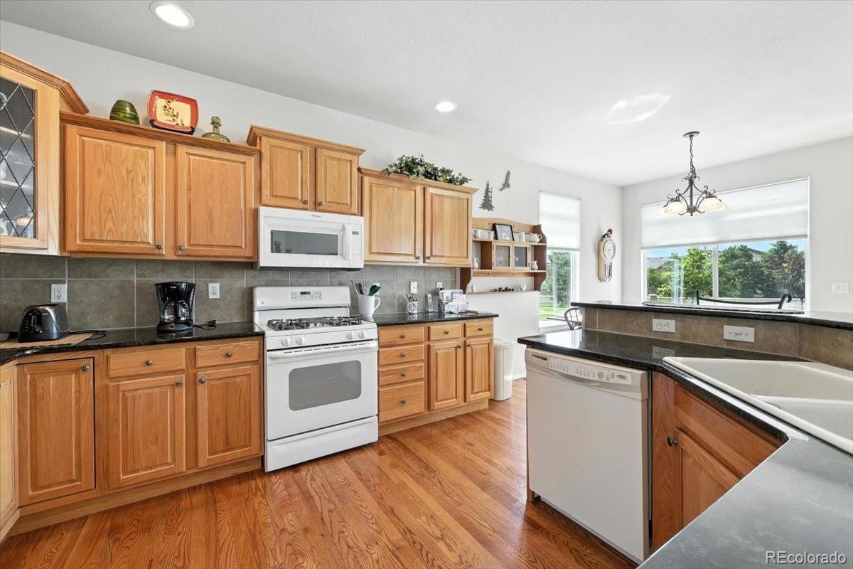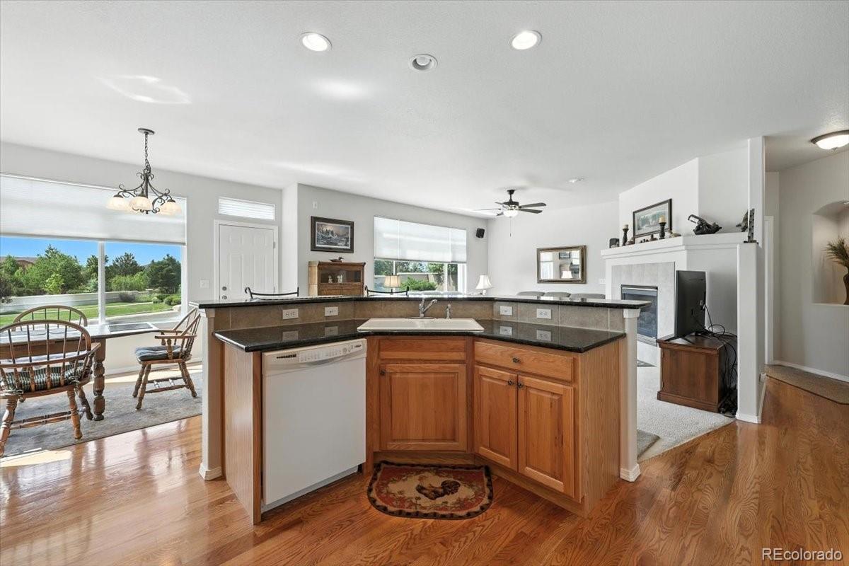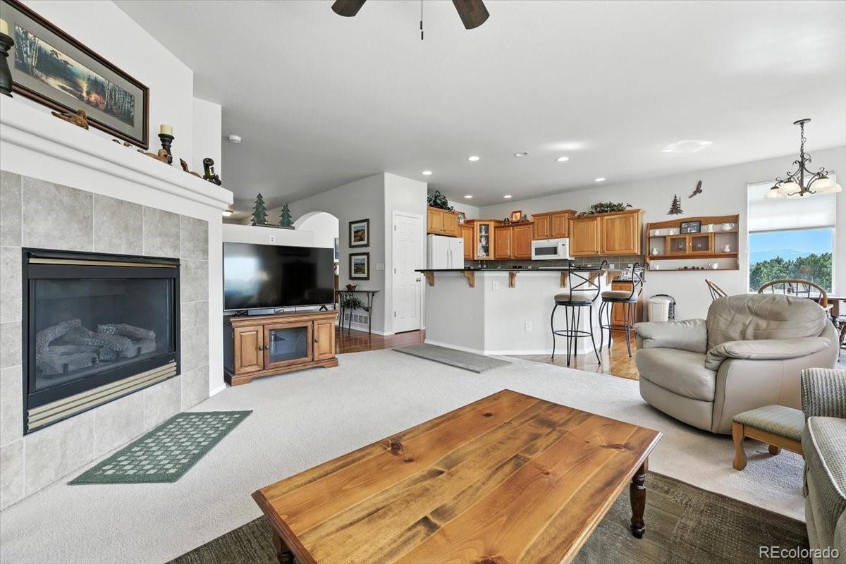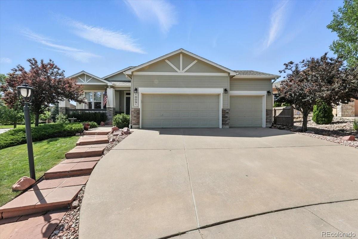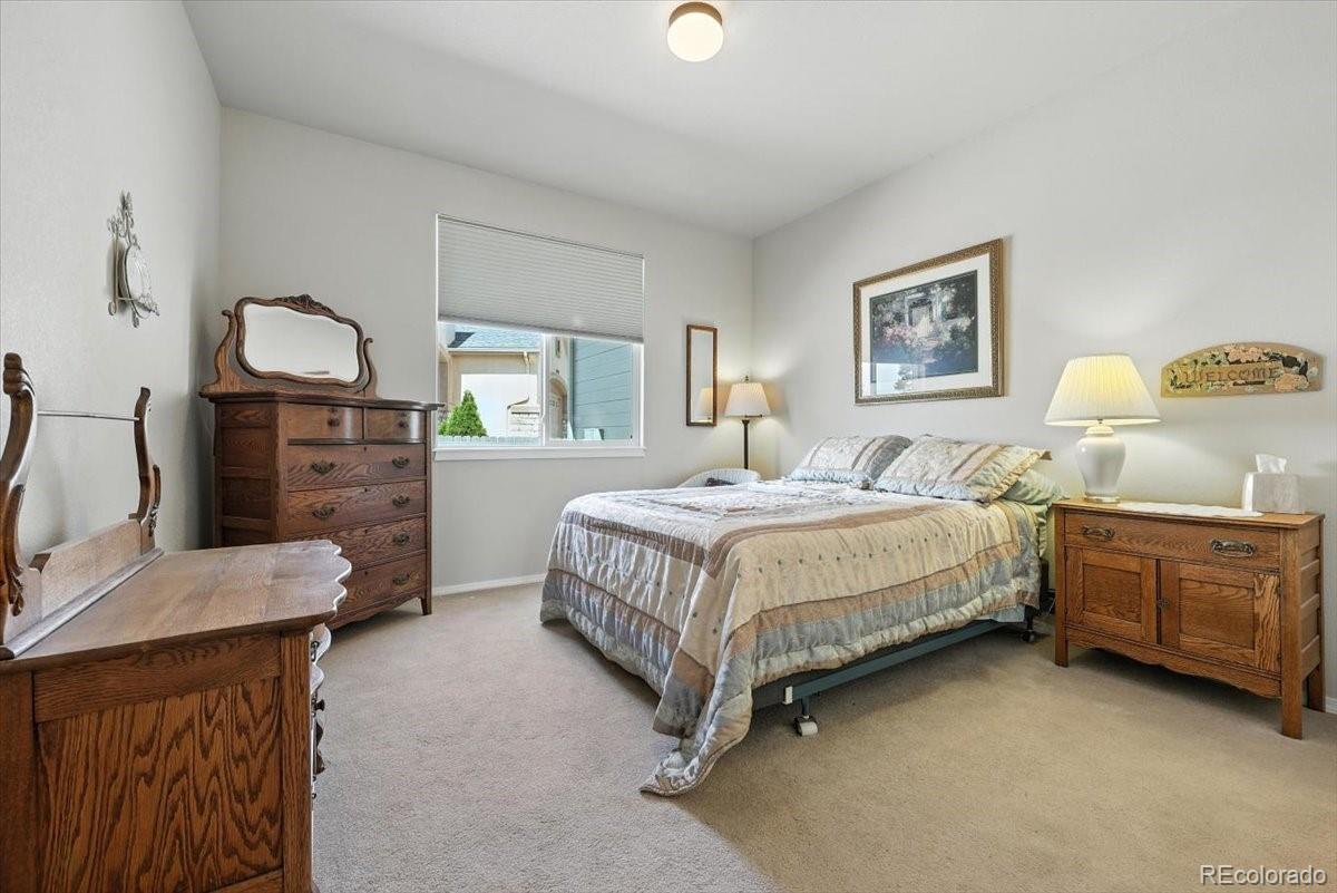 Welcome to this beautifully maintained 5-bedroom, 3-bath ranch-style home in the highly sought-after Pine Creek neighborhood. This spacious and light-filled home offers main-level living at its finest, with an open-concept floor plan, soaring ceilings, and large windows that fill the space with natural light. The gourmet kitchen features granite countertops, a center island, and ample cabinet space—perfect for both everyday living and entertaining. The main-level primary suite includes a spa-like bath with a soaking tub, separate shower, dual vanities, and a generous walk-in closet. The finished basement offers expansive additional living space with two bedrooms, a full bath, and a large family or rec room ideal for movie nights, a gym, or a home office. Enjoy Colorado evenings from your private back patio or landscaped yard with mountain views. Located in District 20 and close to trails, parks, shopping, and golf at Pine Creek Golf Club, this home combines comfort, convenience, and timeless style.