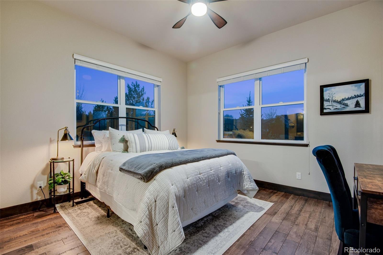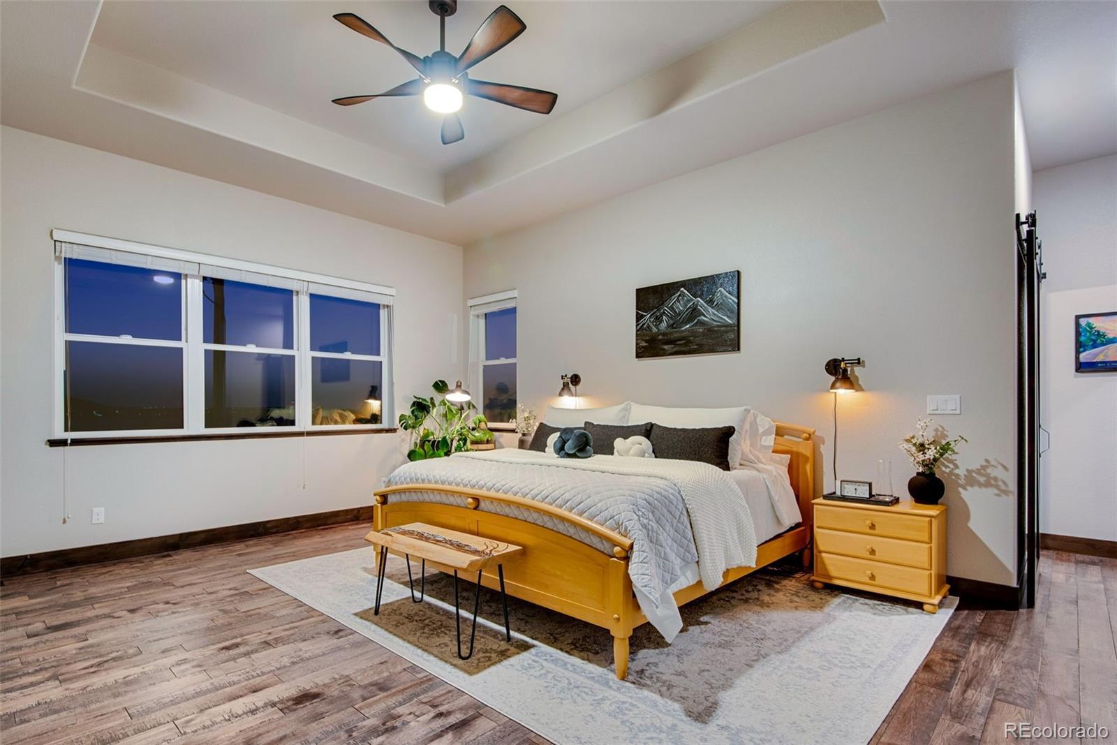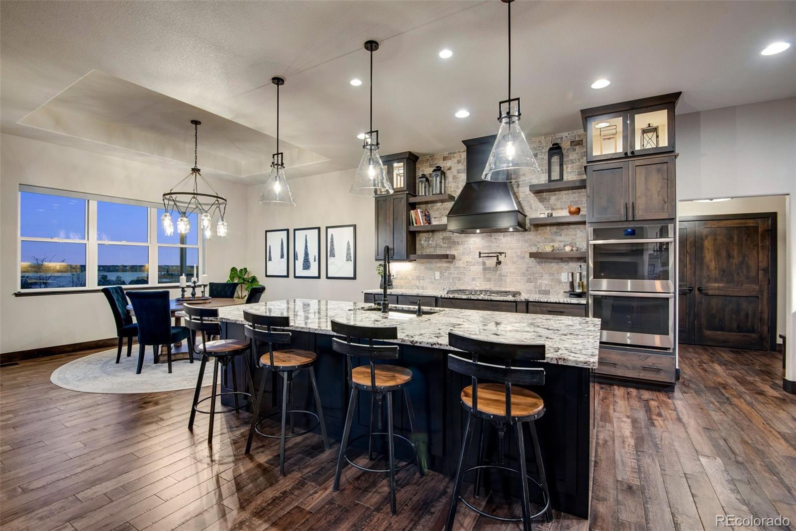 Open House Sat 21st and Sun 22nd, 12-3PM. Come see why Loveland, CO is frequently voted as one of the best places to live or retire in America. Known as the City of Love, Loveland is the gateway to Estes Park and Rocky Mountain National Park, and offers outstanding restaurants, entertainment, breweries, community festivities, trails, parks, and recreation. Incredible Boedecker Lake and Rocky Mountain views. This home offers luxury living at its finest and you can enjoy nature and wildlife from nearly every window. This custom-built ranch style property offers something for everyone with over 5,400 total square feet. 5 beds, 5 baths and an oversized 4 car finished garage with southern exposure for plenty of natural snow melt. The main floor features a split floor plan with an expansive primary bedroom taking the entire east wing. Both guest bedrooms are spacious and feature private baths and patio access. The gourmet kitchen features a walk-in pantry, stainless steel appliances, 5-burner gas range, double ovens, pot-filler, granite slab countertops and a center island with breakfast bar. Large dining area overlooks the open space and lake. The primary suite with retreat features a large walk-in closet plus a 5-piece luxury bath with oversized shower and freestanding clawfoot tub. The family room offers spectacular views, vaulted ceilings, and a gas fireplace with floor to ceiling stone. The walk-out basement features 9' ceilings, 2 additional bedrooms (one currently used as an office), media corner, billiard room, wet bar, and plenty of storage. The oversized covered and uncovered patio features Trex decking, iron railing, and landscape lights. Additional features include central A/C, 2 40-gallon water heaters, active radon system, wood-burning fire-pit with pergola, sprinkler and drip system, hardwood floors, high-end light fixtures, humidifier, and so much more. For a full list of features, floor plan, or to schedule a showing, please contact the listing brokers.