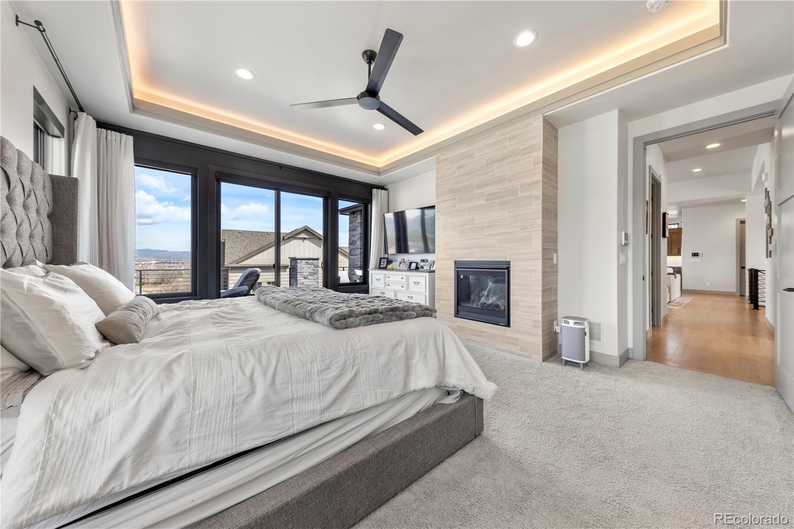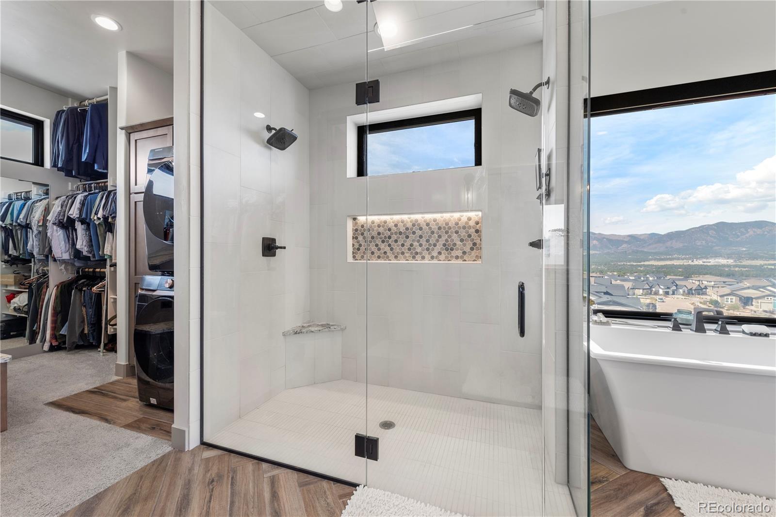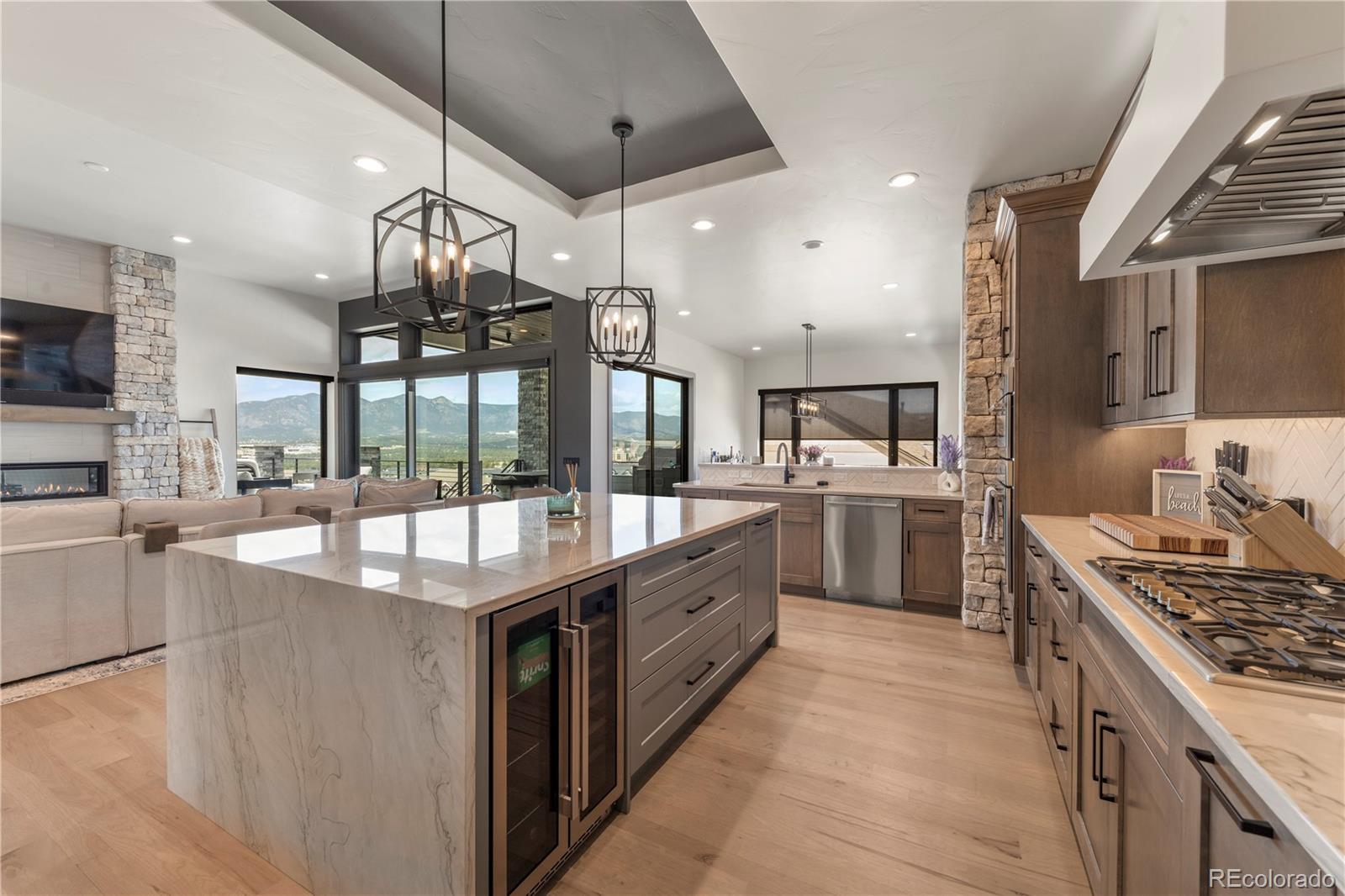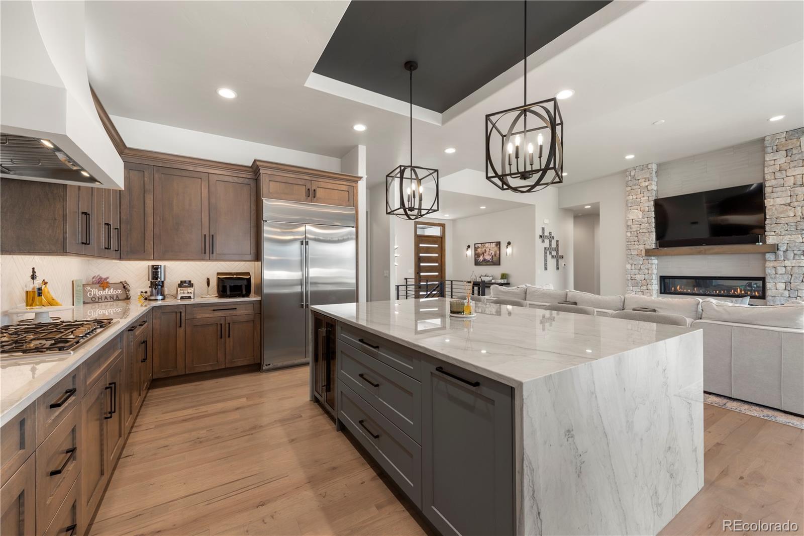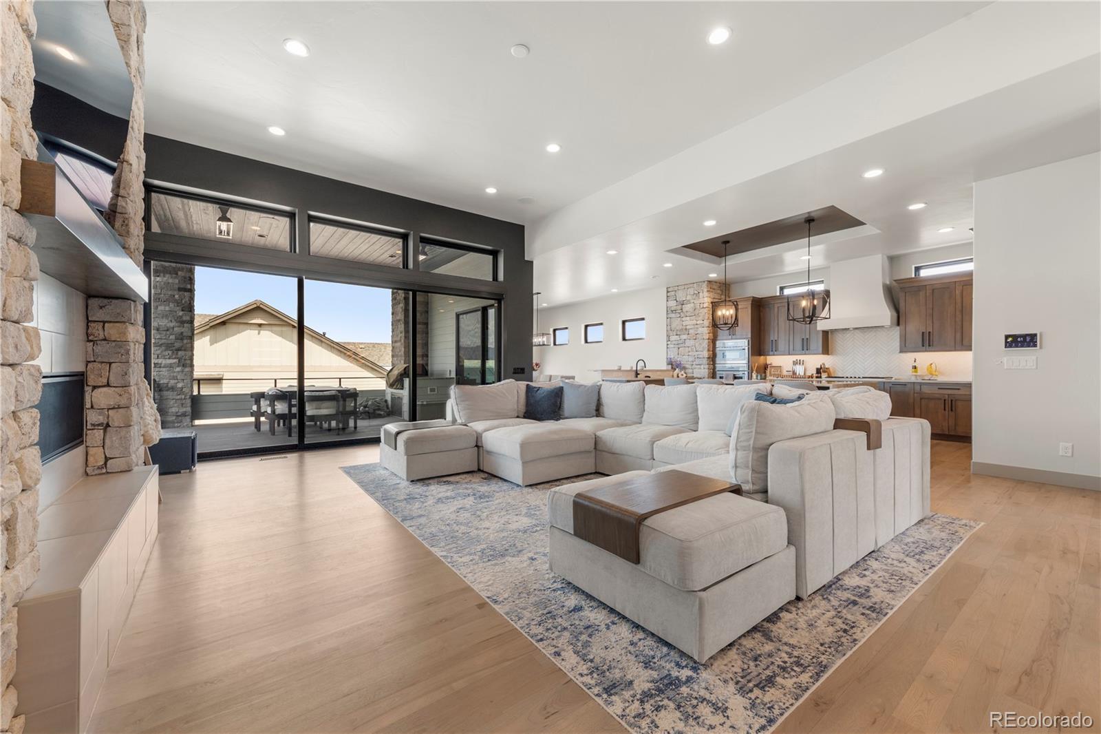 Stunning custom home in the coveted Julep Estates within The Farm Community featuring 5,304 finished square feet on a .44-acre lot with luxurious design, advanced systems, and exceptional indoor-outdoor living. This 5-bedroom, 4-bathroom residence includes wide-plank hardwood flooring, soaring vaulted ceilings in the great room, and a 15’ sliding glass door opening to a large covered deck and patio. The kitchen pulls out every stop to includes cherry cabinetry, a granite sink, all top of the line Bosch and Thermador appliances, double ovens, soft-close drawers, walk-in pantry, and 42” upper cabinets. The primary suite features a spa-style bathroom with steam shower, heated tile floors, hot tools drawer, and stackable laundry in the closet. The basement offers a full wet bar, dedicated gym, rec room, three bedrooms, sauna and a finished gym private flex room. The home includes a $60K+ Control4 smart system: whole-home audio, Triad speakers, motorized Lutron shades, video doorbell, surveillance, and integrated lighting and climate control. Additional features include a dog wash station, custom mudroom with lockers, and built-in bottle filler. The heated 3+ car garage spans 1,200 sq ft with an EV charger and adjacent 210 sq ft workshop. Exterior amenities include professional landscaping, composite decking covered and uncovered with 2 built in heaters, a built in gas firepit, hot tub pad, and direct access to community trails. Located in Academy District 20, the home also includes extensive smart prewiring, R-49 insulation in vaulted ceilings, and upgraded finishes throughout. Built for energy efficiency, comfort, and seamless living, this home delivers exceptional quality and functionality. When it comes to luxury-its the little things throughout every aspect of the home that makes the difference.