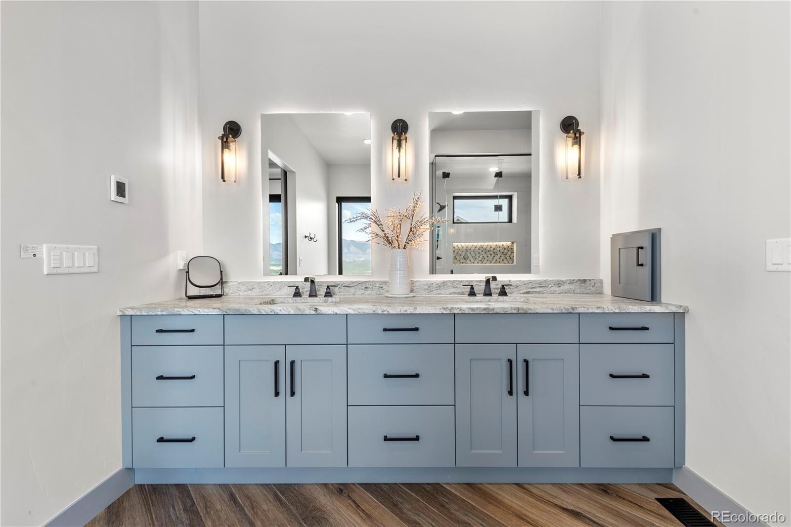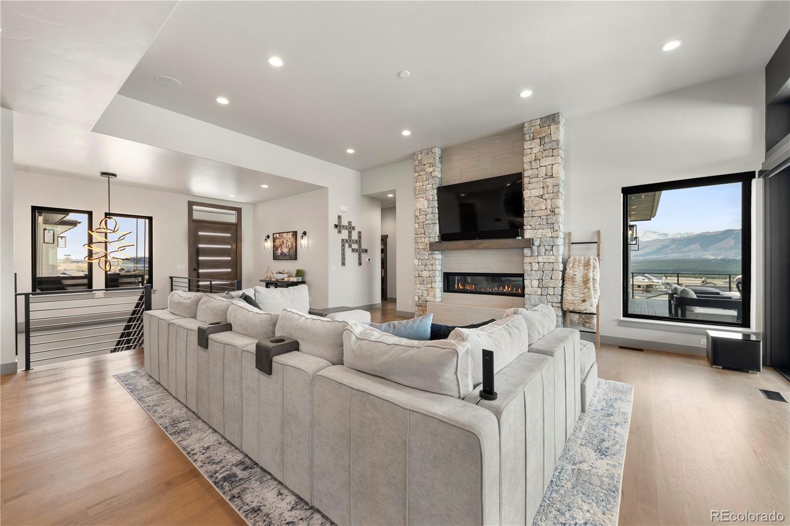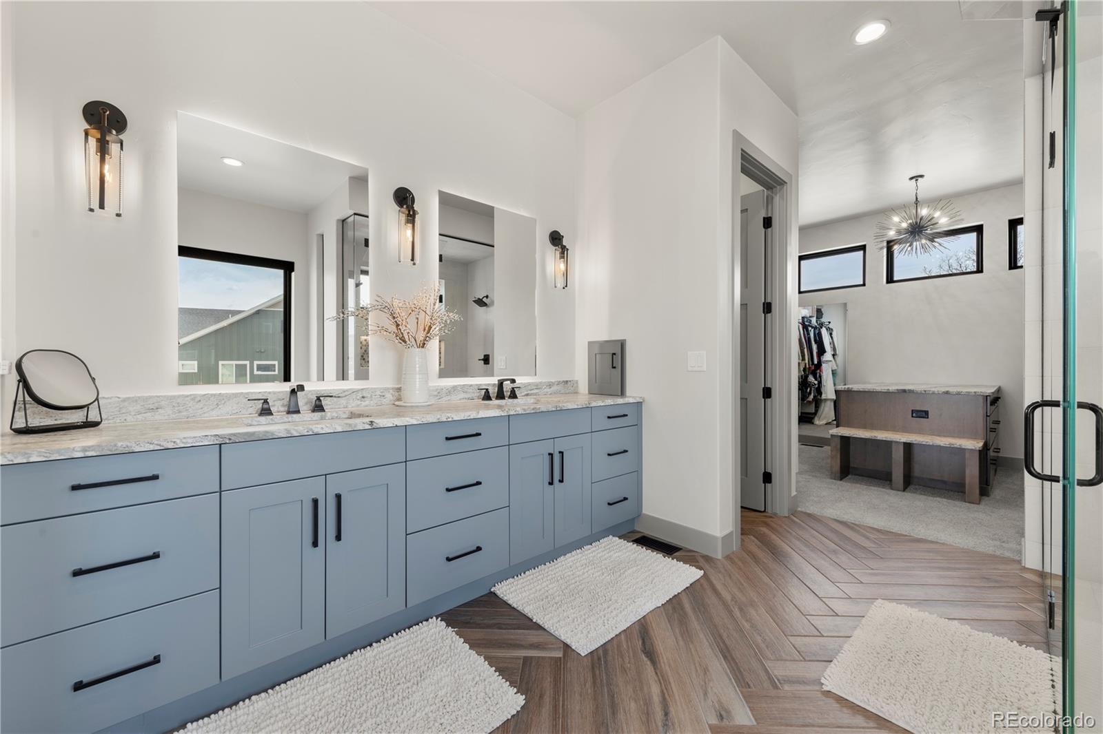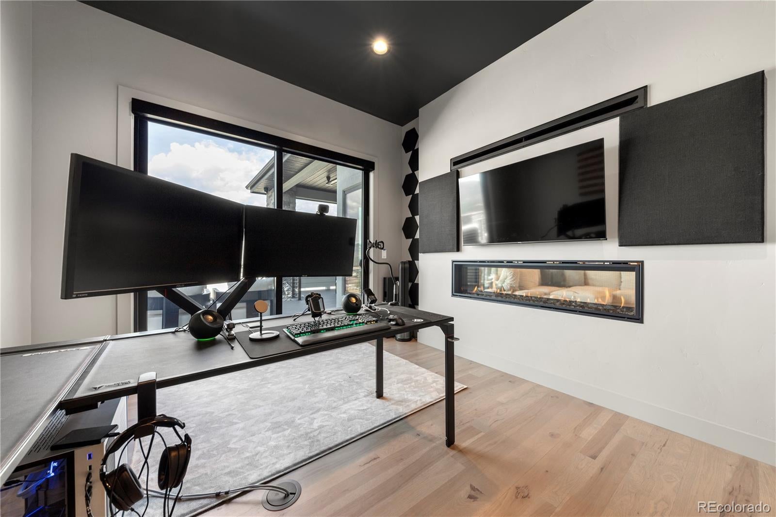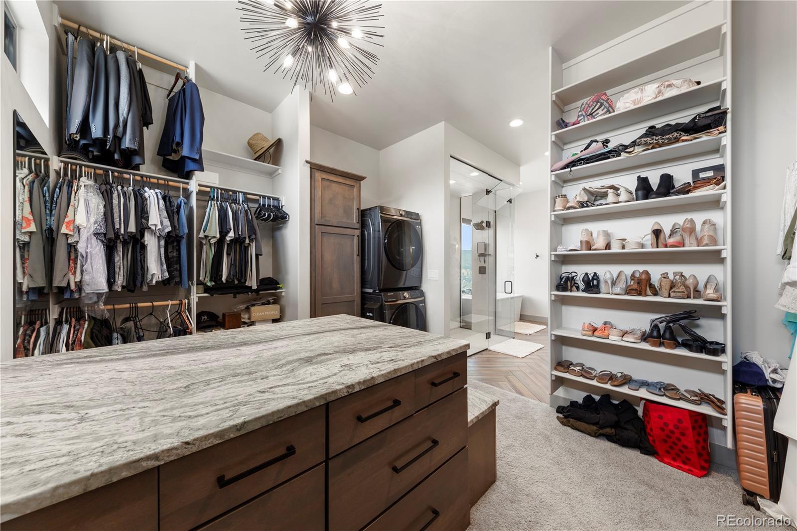 Stunning custom home in the coveted Julep Estates within The Farm Community featuring 5,304 finished square feet on a .44-acre lot with luxurious design, advanced systems, and exceptional indoor-outdoor living. This 5-bedroom, 4-bathroom residence includes wide-plank hardwood flooring, soaring vaulted ceilings in the great room, and a 15’ sliding glass door opening to a large covered deck and patio. The kitchen pulls out every stop to includes cherry cabinetry, a granite sink, all top of the line Bosch and Thermador appliances, double ovens, soft-close drawers, walk-in pantry, and 42” upper cabinets. The primary suite features a spa-style bathroom with steam shower, heated tile floors, hot tools drawer, and stackable laundry in the closet. The basement offers a full wet bar, dedicated gym, rec room, three bedrooms, sauna and a finished gym private flex room. The home includes a $60K+ Control4 smart system: whole-home audio, Triad speakers, motorized Lutron shades, video doorbell, surveillance, and integrated lighting and climate control. Additional features include a dog wash station, custom mudroom with lockers, and built-in bottle filler. The heated 3+ car garage spans 1,200 sq ft with an EV charger and adjacent 210 sq ft workshop. Exterior amenities include professional landscaping, composite decking covered and uncovered with 2 built in heaters, a built in gas firepit, hot tub pad, and direct access to community trails. Located in Academy District 20, the home also includes extensive smart prewiring, R-49 insulation in vaulted ceilings, and upgraded finishes throughout. Built for energy efficiency, comfort, and seamless living, this home delivers exceptional quality and functionality. When it comes to luxury-its the little things throughout every aspect of the home that makes the difference.