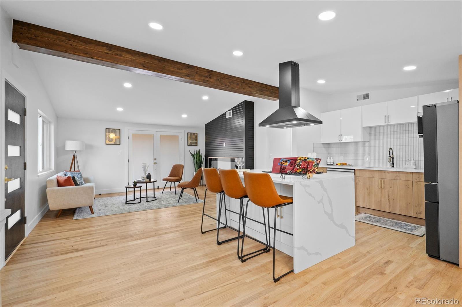 Welcome to a beautifully reimagined mid-century modern ranch in the highly sought-after Gunbarrel Estates. Thoughtfully remodeled, this one-of-a-kind residence blends timeless design with contemporary sophistication. Vaulted ceilings and rich wood flooring create an airy, refined atmosphere, while the new electric fireplace adds a striking focal point to the living space. The show-stopping kitchen is both stylish and functional, featuring sleek custom cabinetry, brand-new stainless appliances, quartz countertops, a generous center island, and a designer tile backsplash—perfect for everyday living and effortless entertaining.The bathrooms have been elegantly updated with modern finishes and tiled shower surrounds. The primary suite offers a spa-like retreat with a walk-in shower and dual-sink vanity.Additional highlights include a spacious garage with a dedicated workbench, along with brand-new concrete in both the garage and driveway. Outdoor living is exceptional with two patios: one conveniently located off the living room and a generous 14’ x 25’ covered patio near the garage—ideal for hosting gatherings year-round. A 14’ x 4’ storage area off the covered patio and an additional 10’ x 10’ shed provide ample storage. The beautifully landscaped backyard features a dedicated garden area, enhancing the home’s connection to nature. Ideally located just a short walk from Gunbarrel Estates Park and nearby trails, this home also offers easy access to a variety of dining, shopping, and lifestyle amenities. A rare opportunity to own a refined mid-century modern home in one of Longmont’s most desirable neighborhoods.