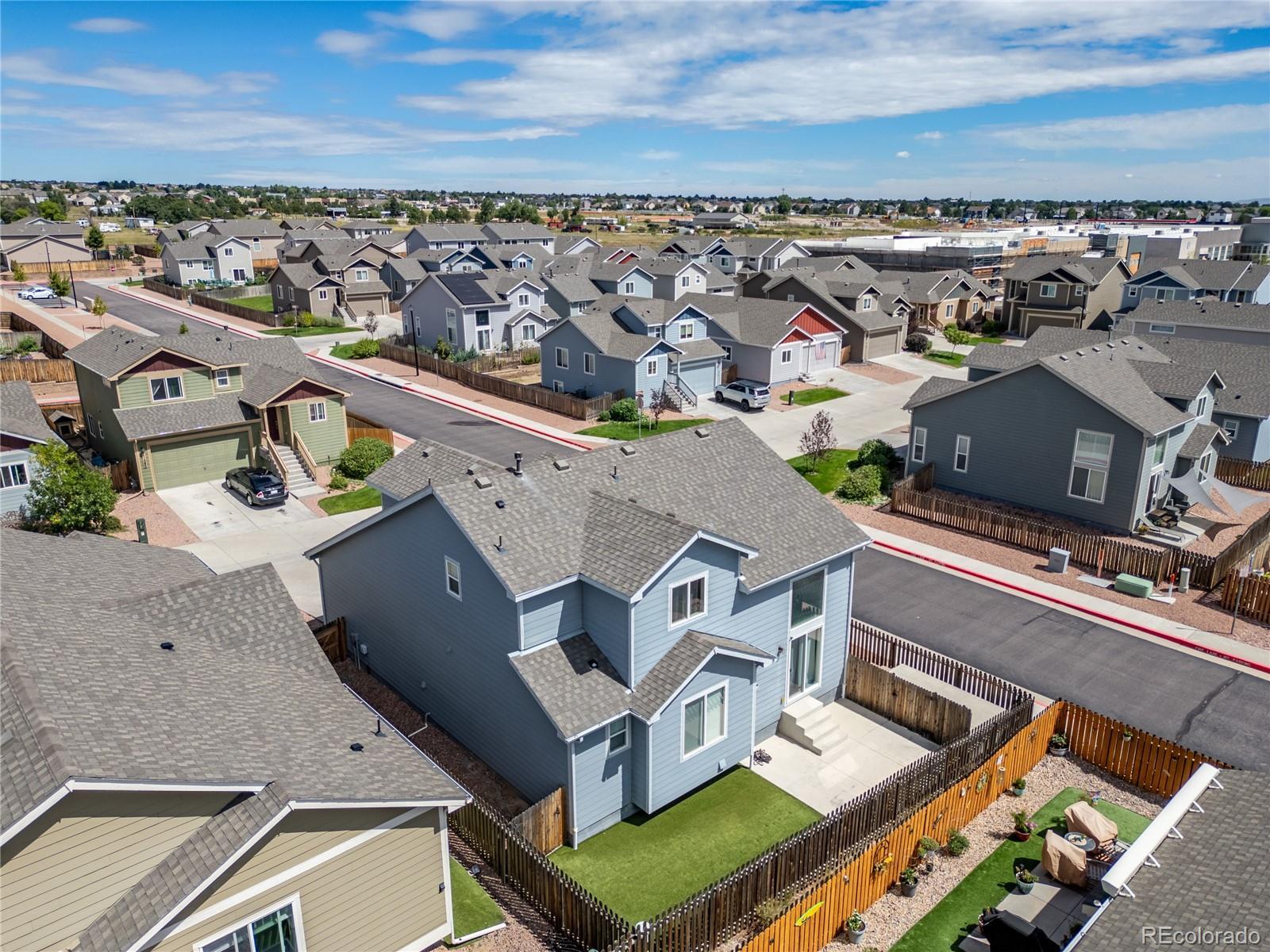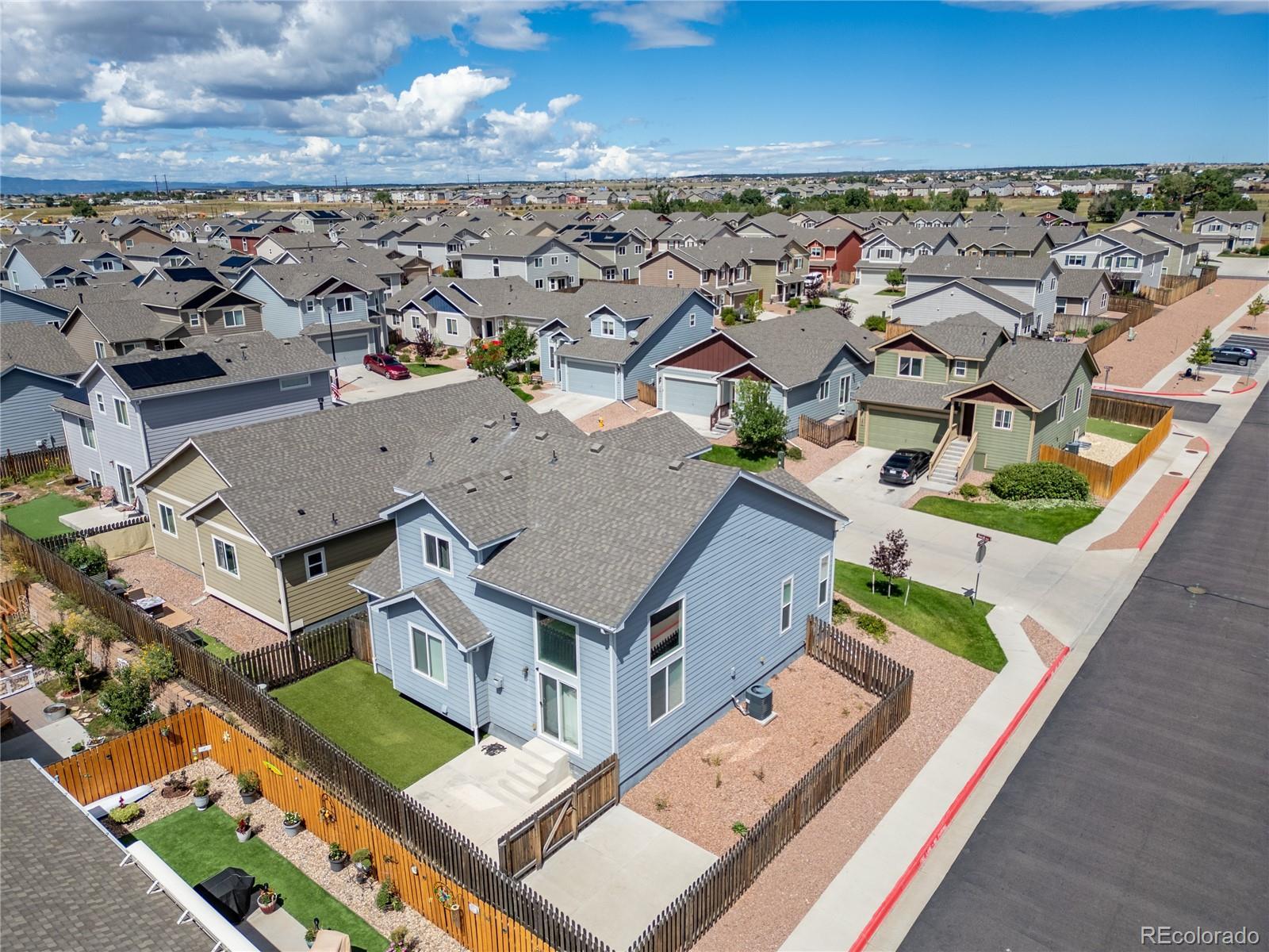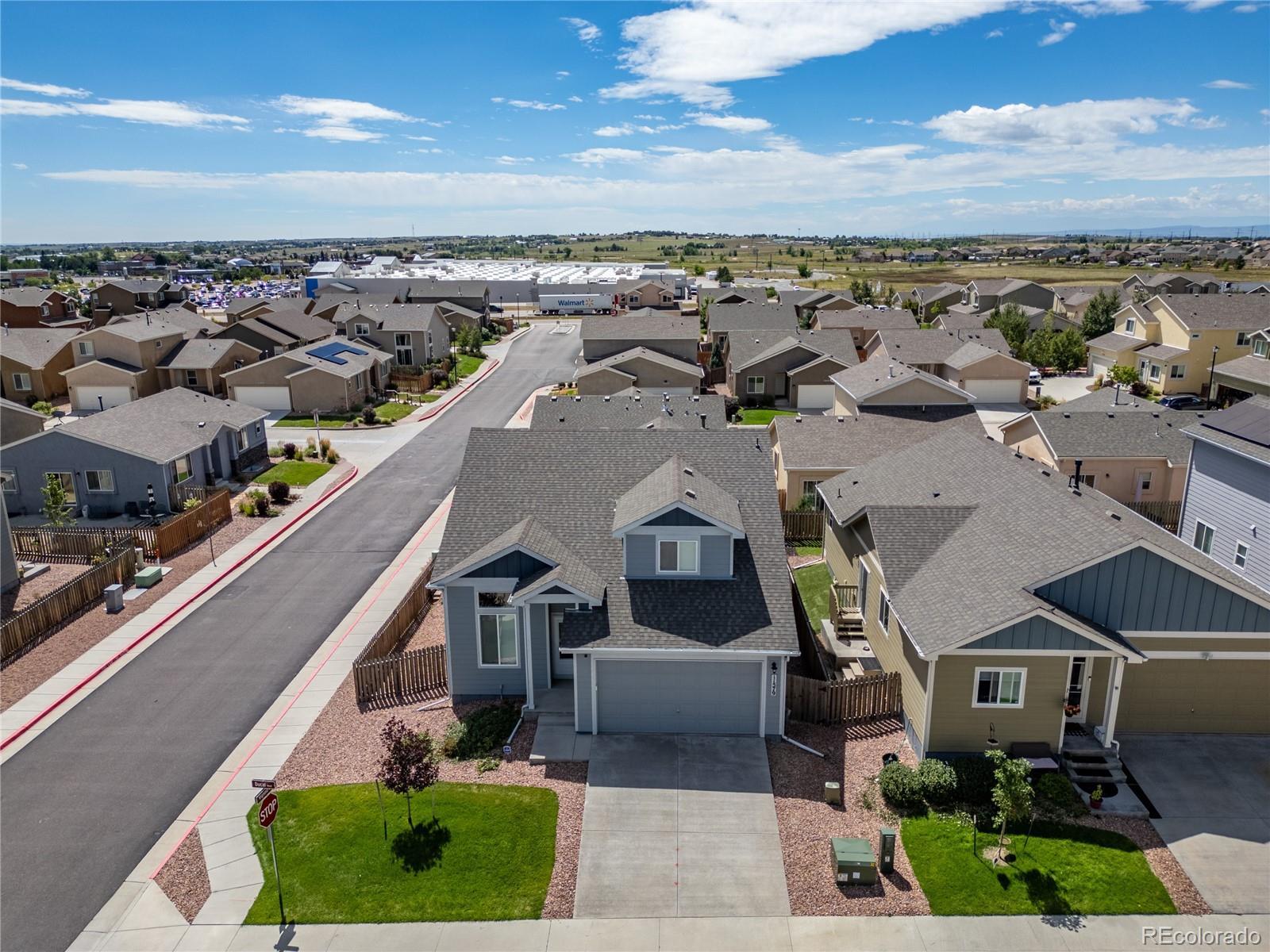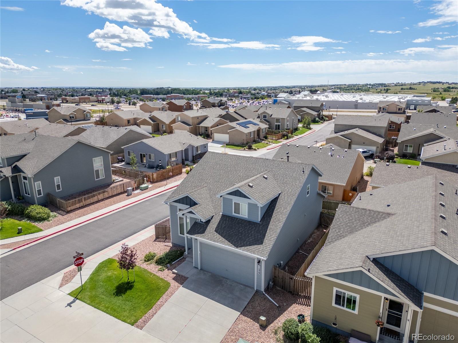 A beautifully maintained 3-bedroom, 3-bath home tucked into the heart of the sought-after Courtyards at Woodmen Hills community. This light-filled home combines modern design with everyday comfort — offering an open floor plan, soaring vaulted ceilings, and large picture windows that flood the interior with natural light. Step inside to discover a bright, spacious living room with a cozy gas fireplace and luxury plank flooring throughout the main level. The kitchen is a showstopper, featuring white cabinetry, sleek stainless-steel appliances, marble-style countertops, and an oversized island with bar seating — perfect for entertaining or enjoying your morning coffee. The main-level primary suite offers a peaceful retreat with a private bath and dual sinks, while upstairs, two additional bedrooms and a full bath provide space for family, guests, or a home office. Outside, enjoy your fenced backyard with a low-maintenance landscape — ideal for relaxing weekends or playtime with pets. Located just minutes from Falcon Marketplace, Antler Creek Golf Course, and top-rated schools, this home offers the best of convenience and community living. Residents enjoy access to Woodmen Hills’ resort-style amenities including fitness centers, pools, parks, and walking trails. With its stylish finishes, open design, and unbeatable location, this home is move-in ready and waiting for you.