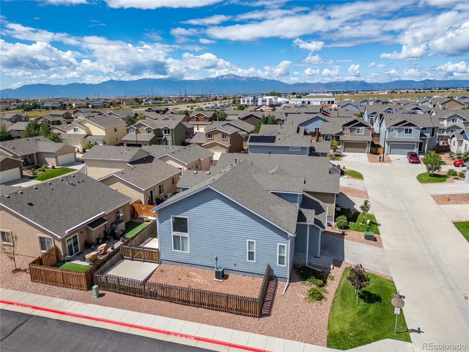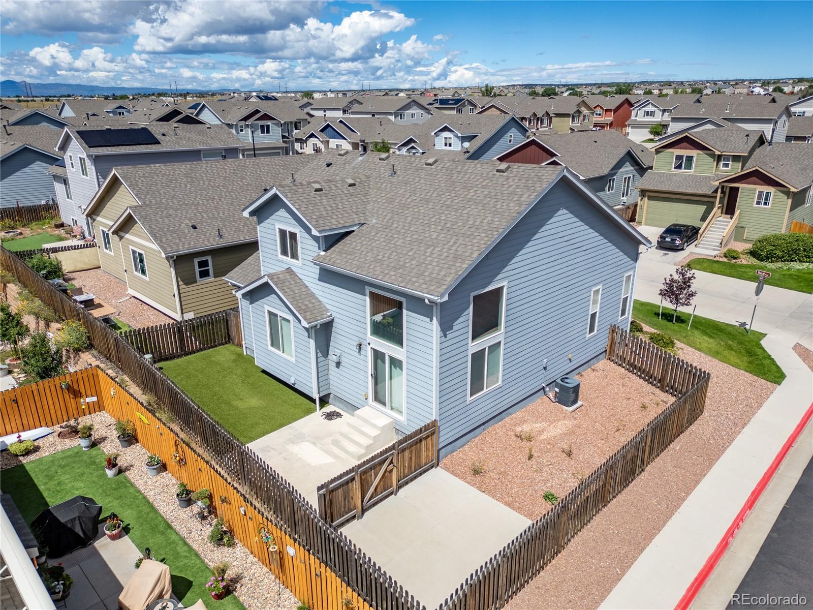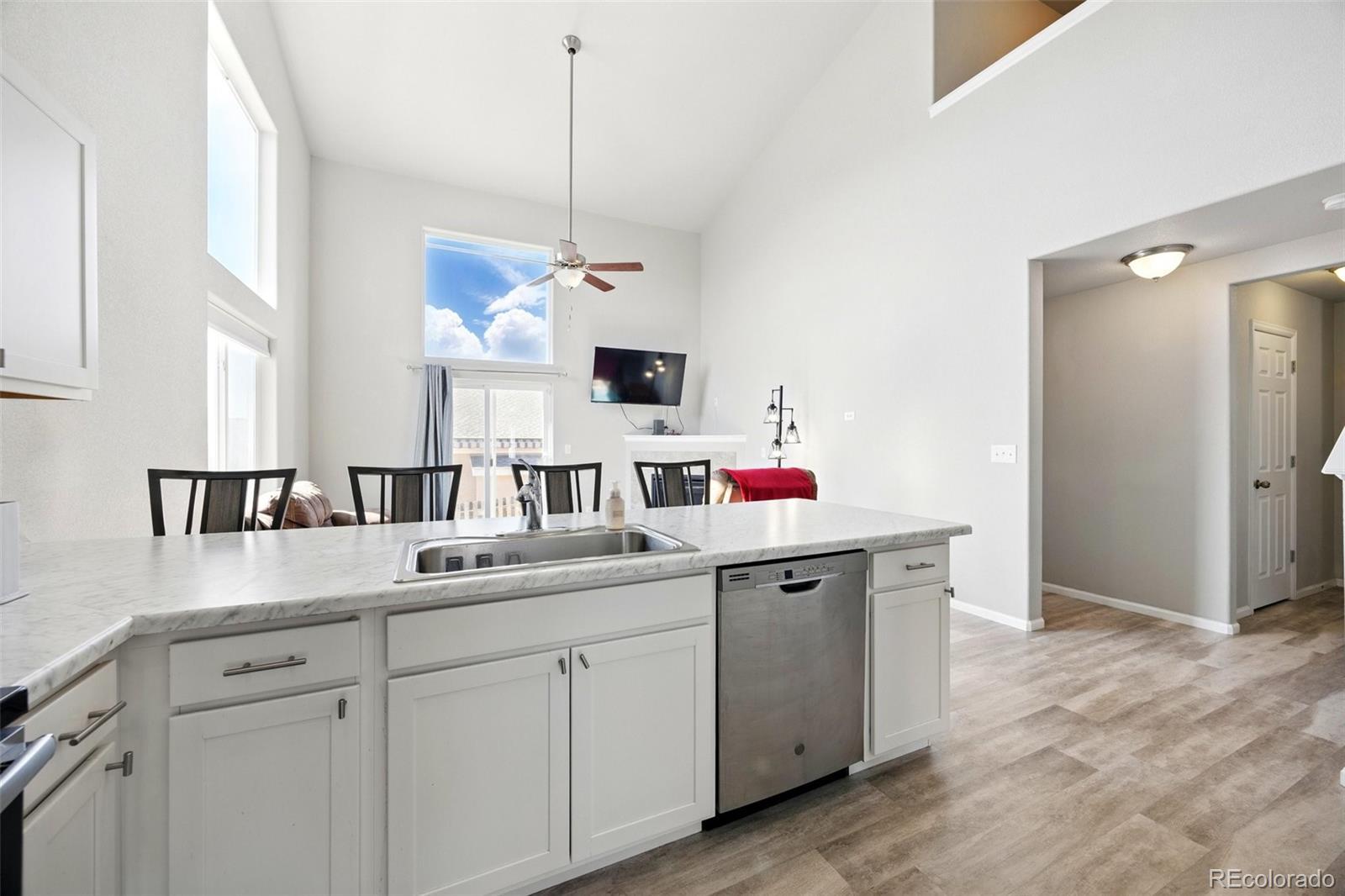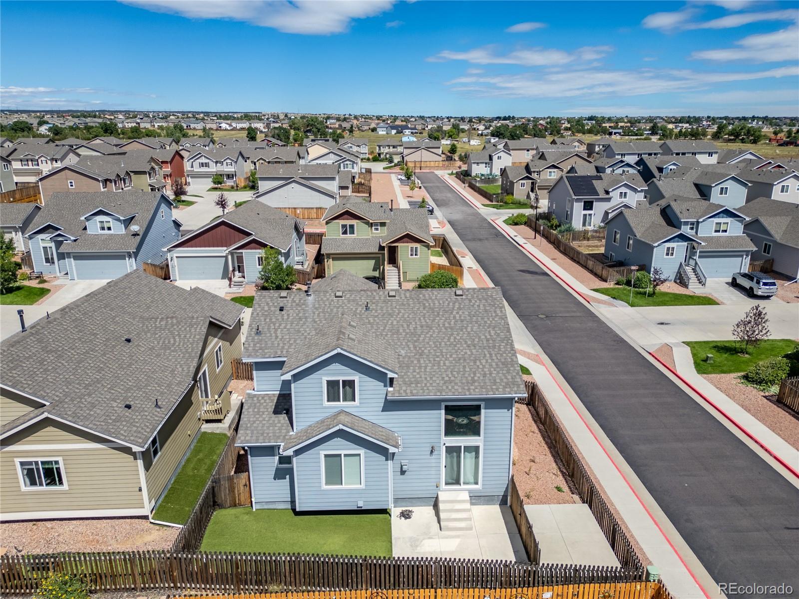 A beautifully maintained 3-bedroom, 3-bath home tucked into the heart of the sought-after Courtyards at Woodmen Hills community. This light-filled home combines modern design with everyday comfort — offering an open floor plan, soaring vaulted ceilings, and large picture windows that flood the interior with natural light. Step inside to discover a bright, spacious living room with a cozy gas fireplace and luxury plank flooring throughout the main level. The kitchen is a showstopper, featuring white cabinetry, sleek stainless-steel appliances, marble-style countertops, and an oversized island with bar seating — perfect for entertaining or enjoying your morning coffee. The main-level primary suite offers a peaceful retreat with a private bath and dual sinks, while upstairs, two additional bedrooms and a full bath provide space for family, guests, or a home office. Outside, enjoy your fenced backyard with a low-maintenance landscape — ideal for relaxing weekends or playtime with pets. Located just minutes from Falcon Marketplace, Antler Creek Golf Course, and top-rated schools, this home offers the best of convenience and community living. Residents enjoy access to Woodmen Hills’ resort-style amenities including fitness centers, pools, parks, and walking trails. With its stylish finishes, open design, and unbeatable location, this home is move-in ready and waiting for you.