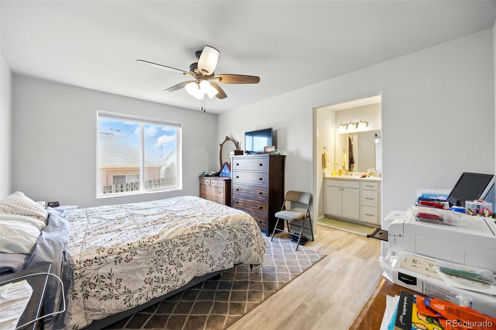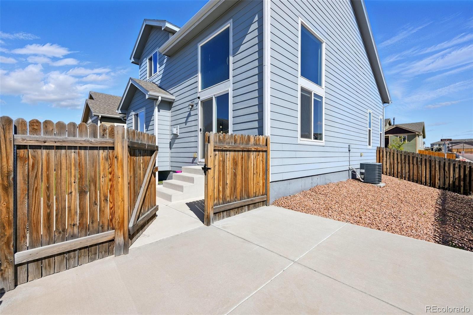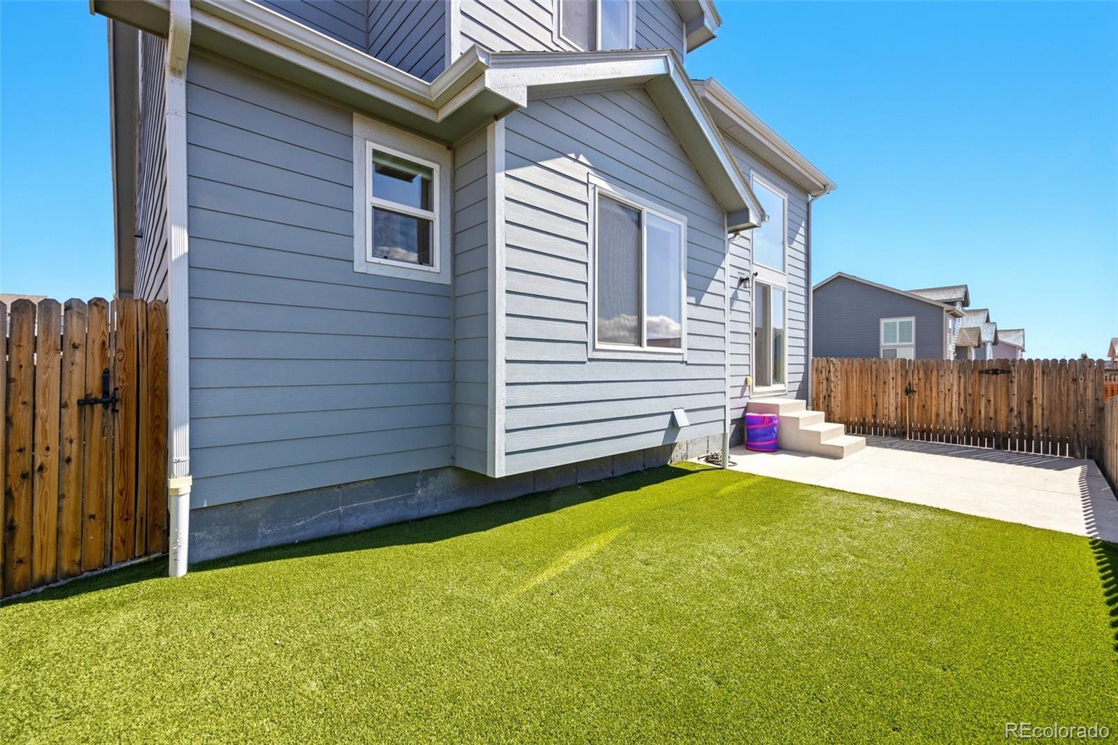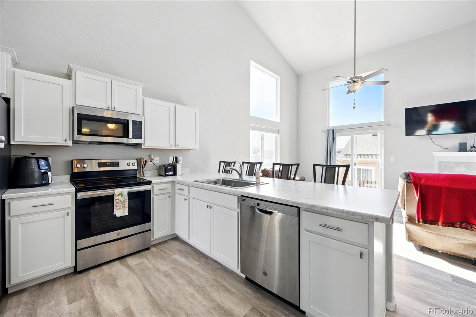 A beautifully maintained 3-bedroom, 3-bath home tucked into the heart of the sought-after Courtyards at Woodmen Hills community. This light-filled home combines modern design with everyday comfort — offering an open floor plan, soaring vaulted ceilings, and large picture windows that flood the interior with natural light. Step inside to discover a bright, spacious living room with a cozy gas fireplace and luxury plank flooring throughout the main level. The kitchen is a showstopper, featuring white cabinetry, sleek stainless-steel appliances, marble-style countertops, and an oversized island with bar seating — perfect for entertaining or enjoying your morning coffee. The main-level primary suite offers a peaceful retreat with a private bath and dual sinks, while upstairs, two additional bedrooms and a full bath provide space for family, guests, or a home office. Outside, enjoy your fenced backyard with a low-maintenance landscape — ideal for relaxing weekends or playtime with pets. Located just minutes from Falcon Marketplace, Antler Creek Golf Course, and top-rated schools, this home offers the best of convenience and community living. Residents enjoy access to Woodmen Hills’ resort-style amenities including fitness centers, pools, parks, and walking trails. With its stylish finishes, open design, and unbeatable location, this home is move-in ready and waiting for you.