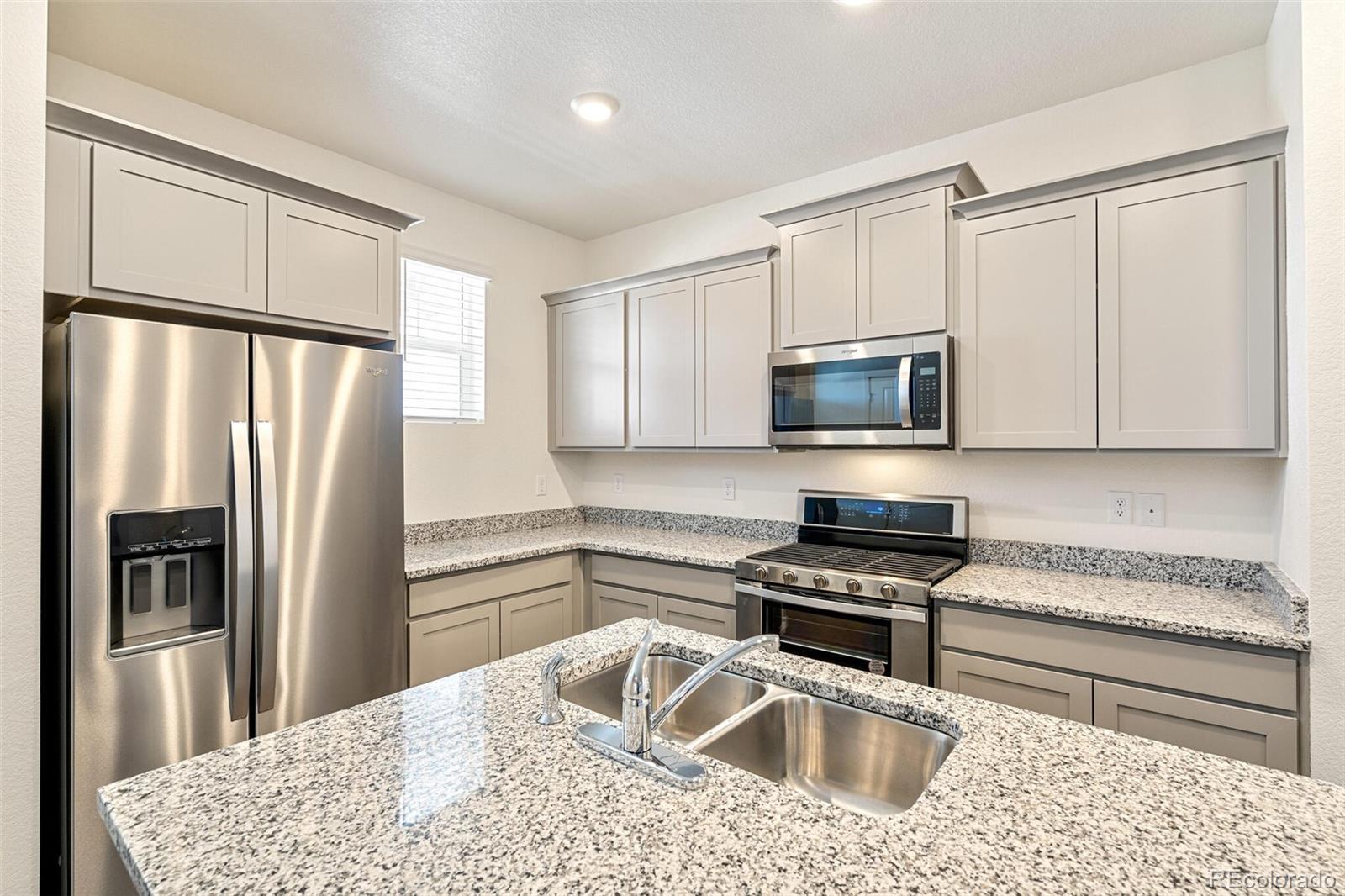 Indulge in the elegance of this low-maintenance home at Settlers Crossing! The Muirfield floor plan, close to area conveniences, offers 3 bedrooms, 2 1/2 bathrooms and a spacious 2nd-level living area. The open-concept kitchen showcases quartz countertops, shaker-style cabinets, large island, and Stainless Steel Whirlpool appliances. The primary bedroom is generously sized and connects to an ensuite bathroom with quartz countertops, and a large walk-in closet. This Smart Home is equipped with keyless entry, a video doorbell, smart thermostat, Wi-Fi garage door opener, Amazon Echo Pop, and a wall-mounted touch screen panel. Enjoy Deako plug-and-play light switches and a tankless water heater. Conveniently located near major highways, this home is less than 15 minutes from Denver International Airport. ***Estimated Delivery Date: January. Photos are representative and not of actual property***