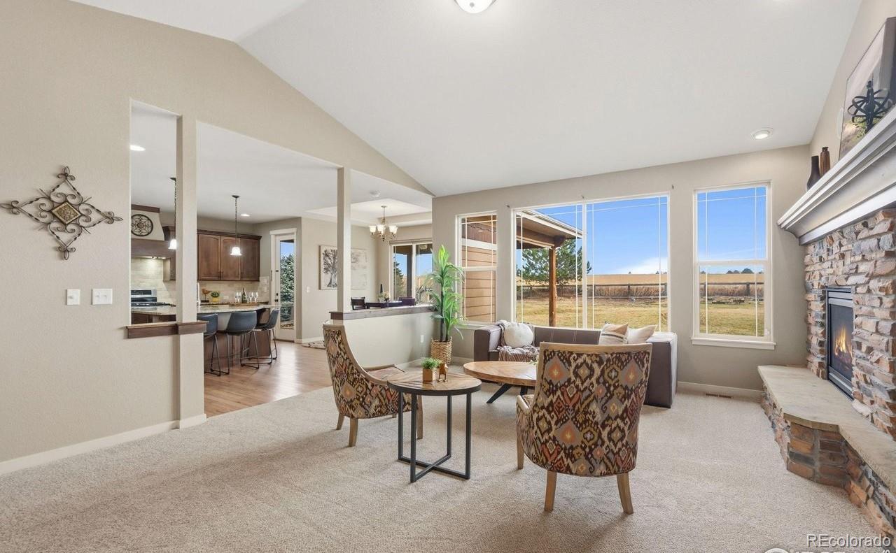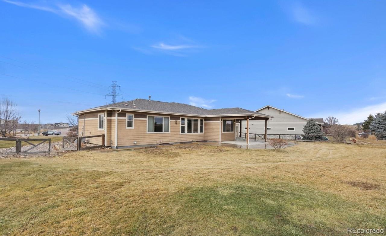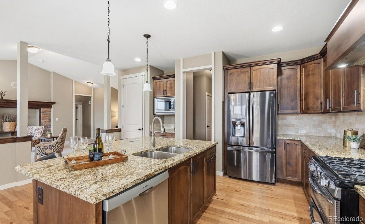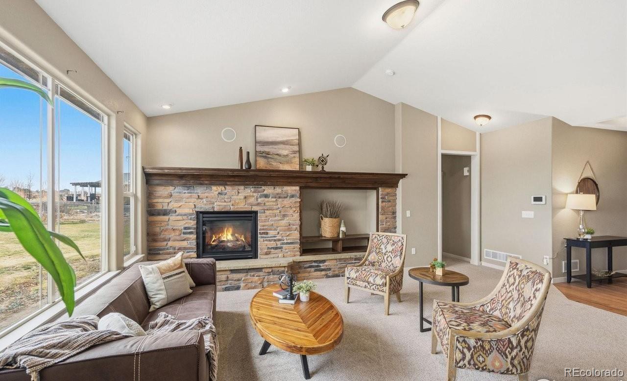 Welcome home within Poudre River Ranch, near the Poudre River Trail. Enjoy the comfort of this 5-bedroom ranch with a finished basement and large garage. From the moment you walk in, you'll love the open feel of the large living room with vaulted ceilings, a cozy gas fireplace, and large windows that allow you to enjoy the morning sunshine and backyard view. The kitchen is made for everyday living and easy entertaining with a large island with seating area, stainless steel appliances including a refrigerator, gas range, dishwasher & microwave. Granite countertops, tile backsplash, pantry, and plenty of cabinet space with 42" uppers with crown molding. Hardwood floors extend through the kitchen and dining area that has views through the back window. Kitchen, Dining and Living rooms operate like a great room, being easy to entertain in,with lots of light, and to be together or in separate groups. Enjoy outdoor living with a covered front porch plus an expanded back patio-great for BBQs, relaxing, and hosting friends. Utilize the oversized, finished heated 4+ car garage-perfect for cars, toys, tools, or extra storage. Step inside through a practical mudroom-style entry with bench, closet and quick access to the laundry room with sink, or bringing in groceries from the garage. The primary suite offers a private retreat with a 5-piece bath, double shower heads, and a spacious walk-in closet. Two more bedrooms and a full bath complete the main level. Downstairs, the finished basement adds even more room to spread out with a theater area, game space, and family room, along with a bar with a refrigerator and dishwasher-perfect for movie nights and game area. Jack-and-Jill bath has access to two bedrooms and family room, with separate sinks for extra convenience. Extras include central A/C, unfinished storage, and a fenced backyard ready for play or pets. A great opportunity to move to a fantastic neighborhood close to trails and nature.