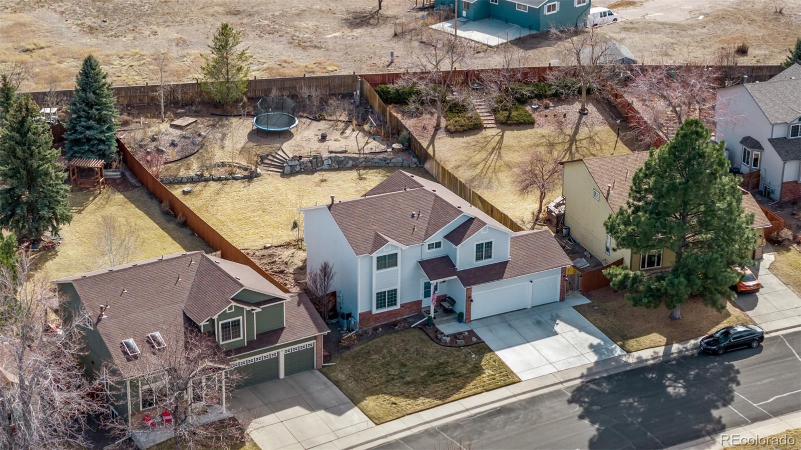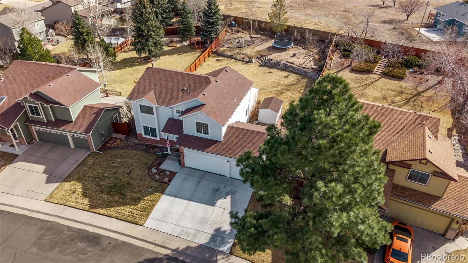 Welcome to this beautifully updated 4-bedroom home tucked away on a quiet cul-de-sac in Founders Village. From the brand-new driveway and insulated 3-car garage doors with quiet LiftMaster motors to the covered front porch and updated exterior lighting, the curb appeal immediately stands out. Inside, this home has been extensively remodeled with new flooring, fresh professional paint, new trim and doors, updated hardware, custom stair railings, and modern dimmable lighting throughout. The open main level flows seamlessly between the living, dining, and family rooms, creating an ideal layout for everyday living and entertaining. The stunning kitchen features designer blue cabinetry, white countertops, new stainless steel appliances, gas range, updated fixtures, and a new sliding glass door leading to the backyard. Upstairs, the spacious primary suite includes barn doors, custom closet organization, and a beautifully updated bath with new vanity, shower doors, heated anti-fog mirrors, and modern fixtures. Three additional bedrooms, full bath, and upper laundry complete the level. The finished basement offers flexible living space with a kitchenette and ¾ bath—perfect for guests or future 5th bedroom potential. Major upgrades include new windows, furnace, A/C, water heater, attic insulation, and sprinkler system. The private backyard features a new fence, covered patio with gas hookup, storage shed, and professionally installed Gemstone smart lighting. Walking distance to parks, pool, school, and grocery. Just minutes to Castle Rock Rec Center. Move-in ready and truly turn-key.