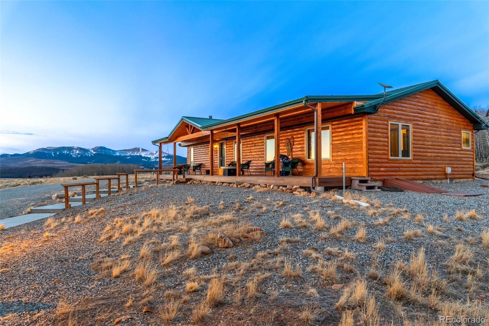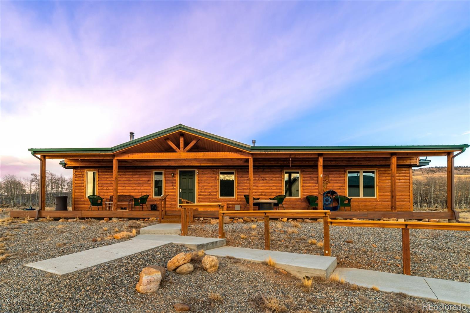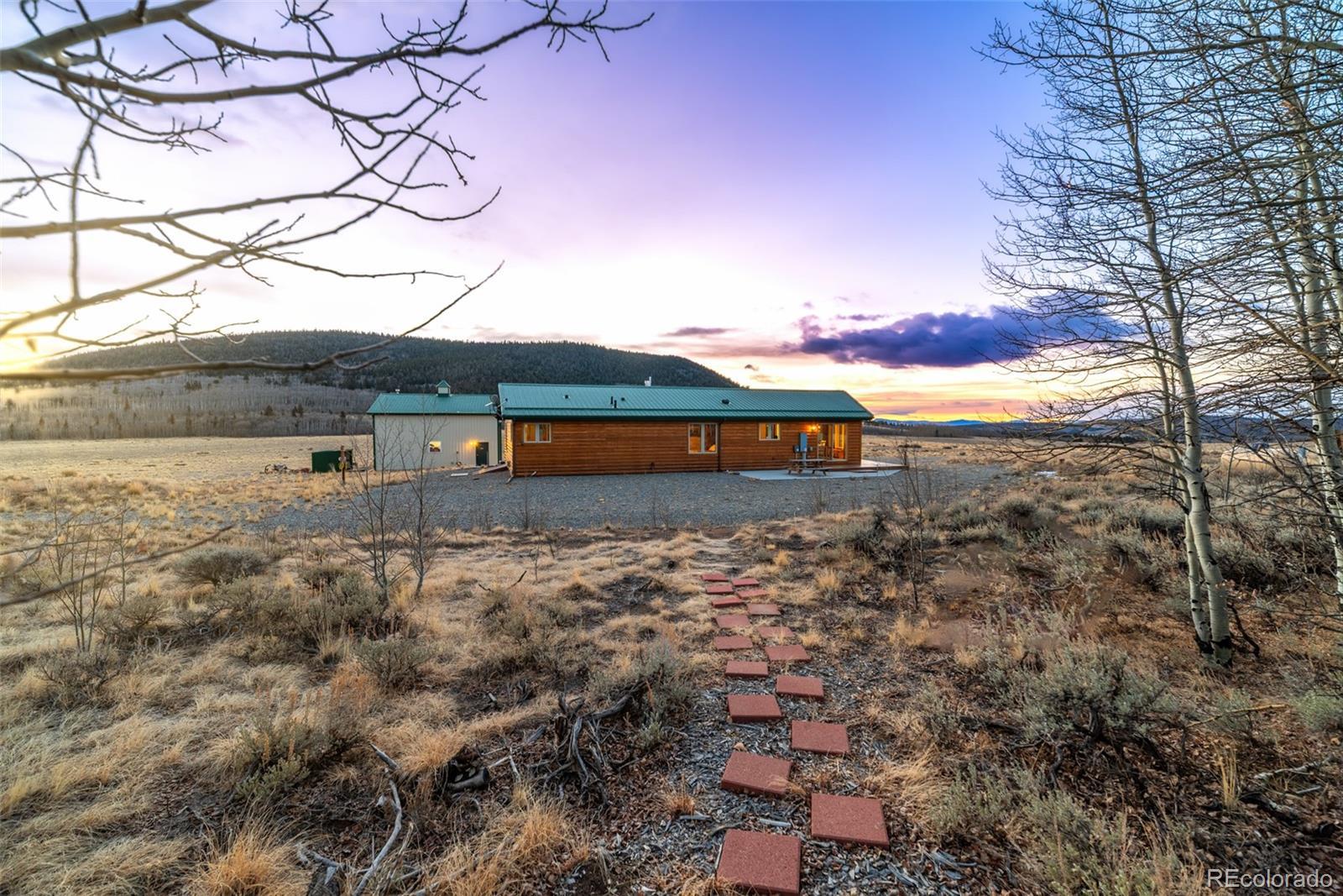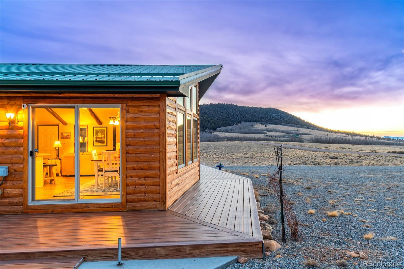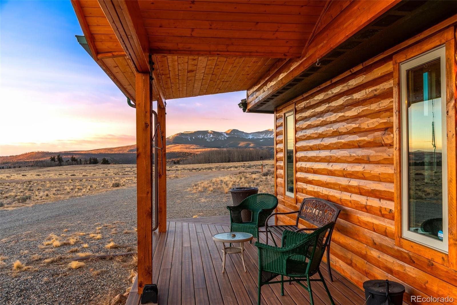 Mountain living in all its splendor. A beautiful, single level, log sided home on 35 acres surrounded by massive mountain views. You will have the space to spread out and enjoy all the benefits of small town living in the Rockies. This spacious home has the ideal footprint. A covered front porch leads into an open concept great room that is so welcoming. Living space with wood floors, a cozy wood burning stove, vaulted ceilings with wood beams, a dining space, and a kitchen fit for a chef will bring everyone together. A wall of windows allows you to really appreciate your stunning views. The kitchen has an abundance of cabinets and a pantry, high end appliances, granite countertops, and a kitchen island for additional seating. The spacious primary bedroom has an en suite 3/4 bath with a shower fit for a spa and an enormous walk in closet. A 2nd BR has a murphy bed to maximize space, and a full bath. The 3rd BR is perfect for an office or guest room. There is also a huge laundry room with an additional Freezer. This an ideal family home, vacation getaway, or short term rental prospect. The outside space is perfect for enjoying everything the mountains have to offer. A deck wraps around the entire home for grilling, entertaining, or just relaxing, or taking in those colorful sunrises with a cup of coffee. Pathways and a beautiful gravel drive lead to a treehouse tucked in the aspens, a concrete patio, and a garage to covet. The deck is wired and ready for a Hot Tub. The OS two car, 900 square foot garage is insulated and heated with 12 foot doors. Store the vehicles, the toys, set up a workshop, you will have the space. The land has expansive aspen groves, and the acreage qualifies for a domestic well, so you can bring the livestock and set up your own Rocky Mountain ranch. Just minutes from the town of Fairplay, you will have easy access to shopping, entertainment, and outdoor adventures. Don't let this beautiful home slip away. Home is being sold furnished.