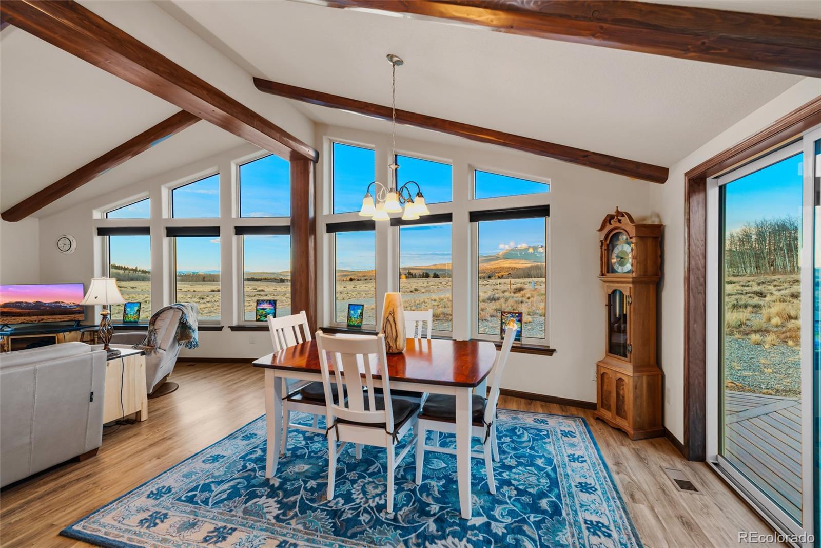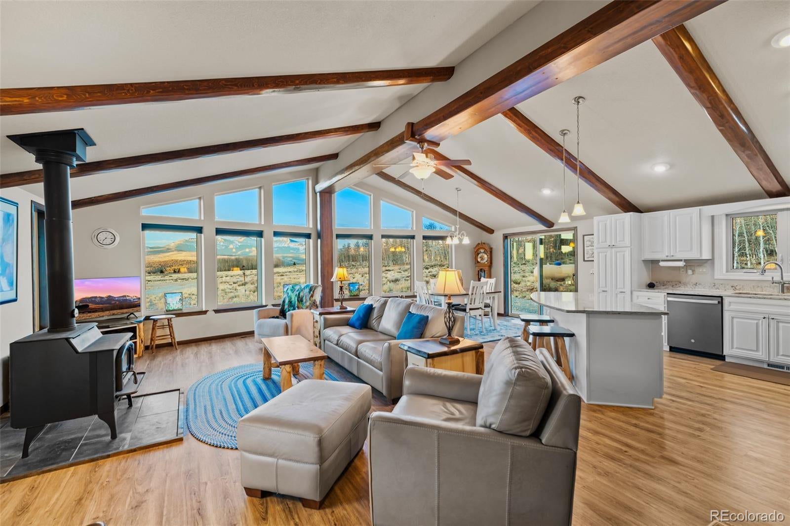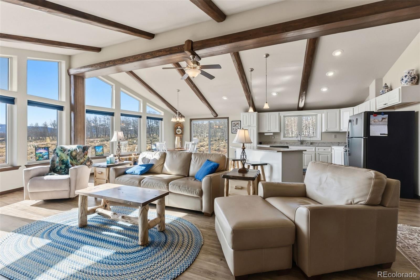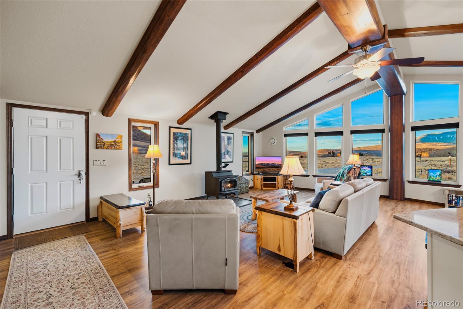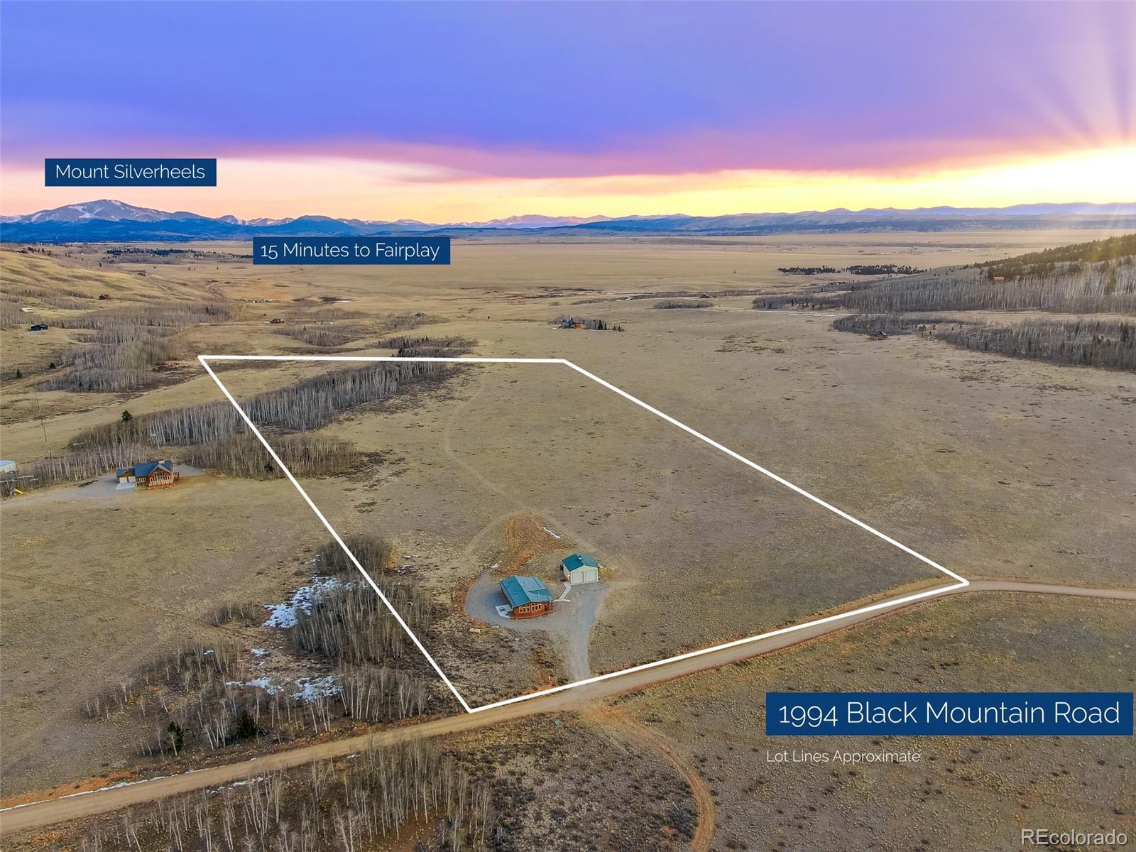 Mountain living in all its splendor. A beautiful, single level, log sided home on 35 acres surrounded by massive mountain views. You will have the space to spread out and enjoy all the benefits of small town living in the Rockies. This spacious home has the ideal footprint. A covered front porch leads into an open concept great room that is so welcoming. Living space with wood floors, a cozy wood burning stove, vaulted ceilings with wood beams, a dining space, and a kitchen fit for a chef will bring everyone together. A wall of windows allows you to really appreciate your stunning views. The kitchen has an abundance of cabinets and a pantry, high end appliances, granite countertops, and a kitchen island for additional seating. The spacious primary bedroom has an en suite 3/4 bath with a shower fit for a spa and an enormous walk in closet. A 2nd BR has a murphy bed to maximize space, and a full bath. The 3rd BR is perfect for an office or guest room. There is also a huge laundry room with an additional Freezer. This an ideal family home, vacation getaway, or short term rental prospect. The outside space is perfect for enjoying everything the mountains have to offer. A deck wraps around the entire home for grilling, entertaining, or just relaxing, or taking in those colorful sunrises with a cup of coffee. Pathways and a beautiful gravel drive lead to a treehouse tucked in the aspens, a concrete patio, and a garage to covet. The deck is wired and ready for a Hot Tub. The OS two car, 900 square foot garage is insulated and heated with 12 foot doors. Store the vehicles, the toys, set up a workshop, you will have the space. The land has expansive aspen groves, and the acreage qualifies for a domestic well, so you can bring the livestock and set up your own Rocky Mountain ranch. Just minutes from the town of Fairplay, you will have easy access to shopping, entertainment, and outdoor adventures. Don't let this beautiful home slip away. Home is being sold furnished.