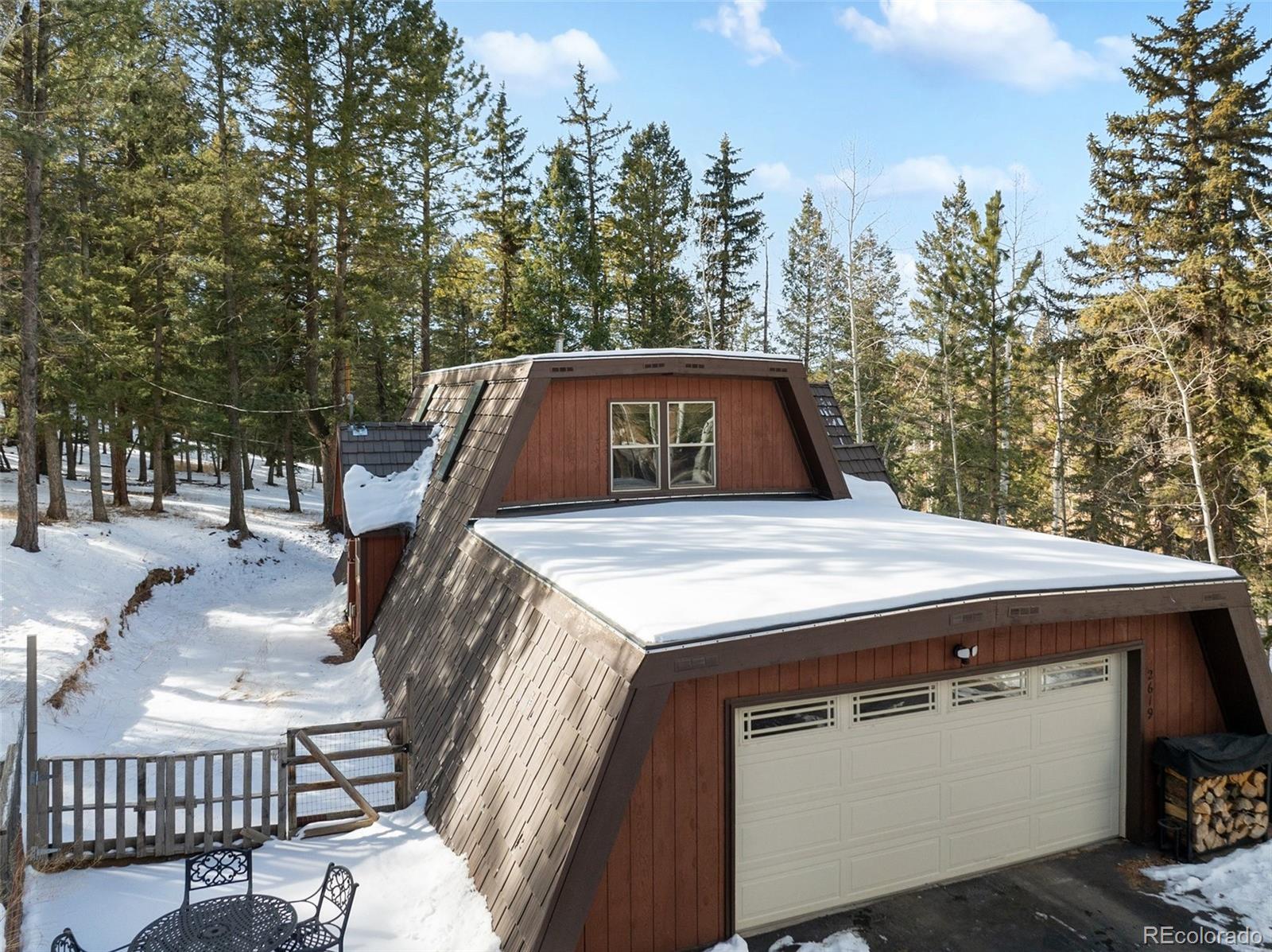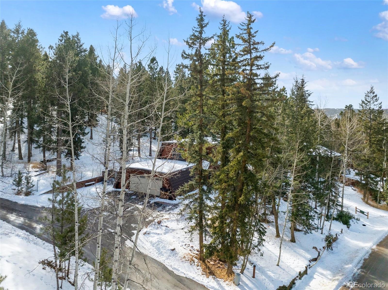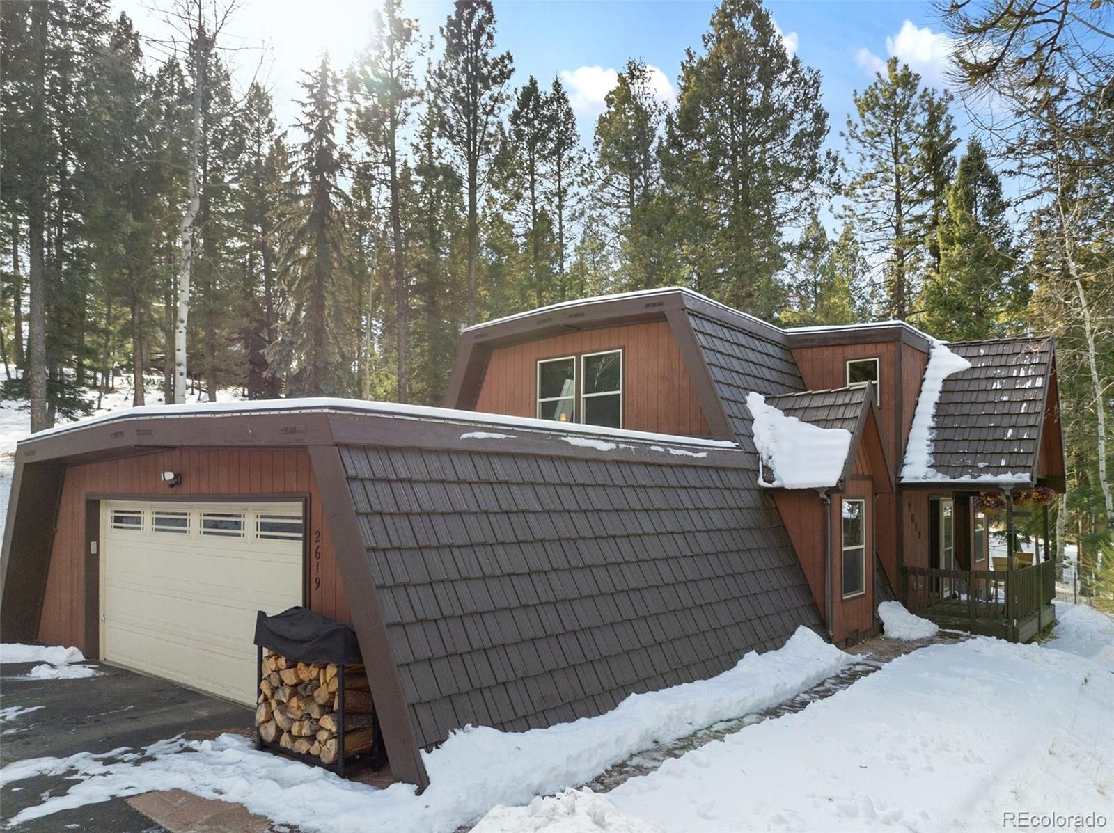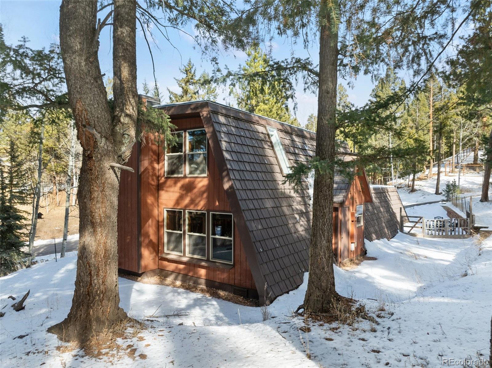 Set within the established mountain community of Sunnywood Manor, this distinctive home is surrounded by mature pine and aspen trees, offering privacy, wildlife views, and a peaceful setting. Located in unincorporated Teller County rather than the City of Woodland Park, the property benefits from city water and sewer and rental potential. The home offers chalet-style character without the limitations of a traditional A-frame. A thoughtfully designed roofline provides flatter interior ceilings and a bright, open feel throughout. Fresh interior paint adds a clean, updated look. Upstairs, the primary bedroom includes deep closets, large windows, and direct access to the updated bathroom with a spacious ceramic tile shower and additional storage. A second upstairs bedroom offers flexible space for a home office, or play area and also connects to the upstairs bathroom. The main level features warm wood flooring, exposed beams, and a wood-burning stove set into a brick surround, creating an inviting living space. Large new, wood windows bring in natural light and frame the surrounding forest. The dining area flows easily between the living room and kitchen. The kitchen has been refreshed with new countertops, granite sink, and hardware, along with generous cabinetry and a garden window above the sink. A main-level bedroom offers convenient access to the nearby bathroom and easliy can serve as an office space. Heating includes original operational baseboard heaters on the main level, supplemented by a new forced-air furnace for improved efficiency. Outside, a fenced side and backyard provide additional parking, storage, and space for recreational vehicles. The lot extends beyond the fenced area to the power line easement, and a two-car garage adds everyday practicality. With its setting, design, and flexibility, this home offers a well-rounded mountain living opportunity that has been updated in every aspect of the property. Don't miss this beautiful home in the mountains!