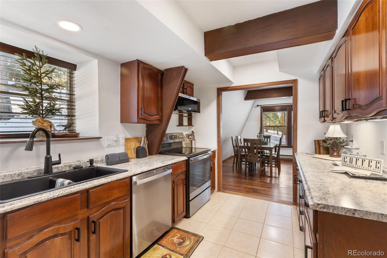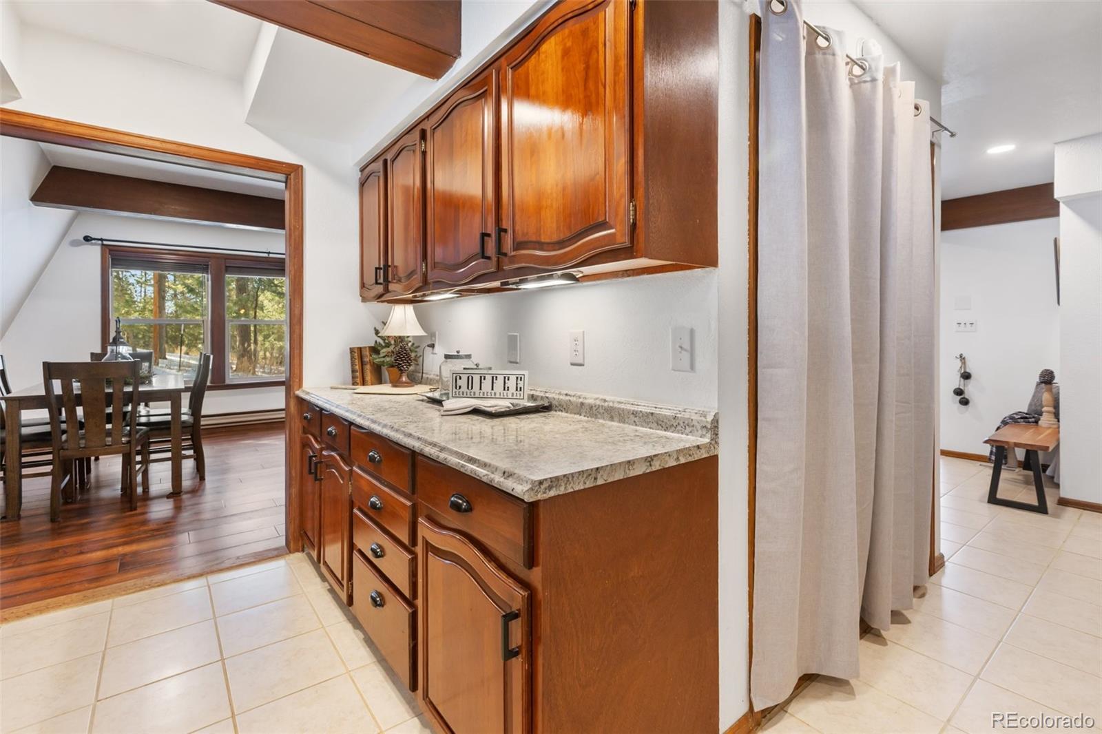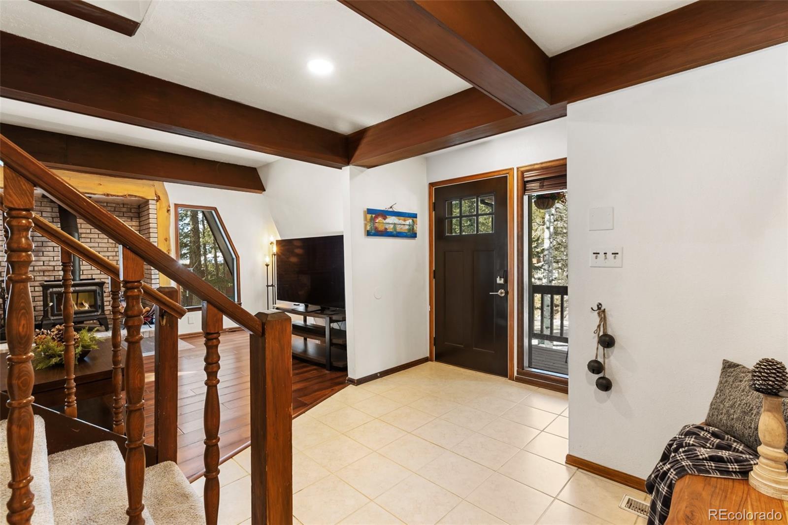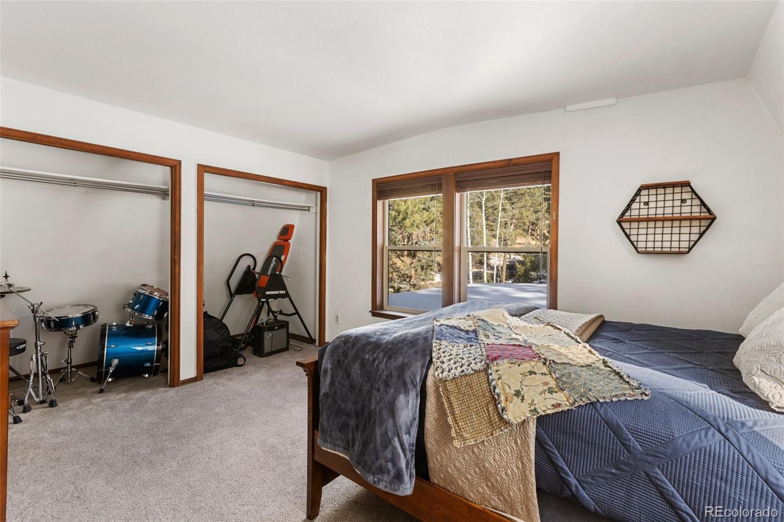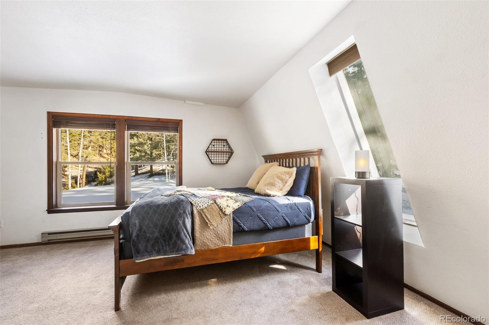 Set within the established mountain community of Sunnywood Manor, this distinctive home is surrounded by mature pine and aspen trees, offering privacy, wildlife views, and a peaceful setting. Located in unincorporated Teller County rather than the City of Woodland Park, the property benefits from city water and sewer and rental potential. The home offers chalet-style character without the limitations of a traditional A-frame. A thoughtfully designed roofline provides flatter interior ceilings and a bright, open feel throughout. Fresh interior paint adds a clean, updated look. Upstairs, the primary bedroom includes deep closets, large windows, and direct access to the updated bathroom with a spacious ceramic tile shower and additional storage. A second upstairs bedroom offers flexible space for a home office, or play area and also connects to the upstairs bathroom. The main level features warm wood flooring, exposed beams, and a wood-burning stove set into a brick surround, creating an inviting living space. Large new, wood windows bring in natural light and frame the surrounding forest. The dining area flows easily between the living room and kitchen. The kitchen has been refreshed with new countertops, granite sink, and hardware, along with generous cabinetry and a garden window above the sink. A main-level bedroom offers convenient access to the nearby bathroom and easliy can serve as an office space. Heating includes original operational baseboard heaters on the main level, supplemented by a new forced-air furnace for improved efficiency. Outside, a fenced side and backyard provide additional parking, storage, and space for recreational vehicles. The lot extends beyond the fenced area to the power line easement, and a two-car garage adds everyday practicality. With its setting, design, and flexibility, this home offers a well-rounded mountain living opportunity that has been updated in every aspect of the property. Don't miss this beautiful home in the mountains!