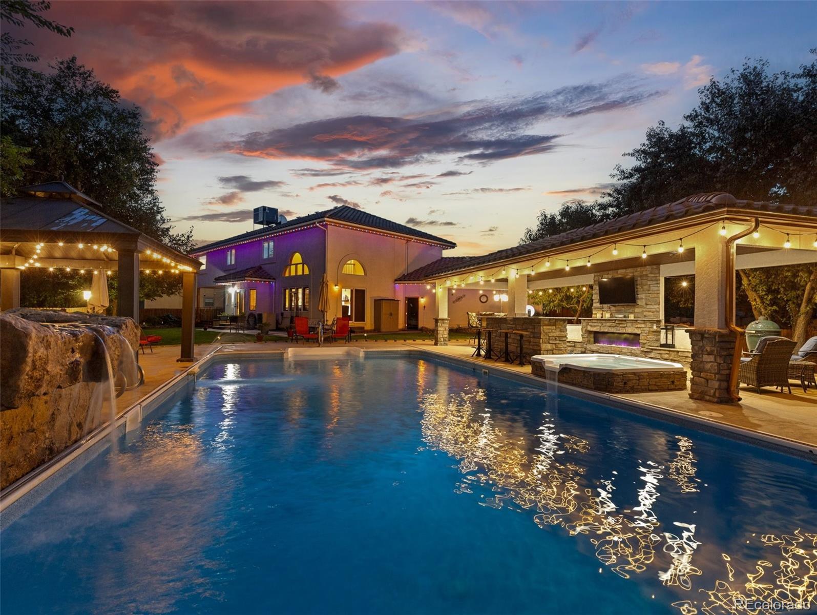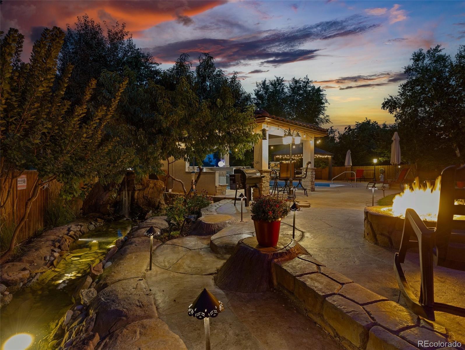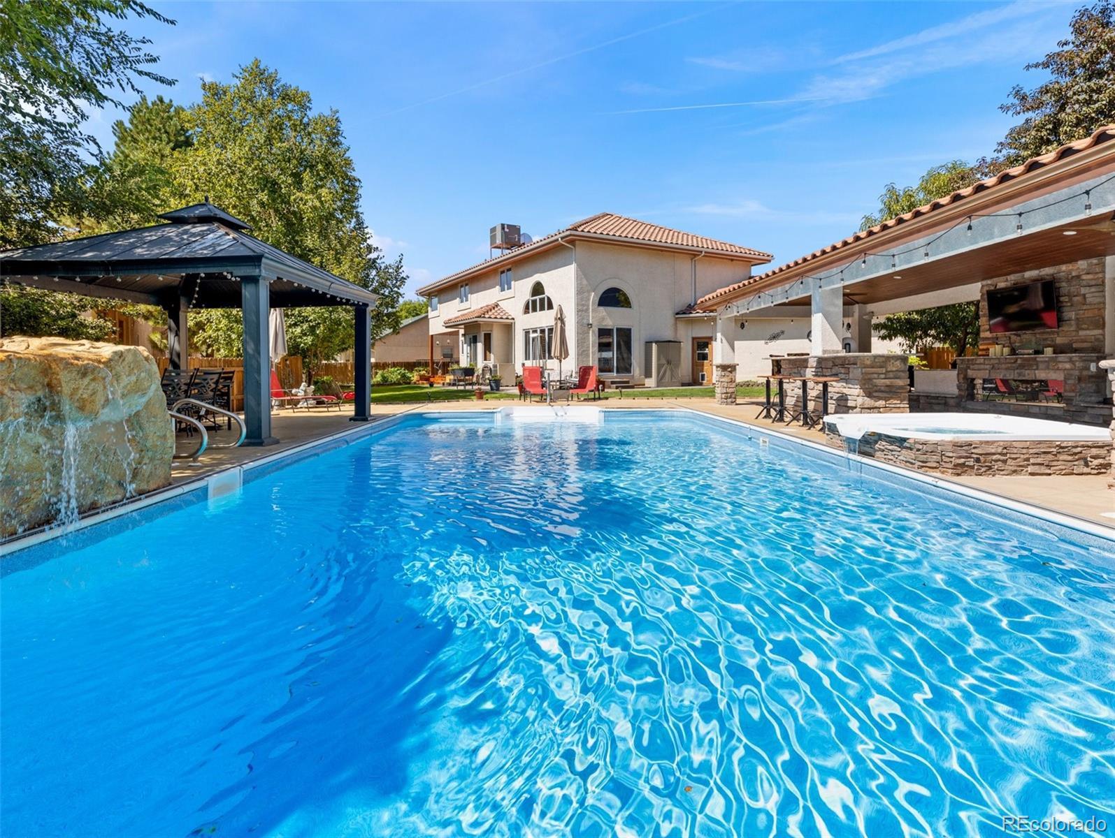 Take Advantage of This New Price! Don't miss this exceptional opportunity to embrace luxury in this stunning 2-story home located in the prestigious El Camino neighborhood. Featuring 5 bedrooms, 5 bathrooms, and over 5,000 sq ft of beautifully remodeled living space, this home seamlessly combines elegance, comfort, and functionality. Step into nearly 2,000 sq ft on the main level, where you’ll be welcomed by soaring vaulted ceilings, a spacious formal living and dining area, and a gourmet kitchen that’s truly the heart of the home. The chef’s kitchen boasts a large granite island, stainless steel appliances including a gas cooktop, double ovens, a warming drawer, custom cabinetry, and a designer tile backsplash—perfect for entertaining and hosting in style. Upstairs, you’ll find four spacious bedrooms, including a luxurious primary suite featuring a custom slate accent wall, a spa-inspired bathroom, an expansive walk-in closet, and a walk-in shower that offers the ultimate in relaxation. The fully finished basement expands your living space with a home theater, hobby room, dry bar, and an additional bedroom and bathroom, ideal for guests or multigenerational living. And then there's the backyard oasis—a show-stopping retreat complete with a covered outdoor kitchen, saltwater in-ground pool, built-in hot tub, serene ponds, gazebo, and Rocky Mountain Trim lighting for evening ambiance. Backing to a private greenbelt, this space is perfect for entertaining or simply unwinding in peaceful seclusion.