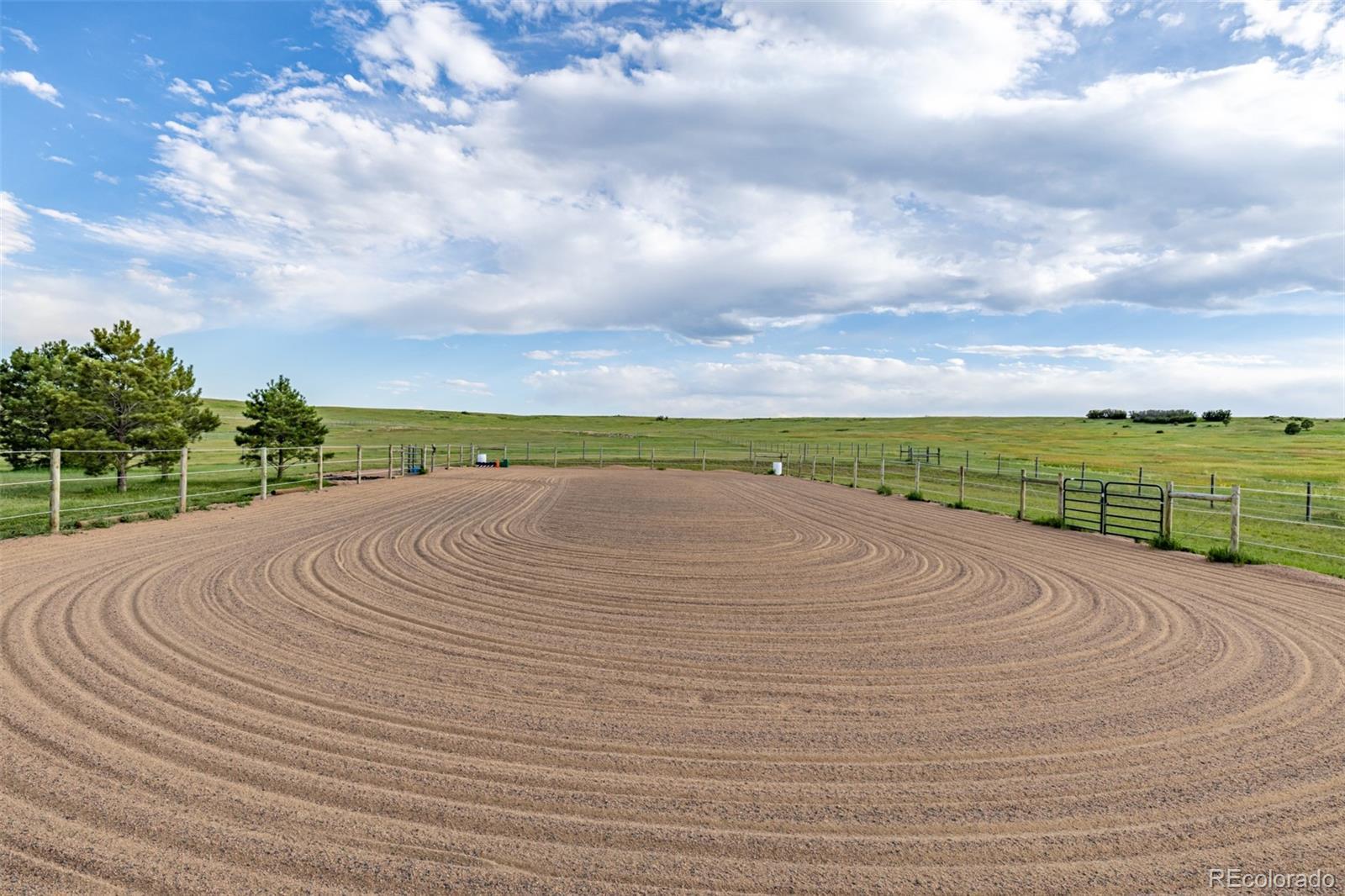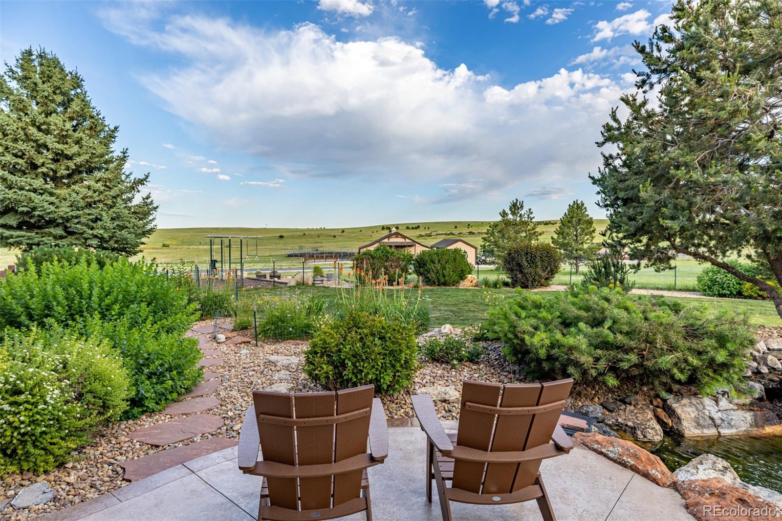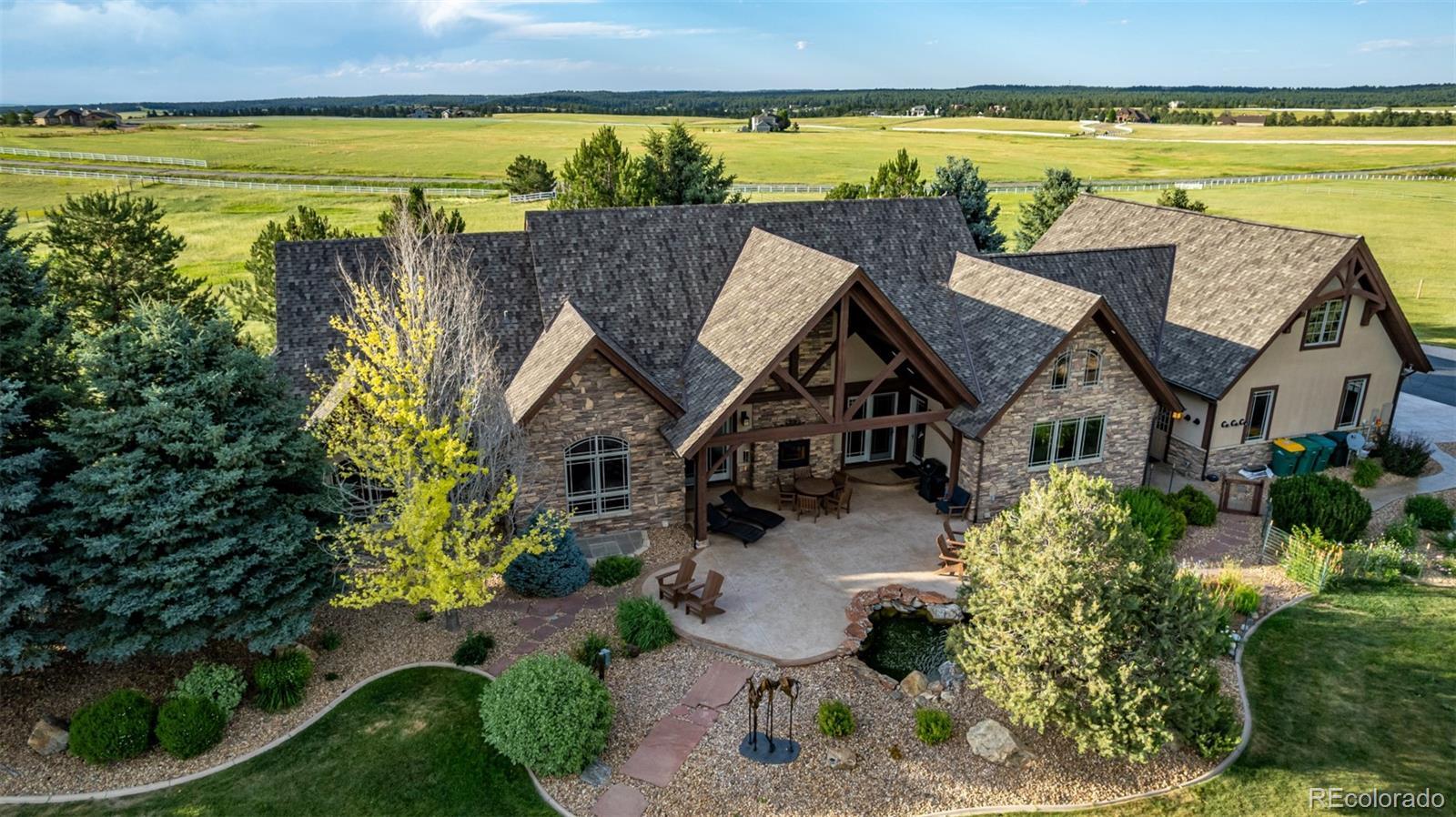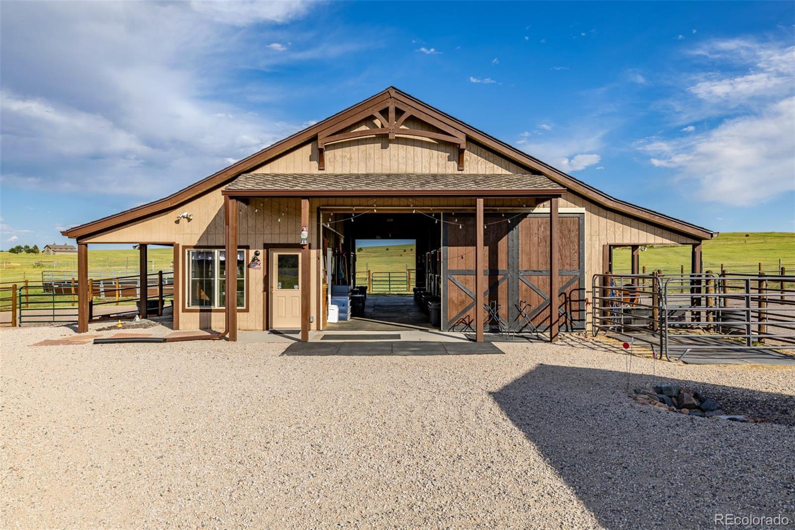 An exceptional equestrian estate on 35 acres in the gated Meadows at Castlewood, bordering Castlewood Canyon State Park and minutes from the Colorado Horse Park. This custom timber-frame home showcases mortise and tenon joinery, soaring beams, tongue-and-groove ceilings, wide plank flooring, and exquisite millwork. The great room rises to 18 feet with a full-height double-sided stone fireplace shared with the outdoor patio, while the chef’s kitchen offers a massive granite and soapstone island, dual sinks, built-in appliances, a six-burner Wolf range with double ovens, and a spacious walk-in pantry with additional freezer. The main-level primary suite includes an antique fireplace surround, wet bar, etched-glass shower, soaking tub, and a private patio with water feature and pond. A secondary ensuite bedroom and a bonus office/flex suite above the garage provide versatility for family, guests, or caretakers. The finished basement expands livability with two bedrooms, Jack & Jill baths, a bonus room, exercise space, pub-style bar, rec room, roughed-in theater, and a secure concrete vault with steel door. Radiant floor heating, buried propane tanks, a heated four-car garage, and refined finishes throughout ensure both comfort and durability. Equestrian facilities are thoughtfully designed for safety and ease of use: a six-stall barn with custom StableMaster doors and Dutch doors from each stall to the exterior, outdoor wash area, a Chaparral round pen, two-stall pony barn with 10x10 stalls, and a double hay barn. Horse-safe fencing, dry paddocks, multiple dry lots, and rotating pastures with excellent drainage provide year-round usability and peace of mind. Professional arena footing and double-gated access—from the community entrance and private drive—create a secure, horse-friendly environment. Every detail reflects a commitment to equestrian excellence combined with luxury living, offering a rare opportunity in one of Colorado’s most exclusive settings.
