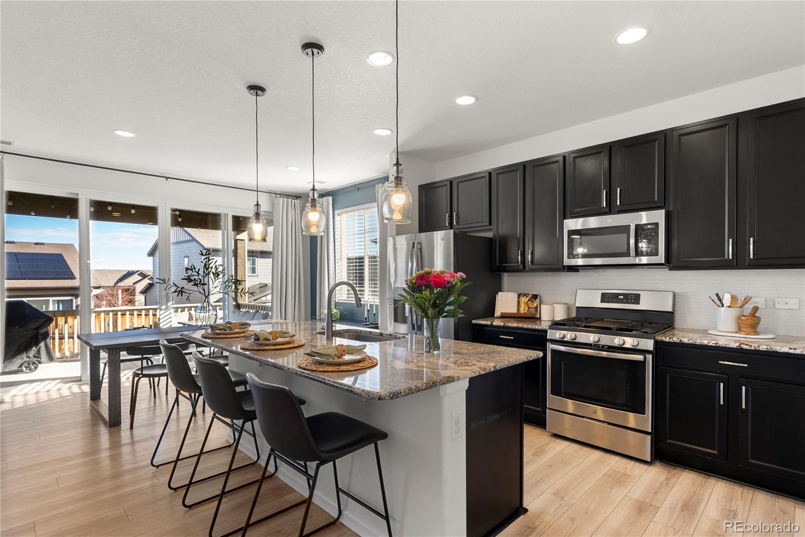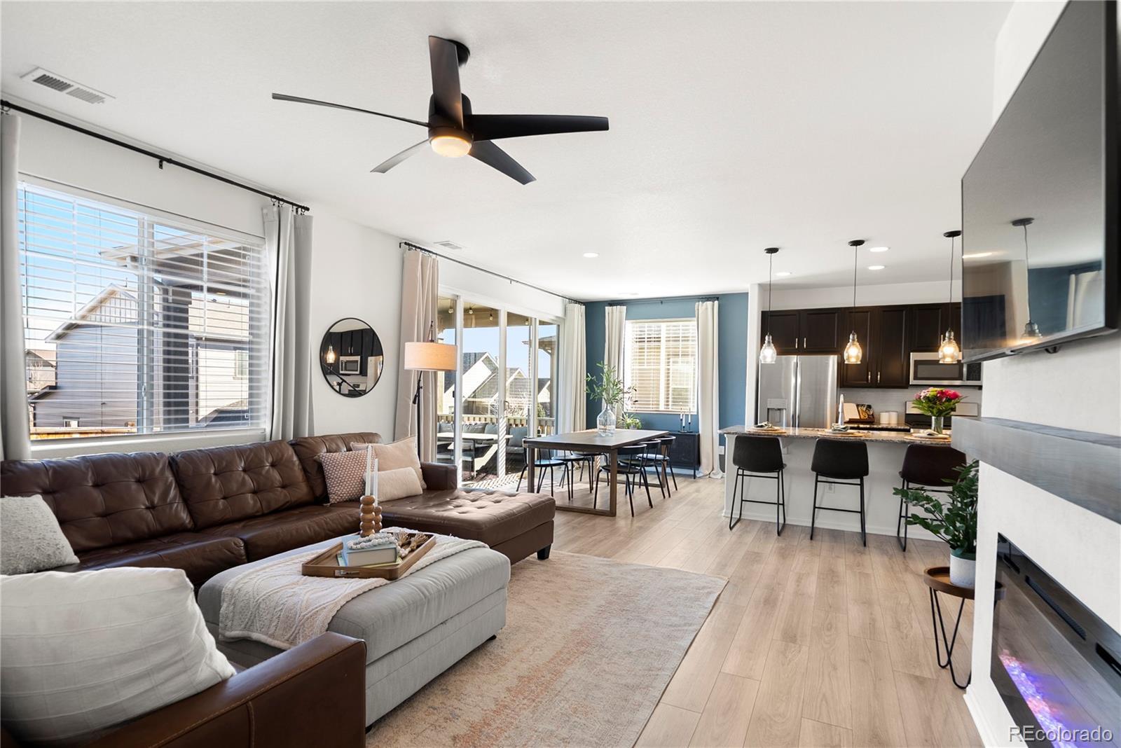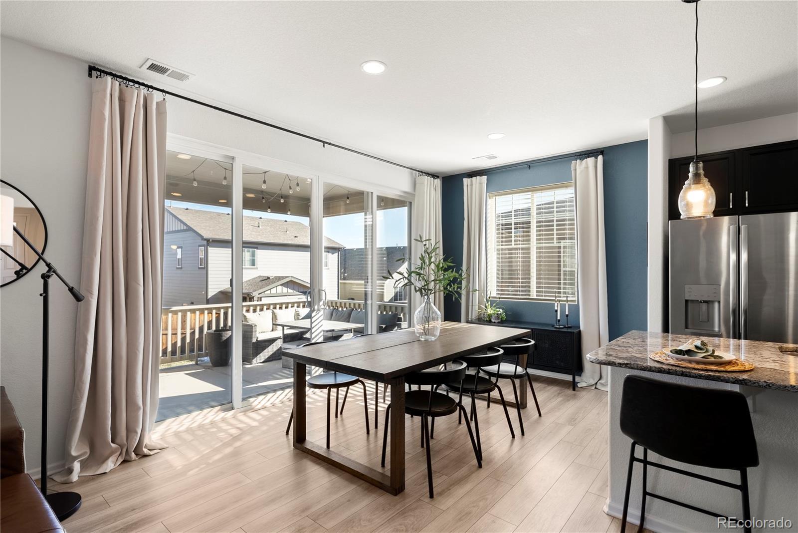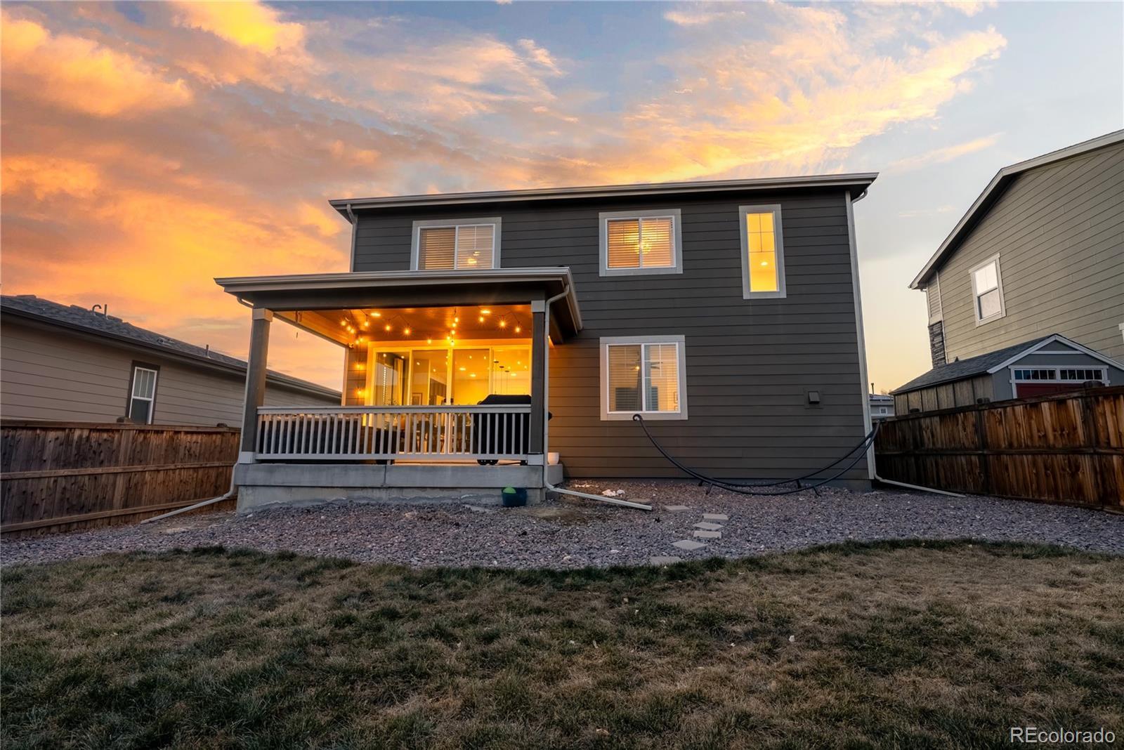 This 3 bedroom, 3 bath home feels bright and welcoming from the moment you step inside. Natural light streams in all day, helped by 9 foot ceilings on the main floor, and the open layout makes 2,051 square feet feel easy to live in. The main floor is designed for everyday life. Luxury vinyl flooring runs throughout, and the kitchen’s eat in island works for cooking, catching up, or casual dinners. Granite counters and stainless steel appliances complement the space, which flows well into the living area so the space feels connected. A powder room adds convenience for guests, and a dedicated office provides a quiet spot for work or study without using a bedroom. Upstairs, two full bathrooms serve three well-sized bedrooms, with granite counters continuing into the bathrooms. Storage is practical, the two car garage handles daily needs, and the large patio doors open to the backyard, leading out to a covered, low-maintenance patio. Built in 2019, the home sits in a newer community with walking trails and parks just steps away. Riverwalk Ballfield Park is nearby, Carpenter Park and the rec center are an 8 minute drive, and downtown Denver is less than 20 minutes away. RTD access is 1.4 miles out for commuters. The nearest grocery store is less than five minutes away, with several options within a 10 minute drive. For a home that delivers light, space, and real value near Denver, this one’s worth seeing in person. Contact us today for a detailed list of features, a floor plan, or to schedule your private tour. The home has been pre-inspected. Link to Listing Video: https://youtu.be/B7A86MNZerk?si=8QLYTki_-OLfAxMi