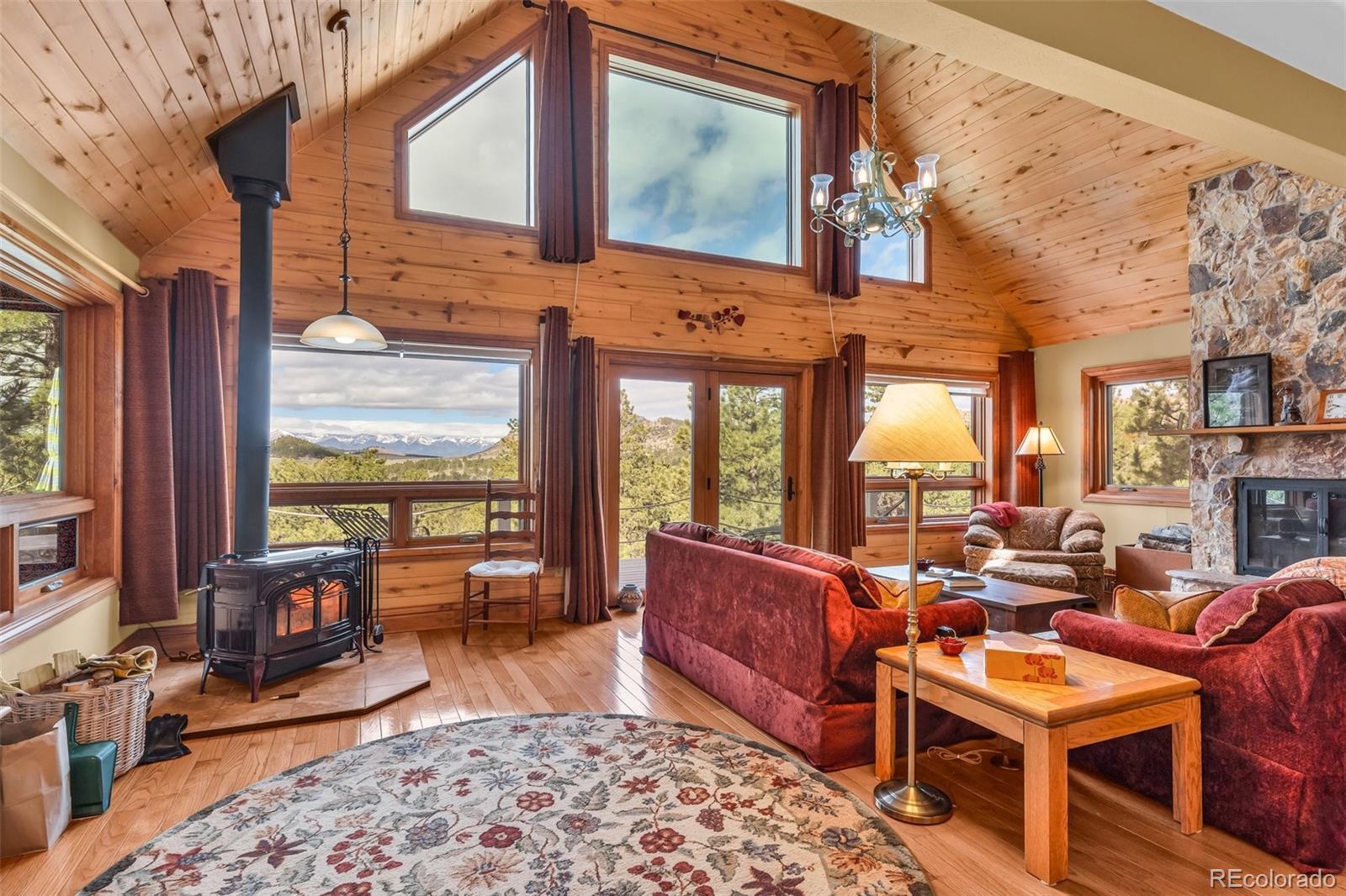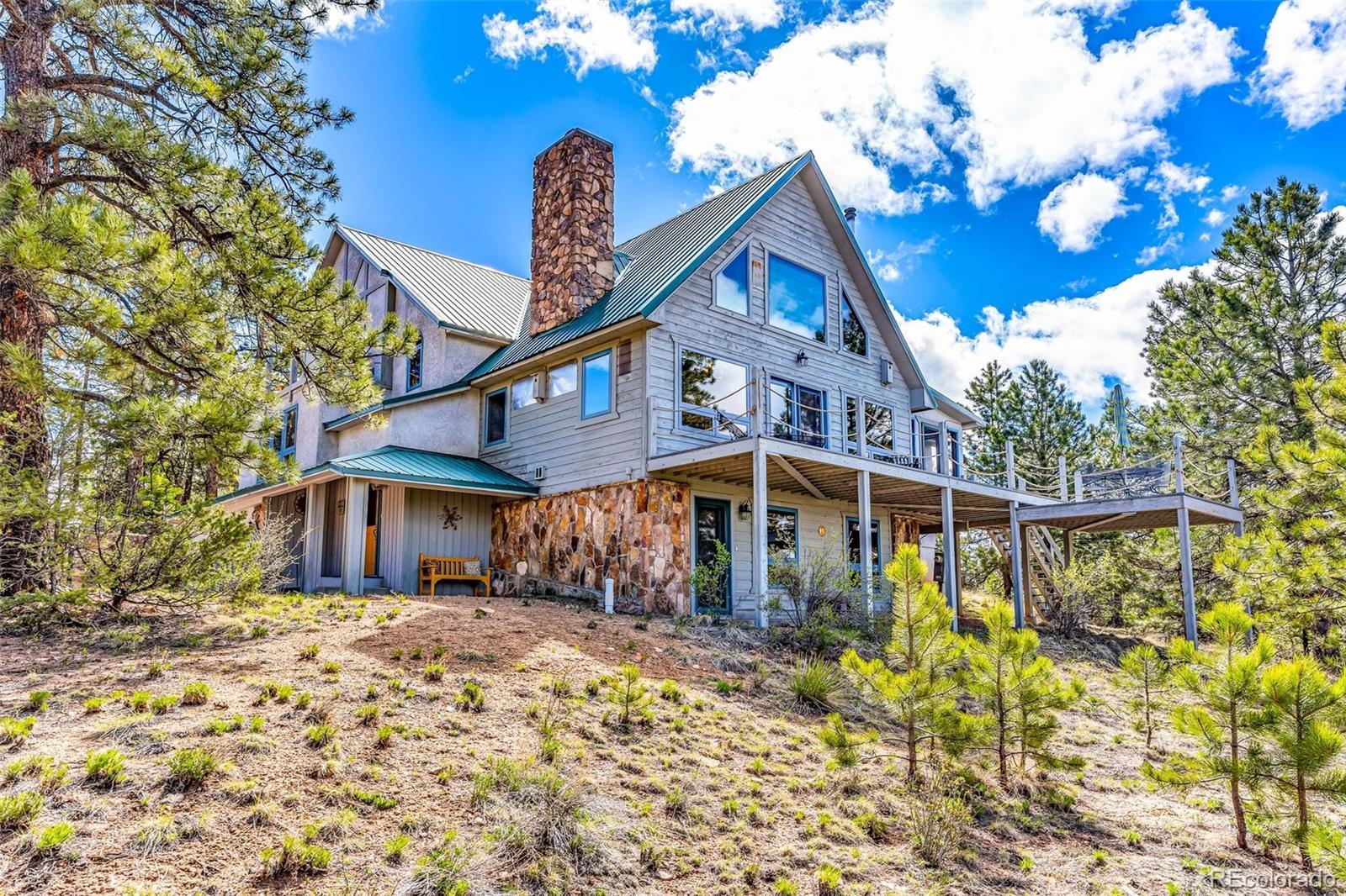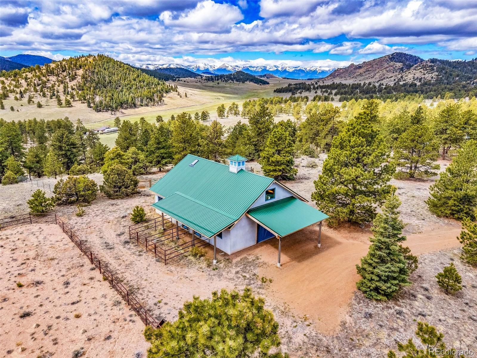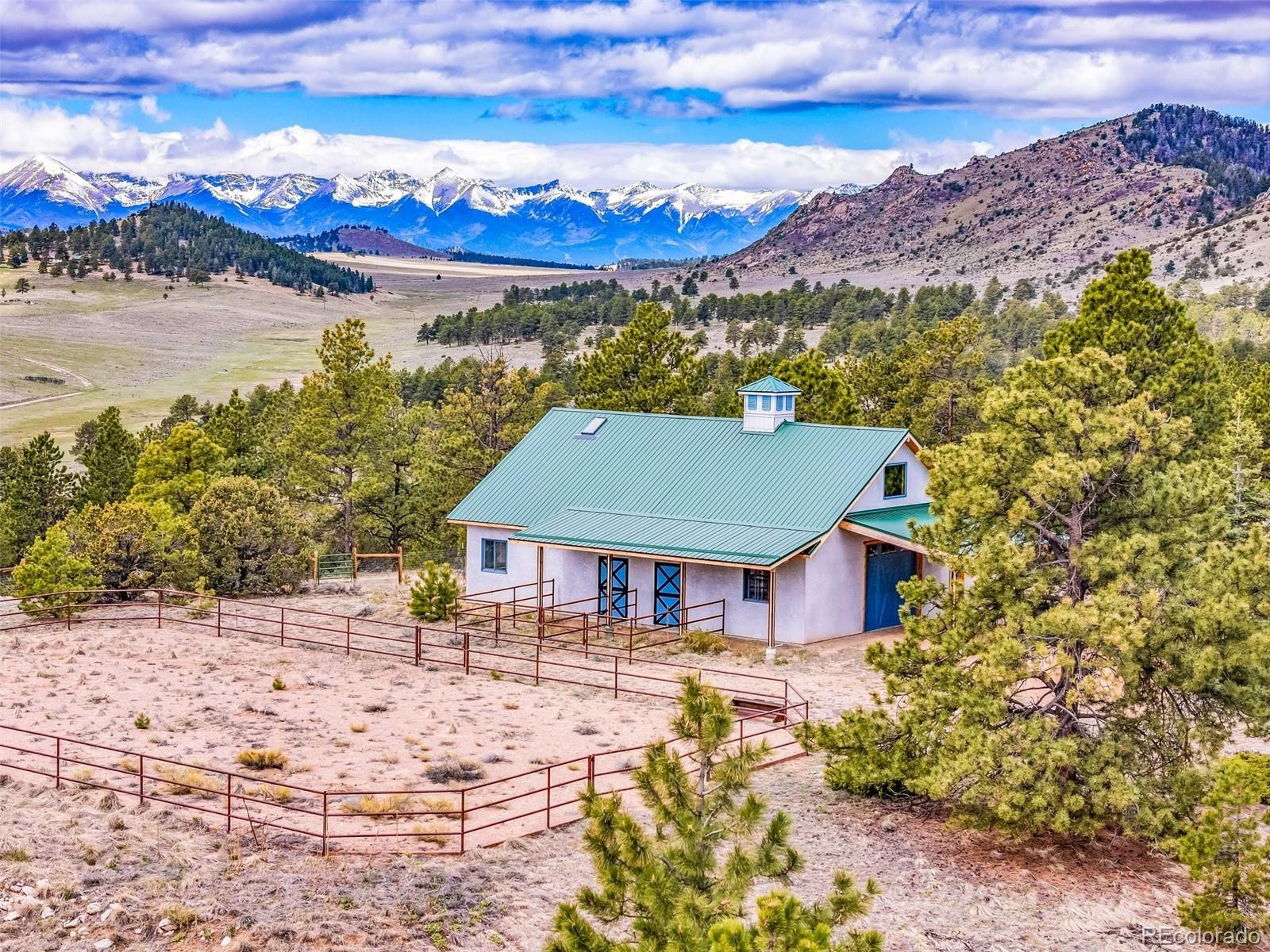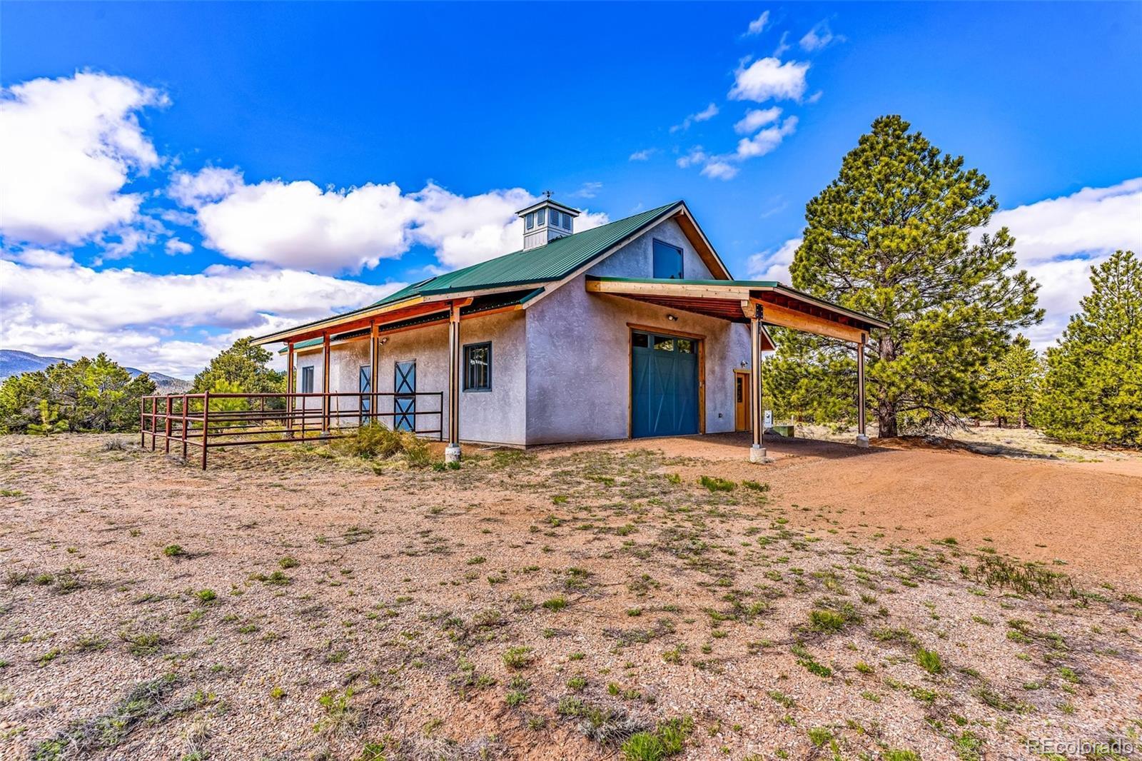 This beautifully crafted home is set on a stunning 77.7 acre parcel of land offering 360-degree views, including breathtaking vistas of four fourteeners: Crestone Peak, Crestone Needles, Humboldt and Kit Carson. The land encompasses six fenced pasture acres, trees, and a peaceful natural setting. The property operates primarily on photovoltaic solar power with a grid backup and is supported by two 1,000-gallon propane tanks. The home seamlessly blends modern sustainability with classic farmhouse design and includes three bedrooms and 3 bathrooms. The master bedroom features hardwood floors, a built-in desk and bookcase, and access to a deck from the master bath. The upper bedroom offers a deck, bay window seat, walk-in closet, and a secret playroom with ladder access to a carpeted attic. The lower bedroom functions as a TV room with a separate entrance, full bath, clothes closet and additional storage. All windows are double-pane, and the home features maximum insulation in the walls and ceiling for energy efficiency. A forced air furnace provides heating in addition to the radiant in-floor heating.The barn is a full equestrian setup.