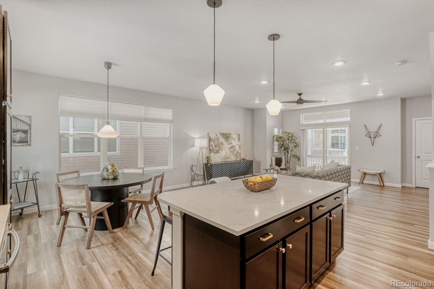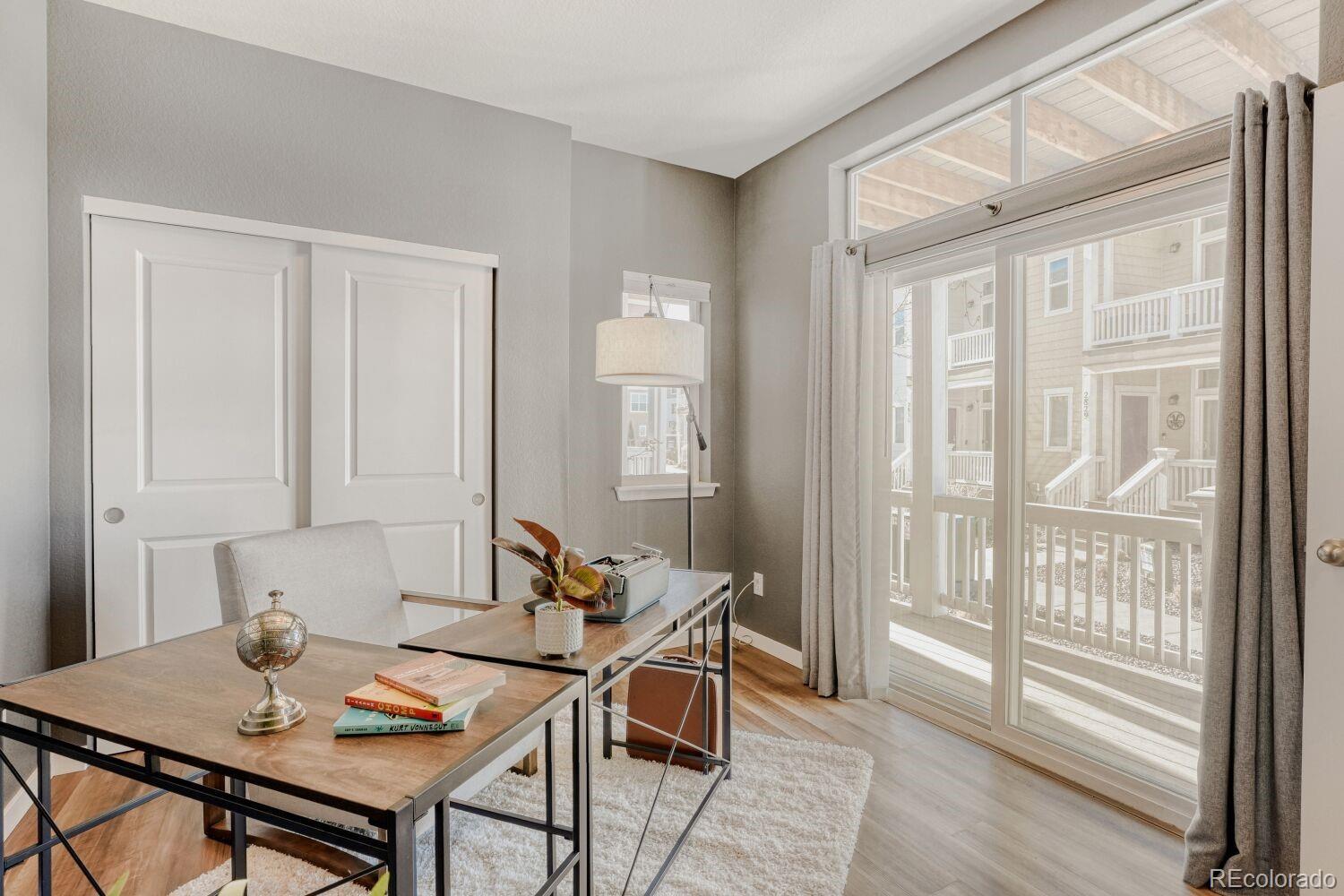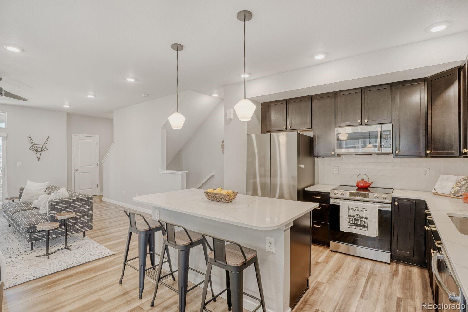 Welcome to this modern, light-filled townhouse in the heart of downtown Englewood, where sleek design meets everyday convenience. This 4-bedroom, 3-bathroom home features an open, airy layout with contemporary fixtures throughout, creating a clean, modern feel that’s both stylish and functional. The updated kitchen is a standout, centered around a huge island that’s perfect for gatherings, cooking, and casual dining. Enjoy mountain views from multiple vantage points, plus outdoor living with a welcoming front porch and a second-floor balcony, perfect for relaxing or hosting friends. Three bedrooms and the laundry closet are located on the top level, while custom closets add smart, functional storage throughout. The main-floor walk-out bedroom or office offers flexibility for remote work, a home gym, or a guest bedroom. With low HOA dues of just $70/month, this home delivers exceptional value in a prime location—just minutes from the Light Rail, the Gothic Theatre, shopping and dining galore, and an easy commute to downtown Denver or the Denver Tech Center. Modern, walkable, and perfectly situated, this spacious townhouse checks every box.