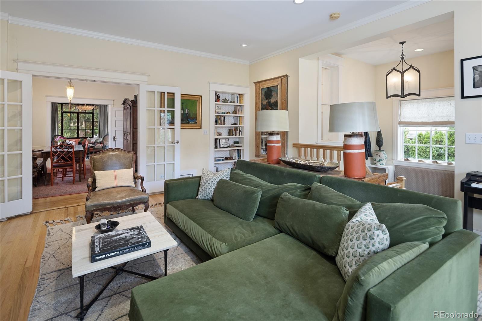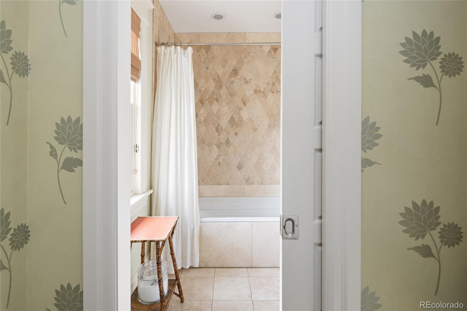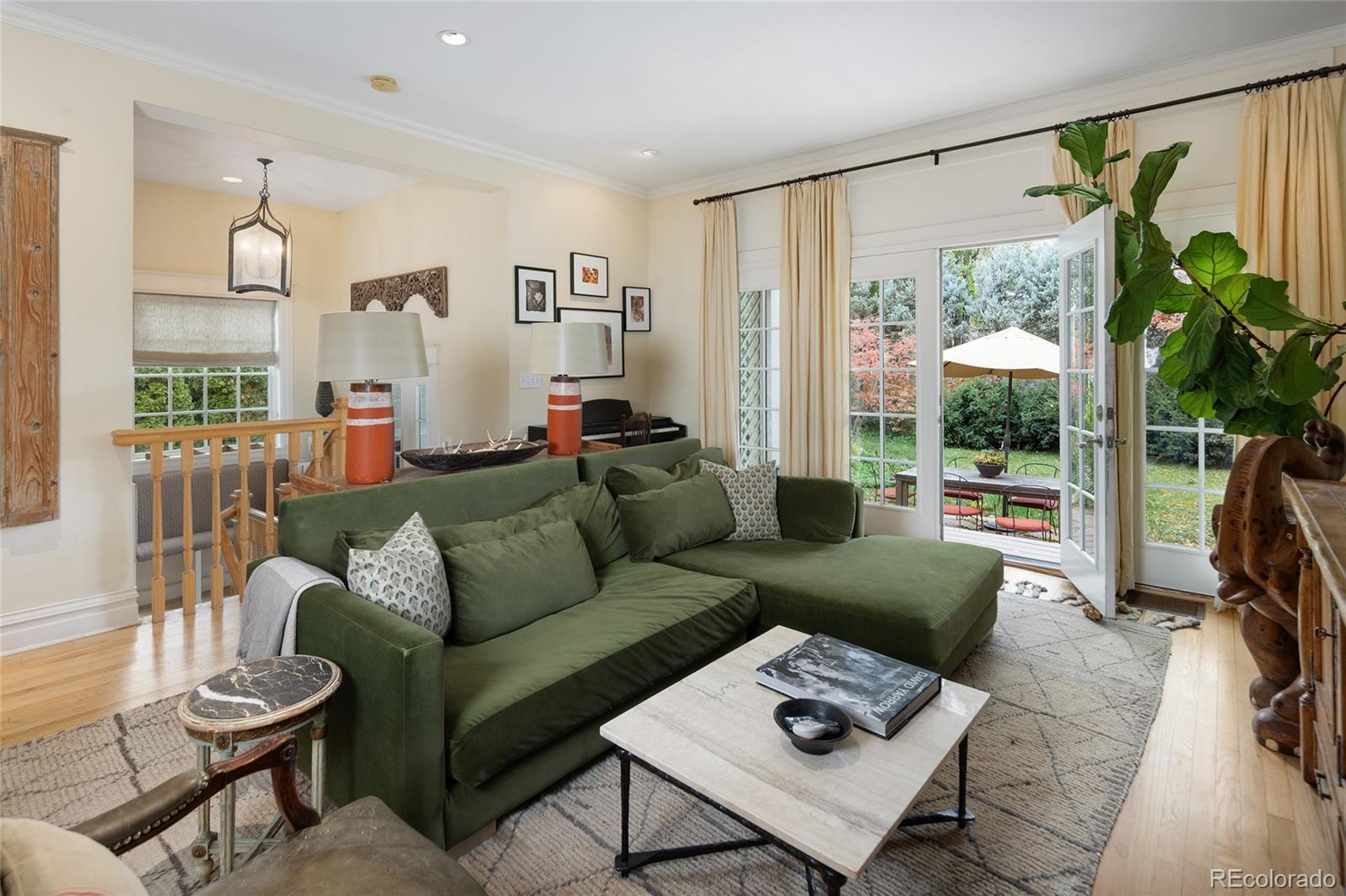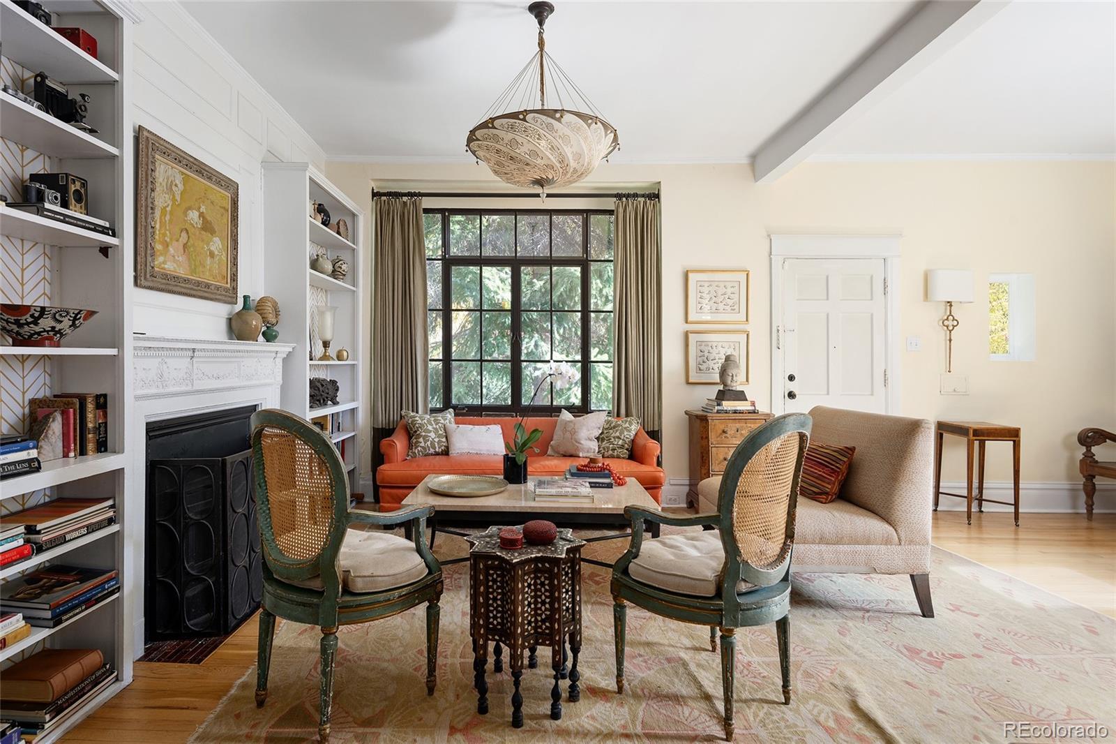 Exuding timeless elegance and modern sophistication, this beautifully restored 1910 Denver Square sits gracefully along a tree-lined street in the heart of Park Hill. Sunlight fills the inviting living room, where a classic wood-burning fireplace is flanked by custom built-ins — the perfect blend of charm and comfort. The elegant dining room flows seamlessly into a cozy family room and a recently renovated chef's kitchen. Designed for both beauty and function, the kitchen features exquisite tile flooring, stainless steel appliances, granite countertops, a new range, wine refrigerator, and appliance garage — all complemented by abundant storage. French doors open to a secluded backyard oasis with a newly built patio, perfect for quiet mornings or evening entertaining. Fully fenced backyard with doggie door. A designer powder room with striking wallpaper adds a touch of sophistication to the main level. Upstairs, a graceful staircase leads to four bedrooms and two baths. The primary suite is a serene retreat, complete with vaulted ceilings, a gas fireplace, and a spa-inspired bath showcasing designer wallpaper, a stunning vanity, travertine tile shower, and a walk-in closet. A versatile third-floor bedroom or flex space — ideal for a guest bedroom, playroom, or home office — offers a delightful surprise. The home also includes a partially finished basement with ample storage, a new roof (2024), and a new driveway. Featured in Colorado Homes & Lifestyles Magazine, this Park Hill treasure perfectly balances classic architecture with modern luxury.
