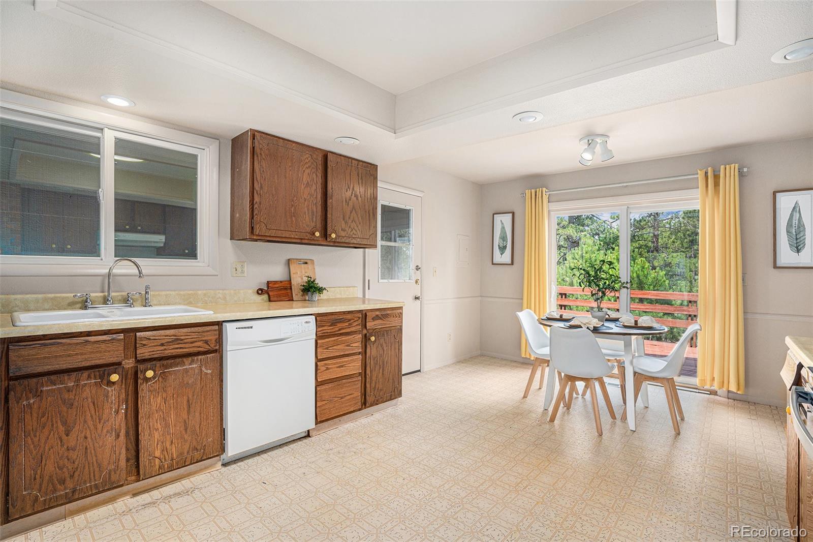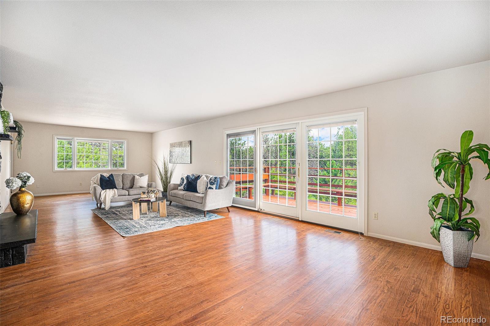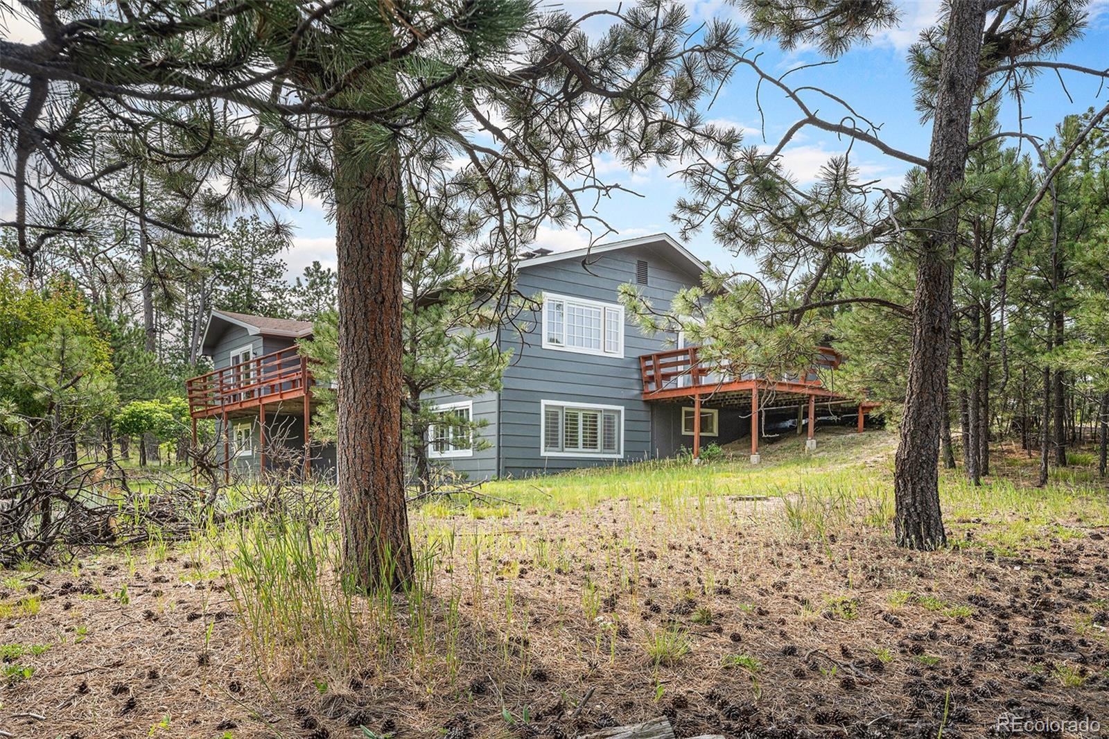 Location, location, location! Pikes Peak views and close in D20! Zoned for horses! Walkout rancher! Great opportunity on a beautifully treed, fully fenced lot! New roof and exterior paint! This house has amazing potential to personalize with your custom updates, and potentially open up the kitchen to make a fantastic great room! This is the handyman’s dream – put in some sweat equity to update and customize to your liking and tap into the full value of this property. This home has solid bones and will have fantastic potential equity even after the cost of some updates! Gorgeous Pike Peak views from kitchen and deck! Walkout basement. Real oak hardwood floors on the main floor that will look brand new with a little refurbishing with the stain color of your choosing. Walkout to the huge wood deck from the master bedroom, living room and kitchen. 2 beautiful brick fireplaces! Large master bedroom on the main, with dressing area, vanity, and walk-in closet. Additional bedroom on the main and 3 bedrooms and large family room in the basement! Create a fun indoor/outdoor space in the breezeway, or turn it into a sunroom. Oversized 2 car garage. Large homes on acreage surround. Enjoy the privacy, nature, and wildlife, all while being minutes away from stores, award winning schools, and amenities! This home is ready for you to move in and customize!
