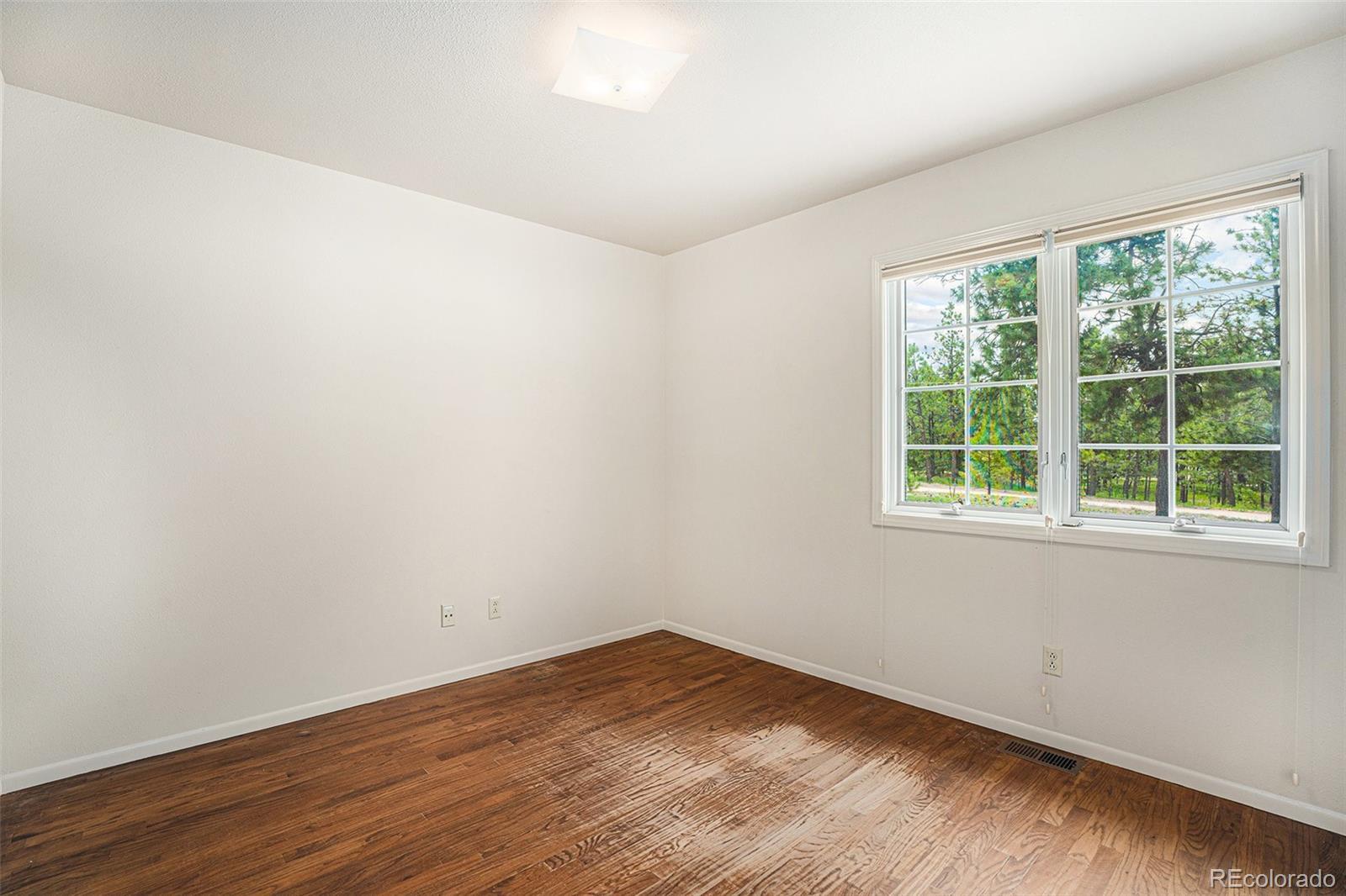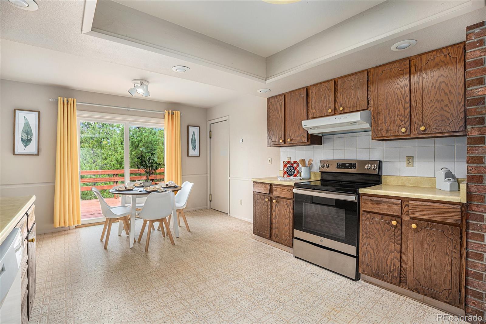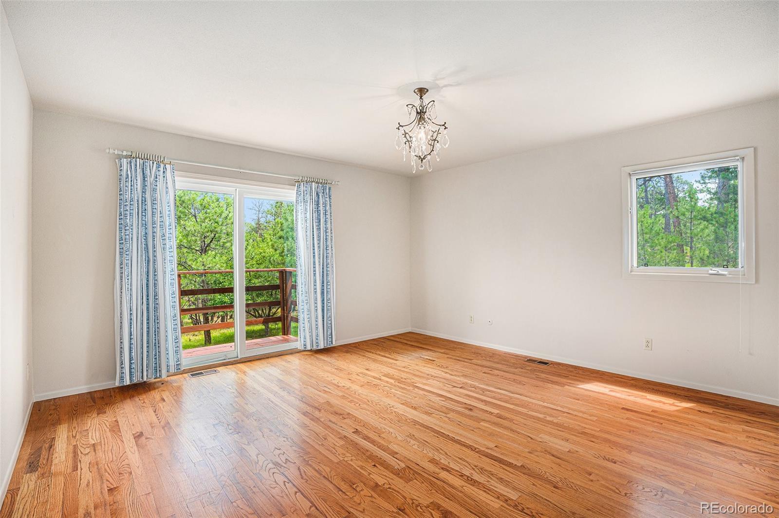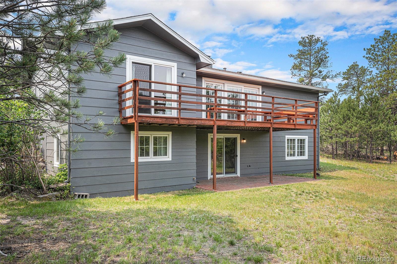 Location, location, location! Pikes Peak views and close in D20! Zoned for horses! Walkout rancher! Great opportunity on a beautifully treed, fully fenced lot! New roof and exterior paint! This house has amazing potential to personalize with your custom updates, and potentially open up the kitchen to make a fantastic great room! This is the handyman’s dream – put in some sweat equity to update and customize to your liking and tap into the full value of this property. This home has solid bones and will have fantastic potential equity even after the cost of some updates! Gorgeous Pike Peak views from kitchen and deck! Walkout basement. Real oak hardwood floors on the main floor that will look brand new with a little refurbishing with the stain color of your choosing. Walkout to the huge wood deck from the master bedroom, living room and kitchen. 2 beautiful brick fireplaces! Large master bedroom on the main, with dressing area, vanity, and walk-in closet. Additional bedroom on the main and 3 bedrooms and large family room in the basement! Create a fun indoor/outdoor space in the breezeway, or turn it into a sunroom. Oversized 2 car garage. Large homes on acreage surround. Enjoy the privacy, nature, and wildlife, all while being minutes away from stores, award winning schools, and amenities! This home is ready for you to move in and customize!