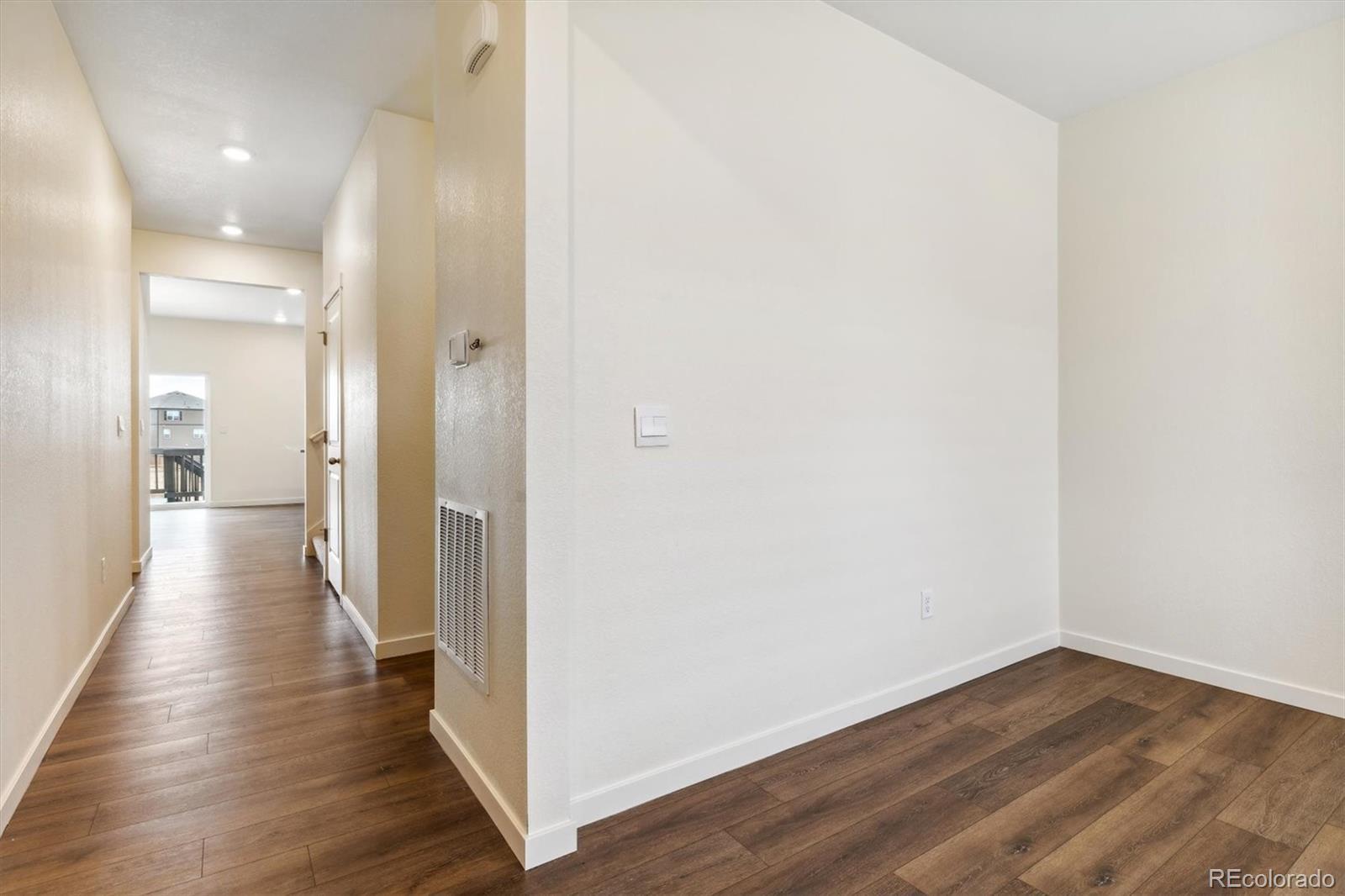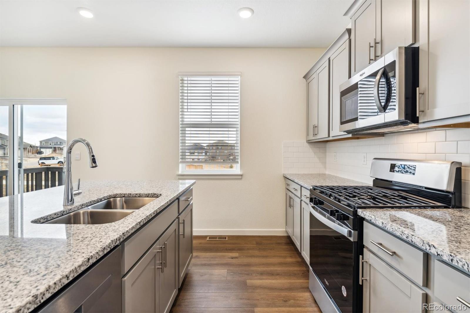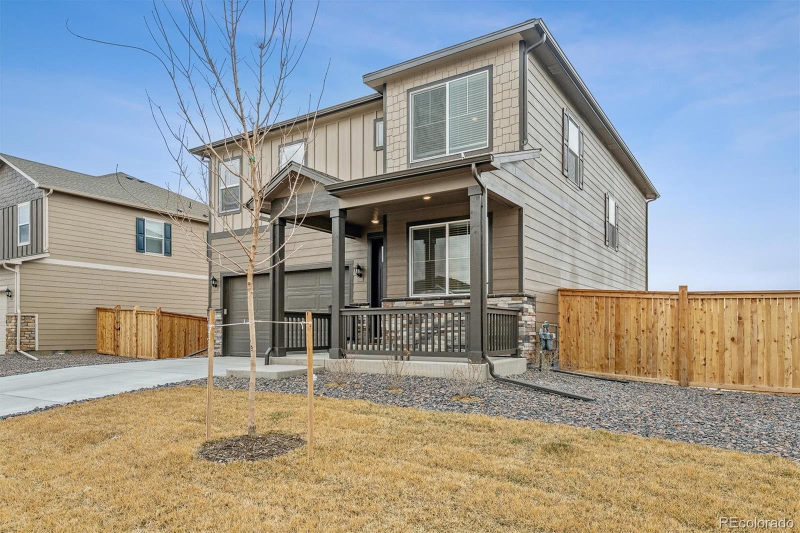 **Ready Now** Thoughtful design meets everyday living. This beautiful two-story home offers four spacious bedrooms, two and a half baths, and a two-car garage across 2,398 square feet of well-designed space. From the moment you step onto the inviting covered front porch, you'll feel the attention to detail and flow that makes the Holcombe the perfect place to call home. Just off the entry, a flexible study offers the perfect retreat for remote work, hobbies, or homework space. Further down the hall, a powder bath and coat closet provide everyday functionality before you enter the heart of the home - a bright and open great room, cozy dining nook, and a kitchen built for gathering. The chef's kitchen features shaker-style cabinetry, granite or quartz countertops, a stylish tile backsplash, a large walk-in pantry, and a convenient drop zone by the garage entry. Upstairs, you'll find four generous bedrooms, including a private primary suite with a spa-inspired bathroom featuring dual sinks, a stand-up shower, a private water closet, and a large walk-in closet. Bedrooms two, three, and four share a full bathroom with a tub-shower combination, and the upstairs laundry room makes everyday tasks easier and more convenient. The Holcombe is loaded with high-end finishes like luxury vinyl plank flooring throughout the main level, tile flooring in all wet areas, a tankless water heater, a radon mitigation system, a perimeter drain-tied sump pump, and a central air conditioning unit for year-round comfort. America's Smart Home technology is included, offering a video doorbell, smart thermostat, smart front door lock, smart light switch, and hands-free keyless entry for modern living made easy. Life at Settlers Crossing means enjoying community walking trails, a beautiful park, and an incredible location near Denver International Airport, shopping, dining, and future amenities. ***Photos are representative and not of actual property***