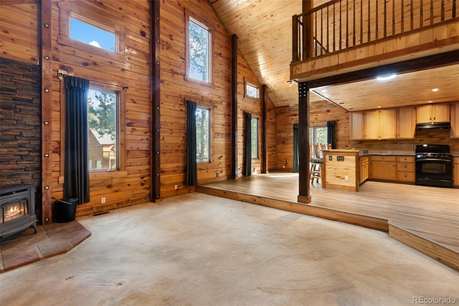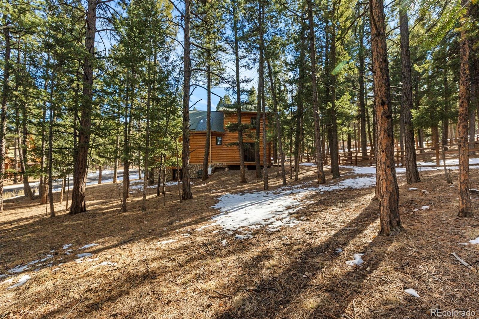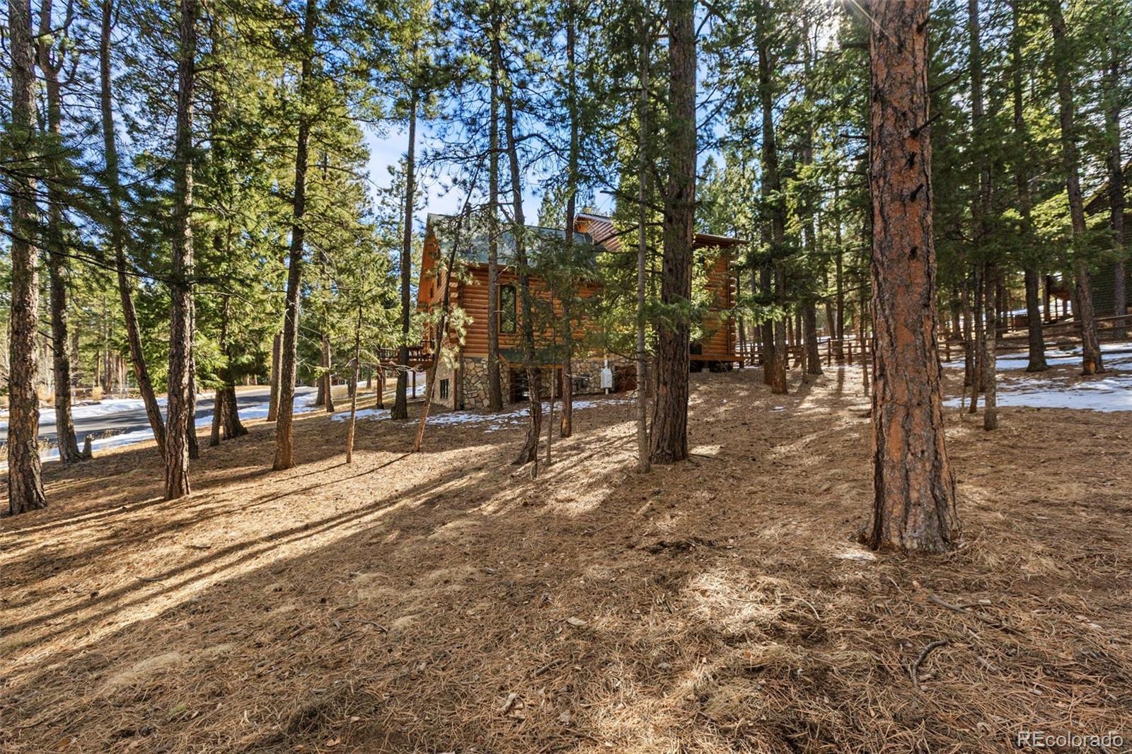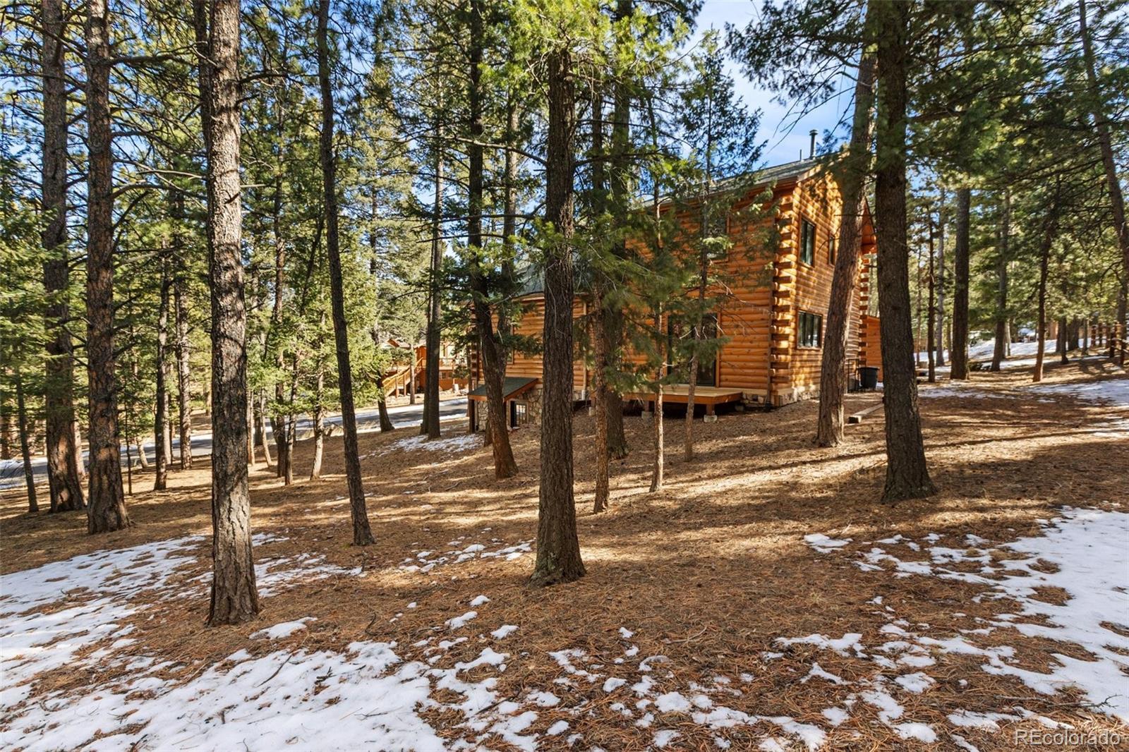 Classic full log home on a private, treed half-acre in the desirable Spruce Haven subdivision—just a short walk to downtown Woodland Park, restaurants, shopping, and everyday conveniences. This 4-bedroom, 3.5-bath home offers over 3,000 square feet of warm, authentic mountain living with a dramatic vaulted great room, exposed log interior, and wood-burning stove that anchors the space. The open kitchen features a large island and generous counter space, flowing easily into the dining and living areas for comfortable daily living or entertaining. The main-level primary bedroom provides convenient single-level living, while the upper loft overlooks the great room and offers flexible space for an office, reading area, or additional living space. The walk-out lower level features a spacious second living area with bar/kitchenette, ideal for guests, multi-generational living, or private quarters. With bedrooms and living areas on multiple levels, the floor plan offers flexibility for a variety of lifestyles. Step outside to the large wrap-around deck and enjoy the peaceful, wooded setting among mature pines. The detached two-car garage is log-sided to match the home, creating a cohesive rustic aesthetic. Natural gas, city utilities, and a location that combines privacy with easy walkability to town amenities make this a rare opportunity in Woodland Park.