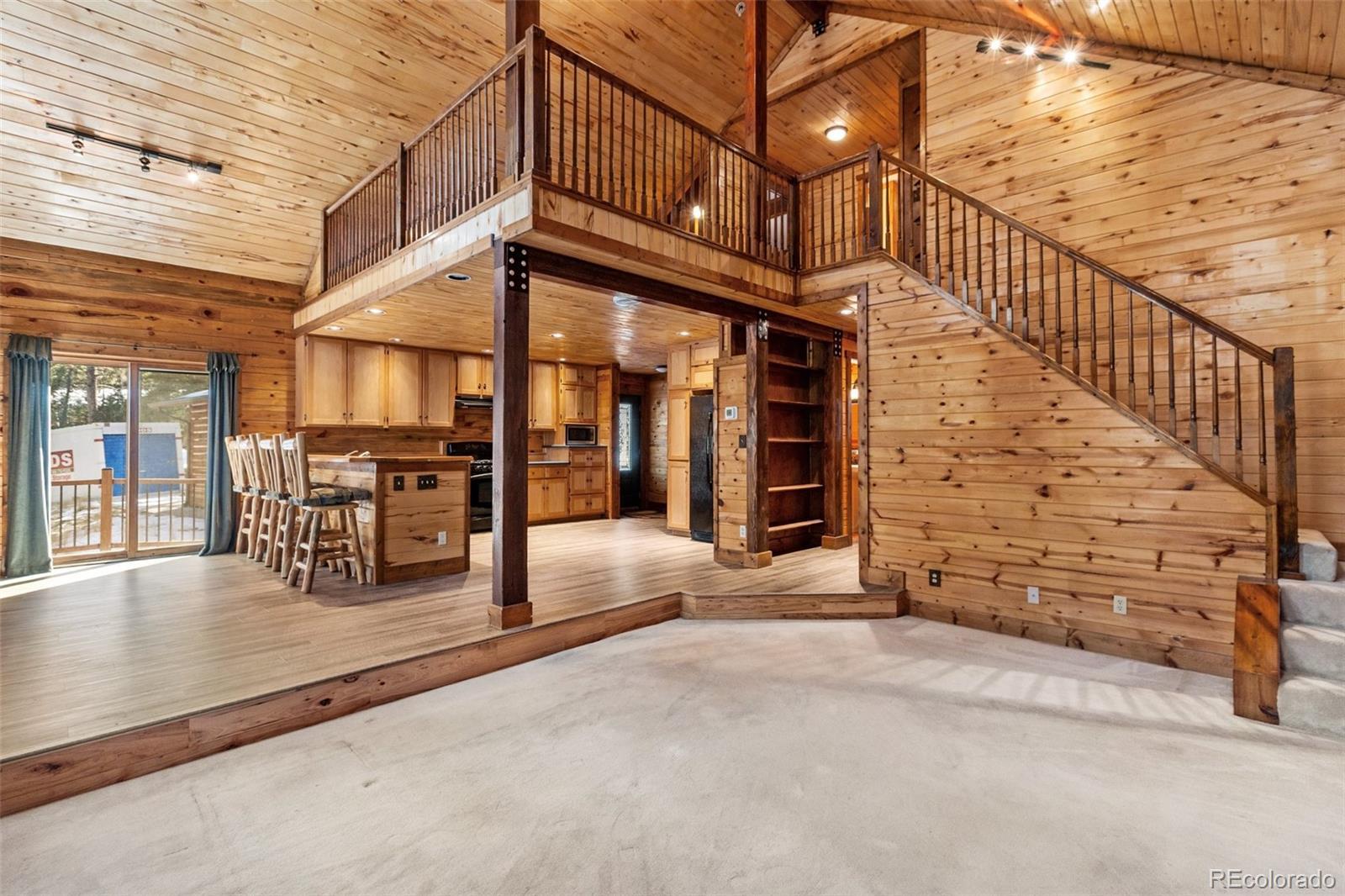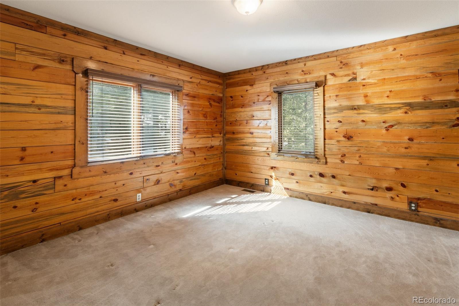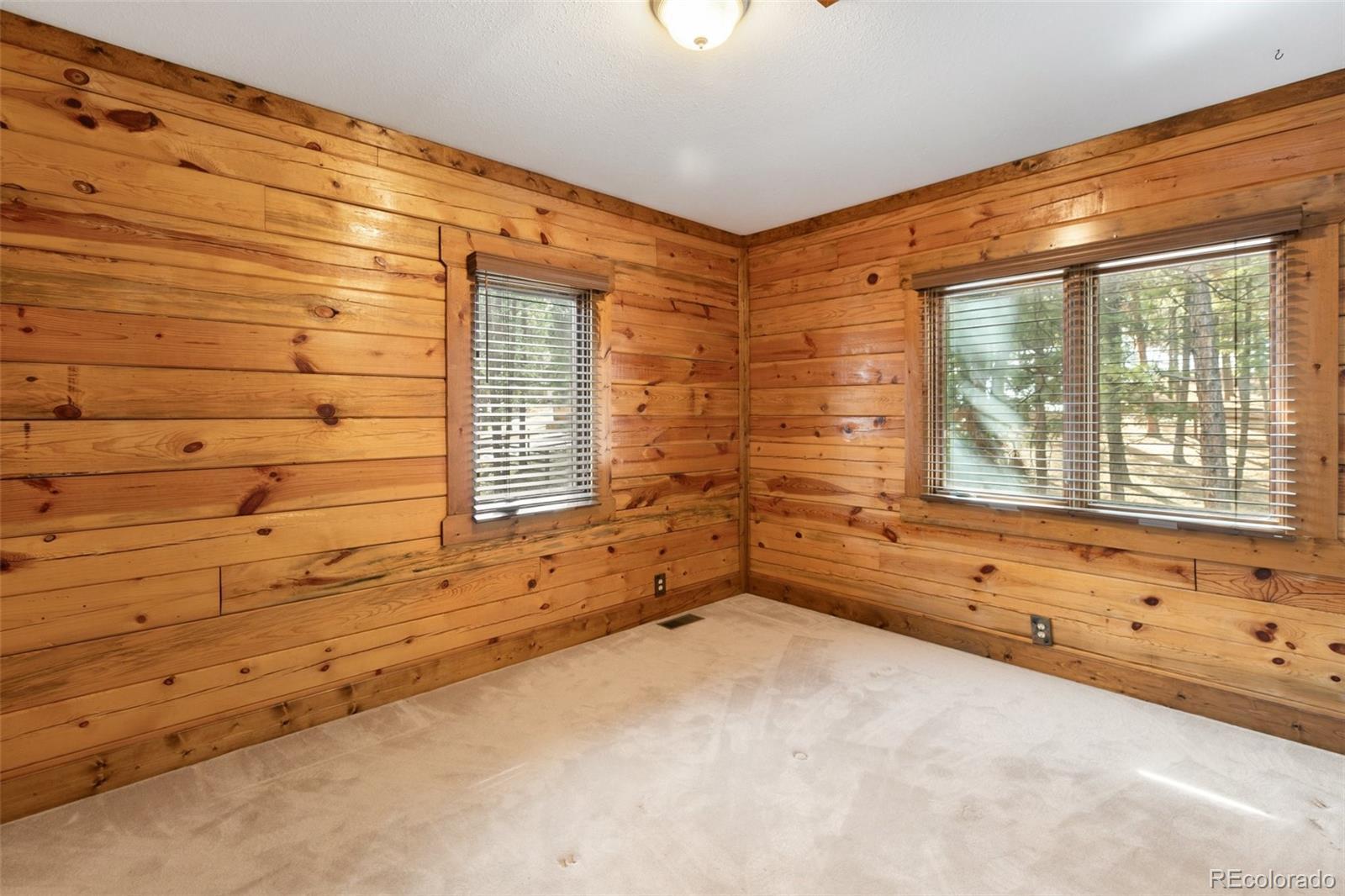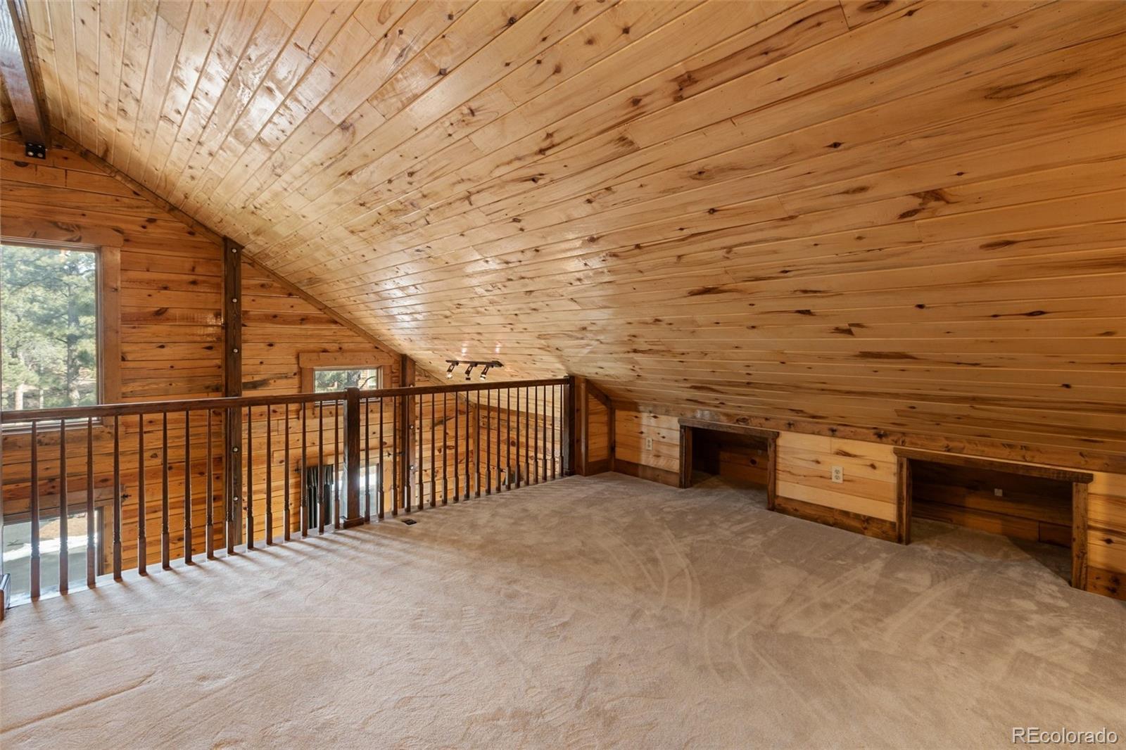 Classic full log home on a private, treed half-acre in the desirable Spruce Haven subdivision—just a short walk to downtown Woodland Park, restaurants, shopping, and everyday conveniences. This 4-bedroom, 3.5-bath home offers over 3,000 square feet of warm, authentic mountain living with a dramatic vaulted great room, exposed log interior, and wood-burning stove that anchors the space. The open kitchen features a large island and generous counter space, flowing easily into the dining and living areas for comfortable daily living or entertaining. The main-level primary bedroom provides convenient single-level living, while the upper loft overlooks the great room and offers flexible space for an office, reading area, or additional living space. The walk-out lower level features a spacious second living area with bar/kitchenette, ideal for guests, multi-generational living, or private quarters. With bedrooms and living areas on multiple levels, the floor plan offers flexibility for a variety of lifestyles. Step outside to the large wrap-around deck and enjoy the peaceful, wooded setting among mature pines. The detached two-car garage is log-sided to match the home, creating a cohesive rustic aesthetic. Natural gas, city utilities, and a location that combines privacy with easy walkability to town amenities make this a rare opportunity in Woodland Park.