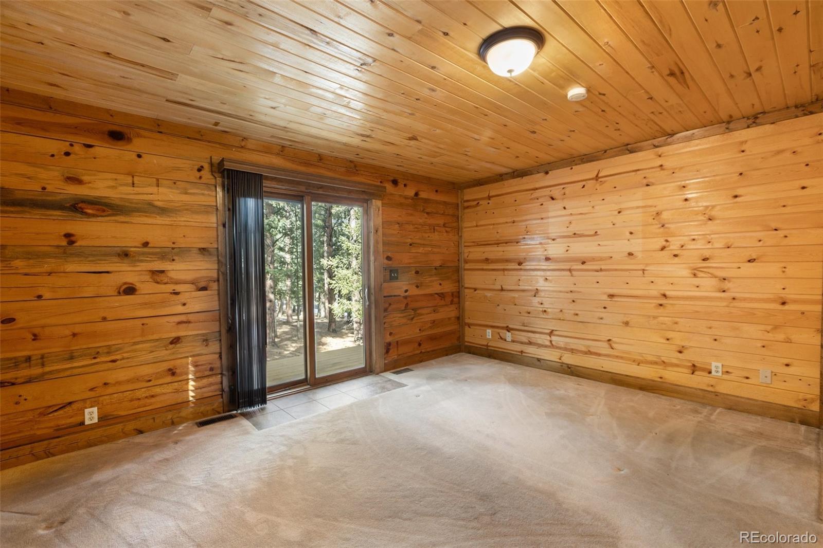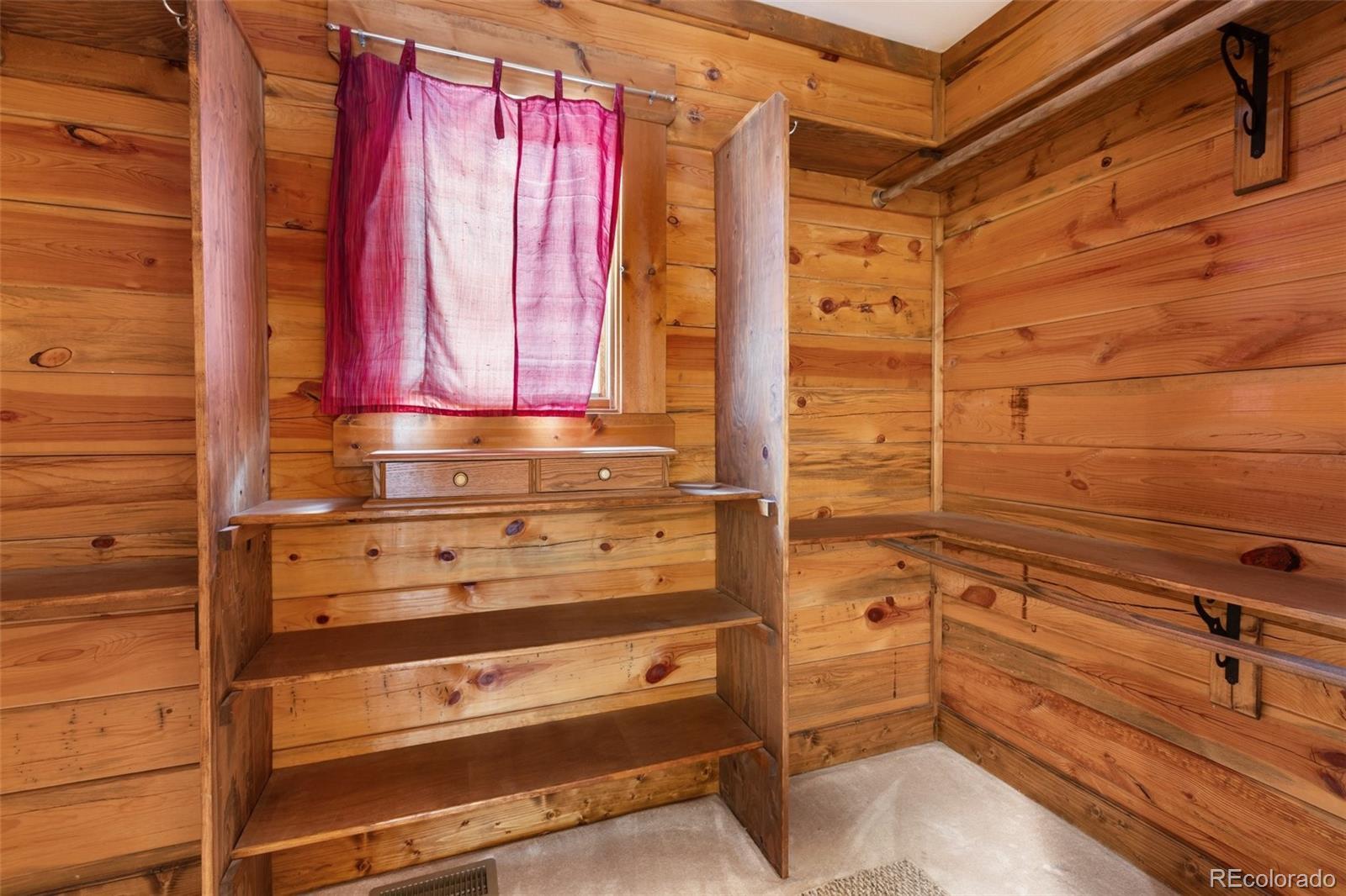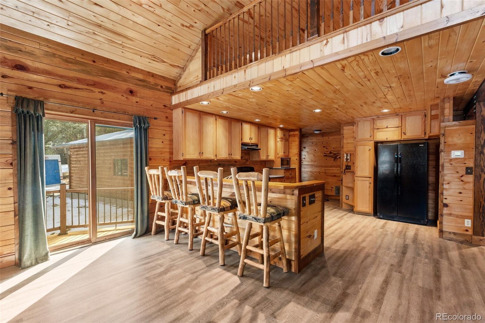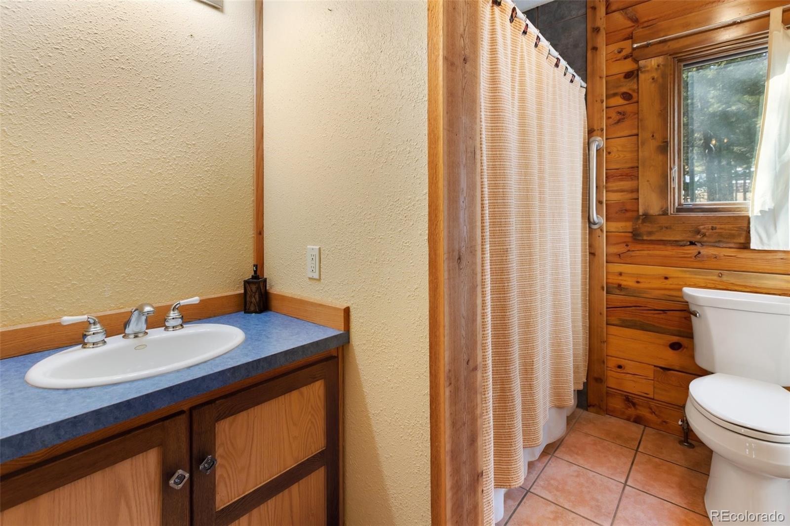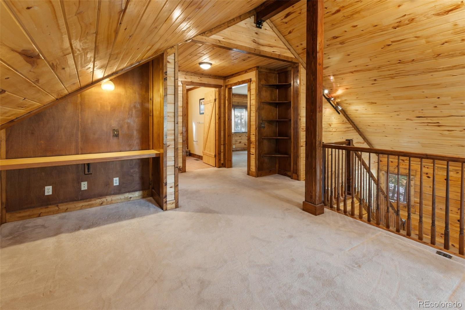 Classic full log home on a private, treed half-acre in the desirable Spruce Haven subdivision—just a short walk to downtown Woodland Park, restaurants, shopping, and everyday conveniences. This 4-bedroom, 3.5-bath home offers over 3,000 square feet of warm, authentic mountain living with a dramatic vaulted great room, exposed log interior, and wood-burning stove that anchors the space. The open kitchen features a large island and generous counter space, flowing easily into the dining and living areas for comfortable daily living or entertaining. The main-level primary bedroom provides convenient single-level living, while the upper loft overlooks the great room and offers flexible space for an office, reading area, or additional living space. The walk-out lower level features a spacious second living area with bar/kitchenette, ideal for guests, multi-generational living, or private quarters. With bedrooms and living areas on multiple levels, the floor plan offers flexibility for a variety of lifestyles. Step outside to the large wrap-around deck and enjoy the peaceful, wooded setting among mature pines. The detached two-car garage is log-sided to match the home, creating a cohesive rustic aesthetic. Natural gas, city utilities, and a location that combines privacy with easy walkability to town amenities make this a rare opportunity in Woodland Park.