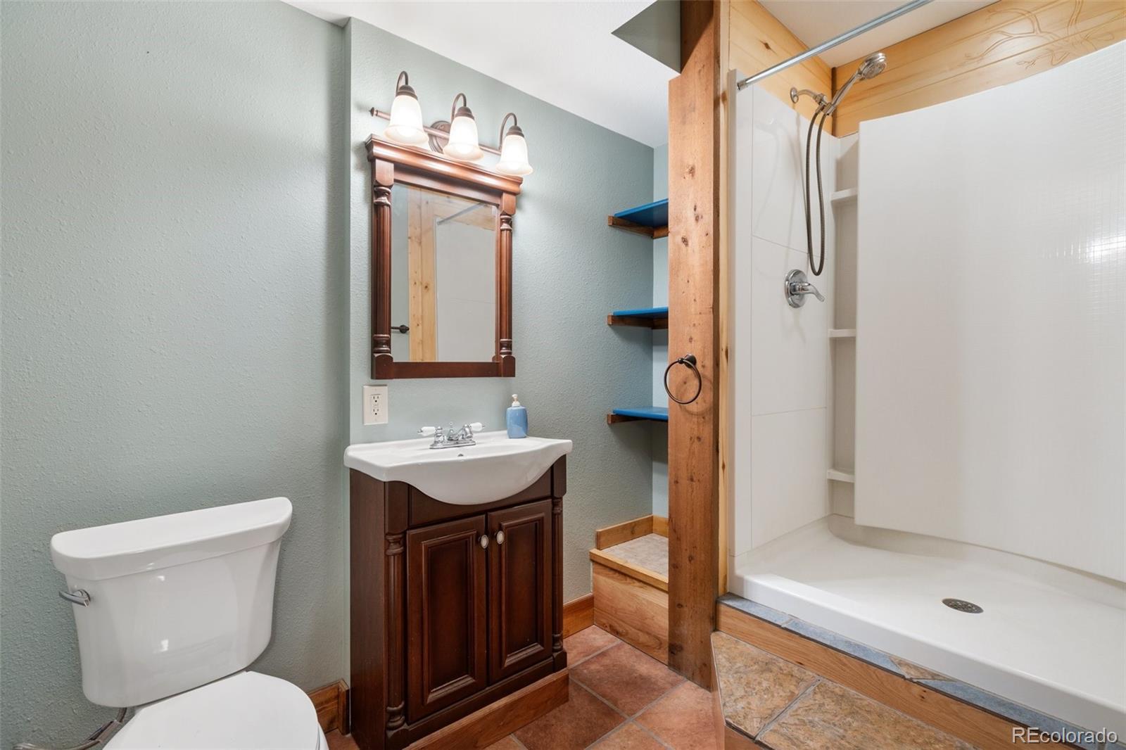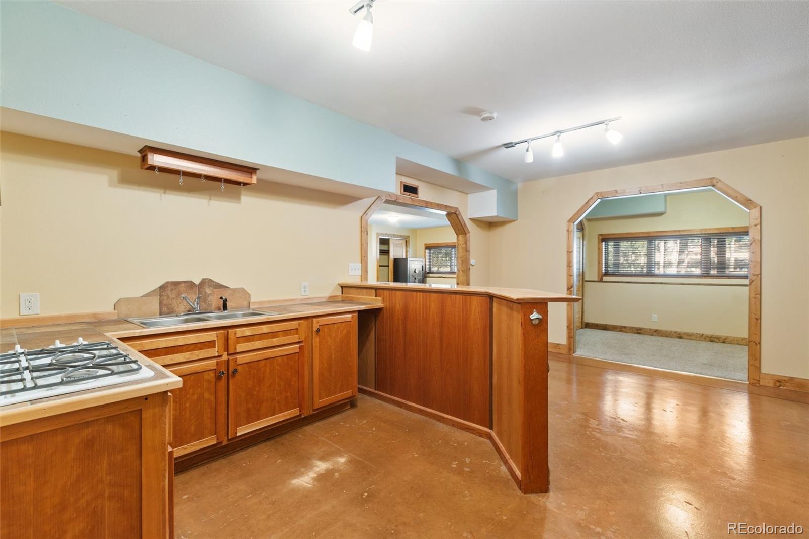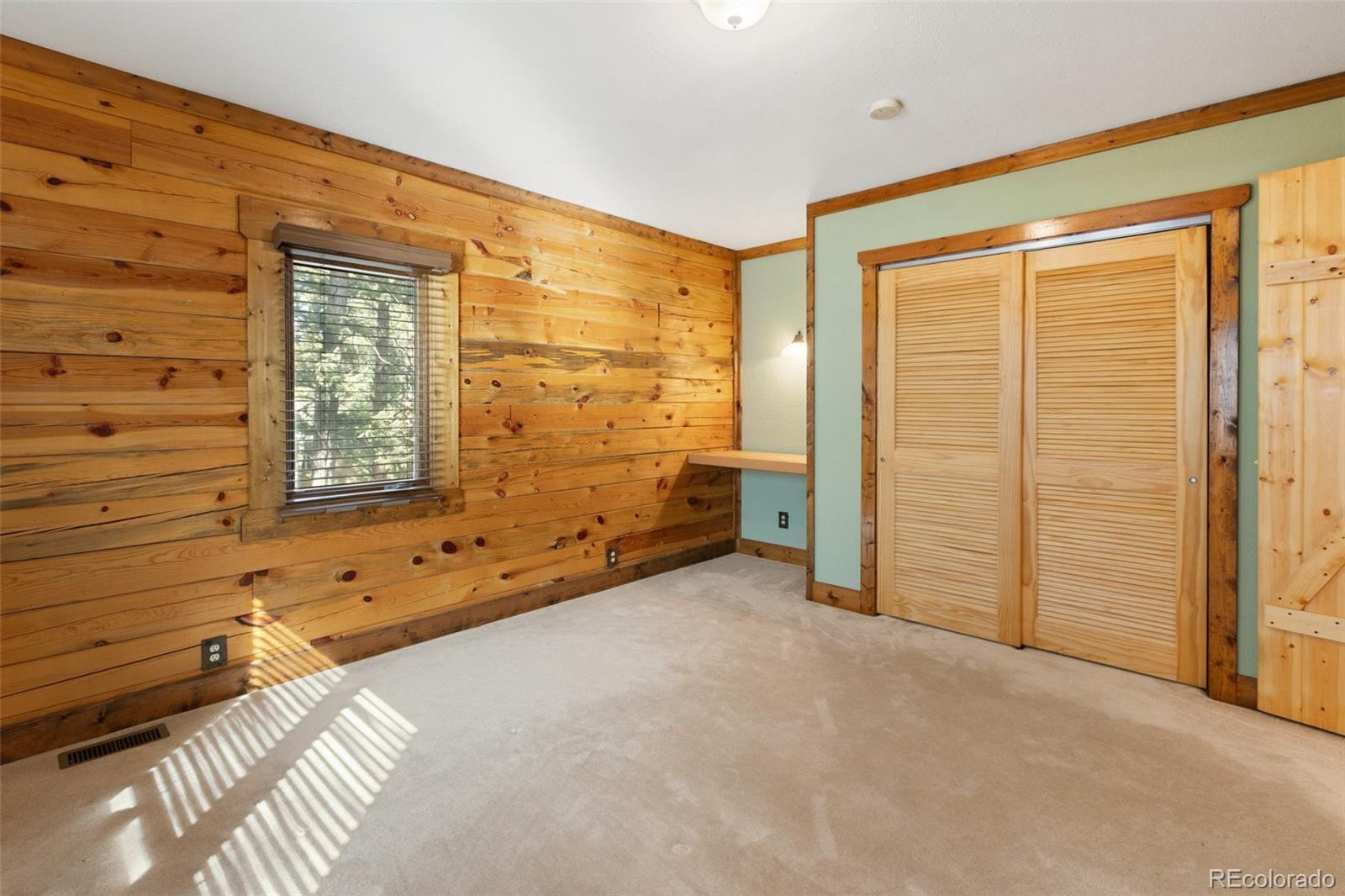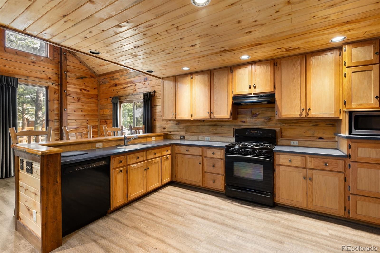 Classic full log home on a private, treed half-acre in the desirable Spruce Haven subdivision—just a short walk to downtown Woodland Park, restaurants, shopping, and everyday conveniences. This 4-bedroom, 3.5-bath home offers over 3,000 square feet of warm, authentic mountain living with a dramatic vaulted great room, exposed log interior, and wood-burning stove that anchors the space. The open kitchen features a large island and generous counter space, flowing easily into the dining and living areas for comfortable daily living or entertaining. The main-level primary bedroom provides convenient single-level living, while the upper loft overlooks the great room and offers flexible space for an office, reading area, or additional living space. The walk-out lower level features a spacious second living area with bar/kitchenette, ideal for guests, multi-generational living, or private quarters. With bedrooms and living areas on multiple levels, the floor plan offers flexibility for a variety of lifestyles. Step outside to the large wrap-around deck and enjoy the peaceful, wooded setting among mature pines. The detached two-car garage is log-sided to match the home, creating a cohesive rustic aesthetic. Natural gas, city utilities, and a location that combines privacy with easy walkability to town amenities make this a rare opportunity in Woodland Park.