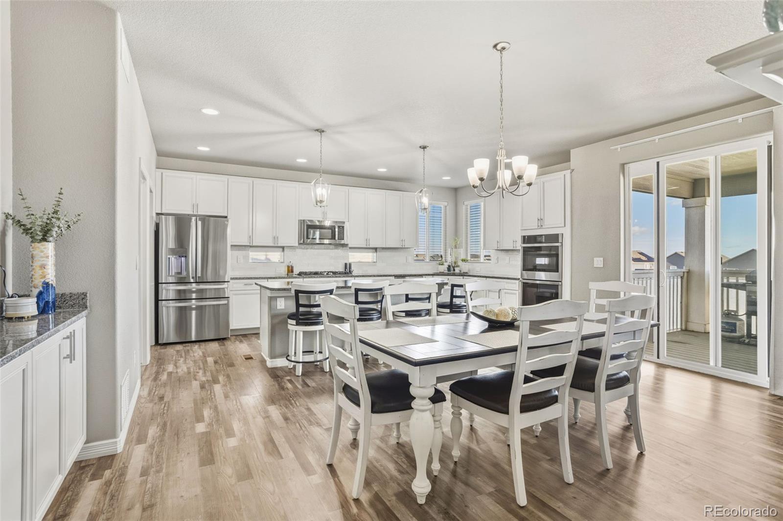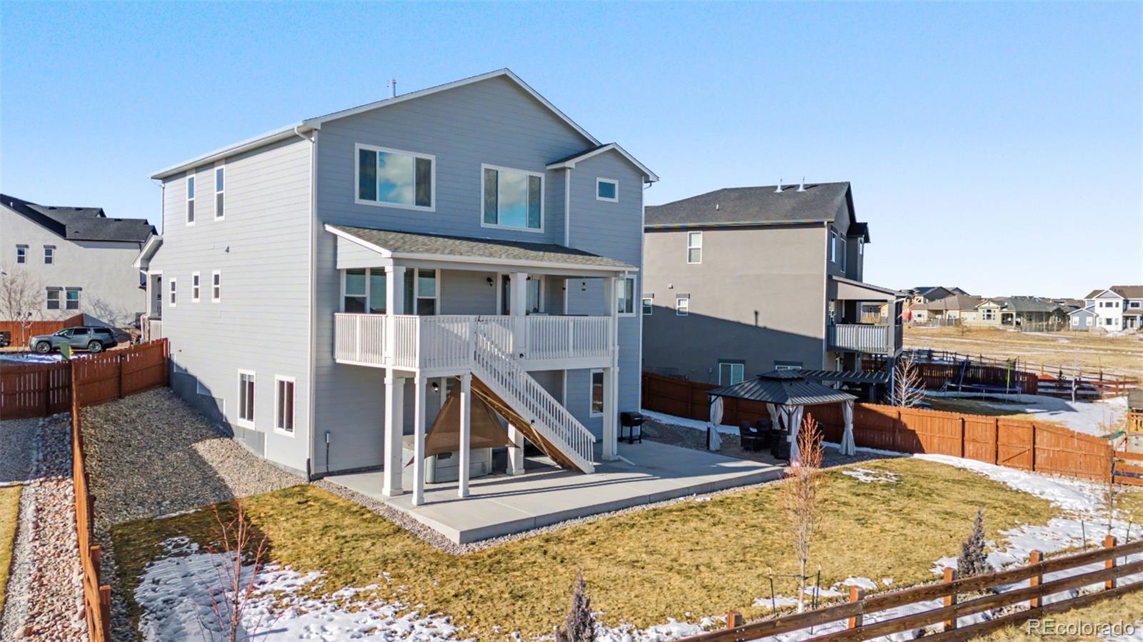 Built in 2021, this impressive property features 4 bedrooms, 3.5 baths, and a 4-car garage and is situated within the highly sought-after Meridian Ranch community. The location offers convenient access to shopping, dining, and schools, and provides an easy commute to Peterson Space Force Base and Schriever Space Force Base. With over 4,100 square feet of thoughtfully designed living space, the floor plan accommodates both entertaining and relaxation. The kitchen is equipped with GE stainless steel smart appliances, including a spacious refrigerator, five-burner gas cooktop, dual wall ovens, and a whisper-quiet dishwasher, streamlining meal preparation and clean-up. Meals can be enjoyed in the dining area, separated from the living room by a pass-through gas fireplace, or outdoors on the extensive covered deck with scenic views. Upstairs, the primary suite includes a dedicated sitting area separated by a pass-through fireplace, an ensuite bathroom, and a generous walk-in closet. Two additional bedrooms and a loft provide ample accommodation for family or guests, and the conveniently located upstairs laundry room adds ease to daily routines. The walkout basement offers additional amenities, including a wet bar, a spacious family room, a game or media room, an additional bedroom, and a full bathroom. The insulated, sheet-rocked, and heated garage provides ample space for a workshop. The fully landscaped yard features a sprinkler and drip irrigation system for optimal maintenance. Outdoor enhancements include a 12x14 gazebo and a hot tub, ideal for relaxation. Additional features include a smart thermostat, Kwikset keyless entry, Blink doorbell system, whole-house water filtration, and in-eave outlets operated by a dedicated switch in the garage for effortless holiday decorating. This exceptional home in Meridian Ranch presents a unique opportunity to enjoy comfort, convenience, and modern amenities in a beautifully planned setting.