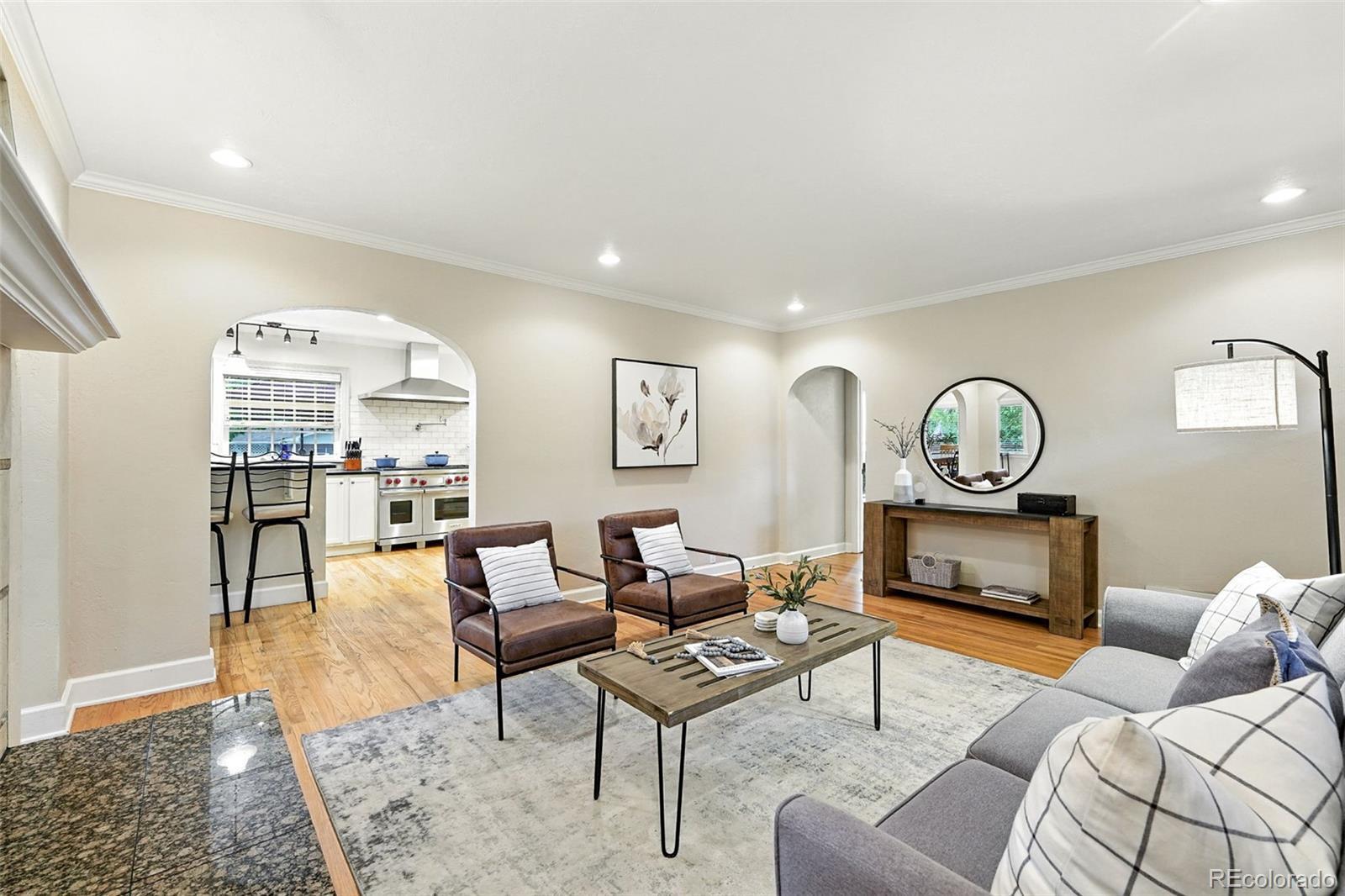 This is the one you've been waiting for. Nestled on a generous 1/3-acre corner lot in the highly sought-after Lakewood Heights neighborhood, this stunning home offers true main-floor living with designer touches throughout. Step inside and be welcomed by soaring vaulted ceilings, raw oak hardwood floors, and a striking double-sided gas fireplace that elegantly separates the formal living room from the inviting family/gathering space. The chef's kitchen is a showstopper—expertly designed with soapstone countertops, a high-end Wolf gas range with a pot-filler faucet, prep sink, beverage fridge, KitchenAid appliances, and a spacious butler's pantry complete with under-cabinet lighting. A sunlit dining room, surrounded by windows, and a charming sunroom/office that opens to an expansive deck are ideal for indoor/outdoor living. The split floor plan ensures privacy and comfort, and the spacious primary suite features a five-piece bath, walk-in closet, and convenient access to the main-floor laundry. The secondary bedroom, tucked away at the back of the home, is adjacent to a full bathroom with brand-new tile flooring. Head downstairs to discover a private guest suite with brand-new carpet, its own full bathroom, a versatile bonus room, and additional finished space—plus ample unfinished square footage perfect for storage or future expansion. Outside, enjoy your very own gardener's paradise. The beautifully landscaped lot is filled with perennials, sunflowers, and thriving vegetable gardens. A three-car detached garage with EV charging capability completes the package. All of this in an unbeatable location—just minutes from Belmar shopping and dining, downtown Denver, and the W light rail line just blocks away. Seller is offering a concession to finish out the unfinished part of the basement. Call listing agent to inquire!