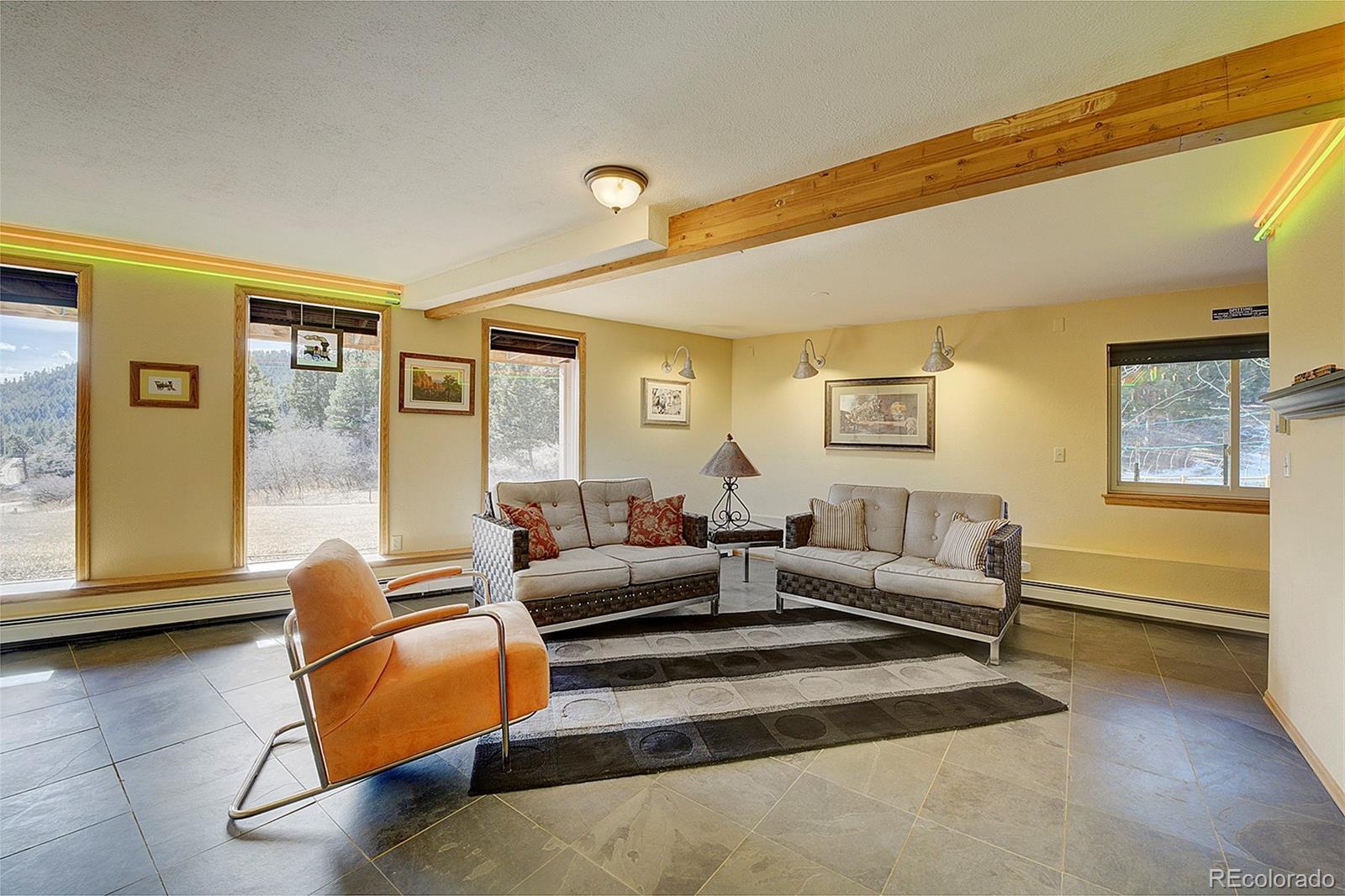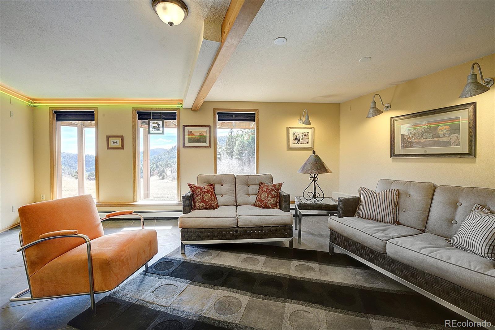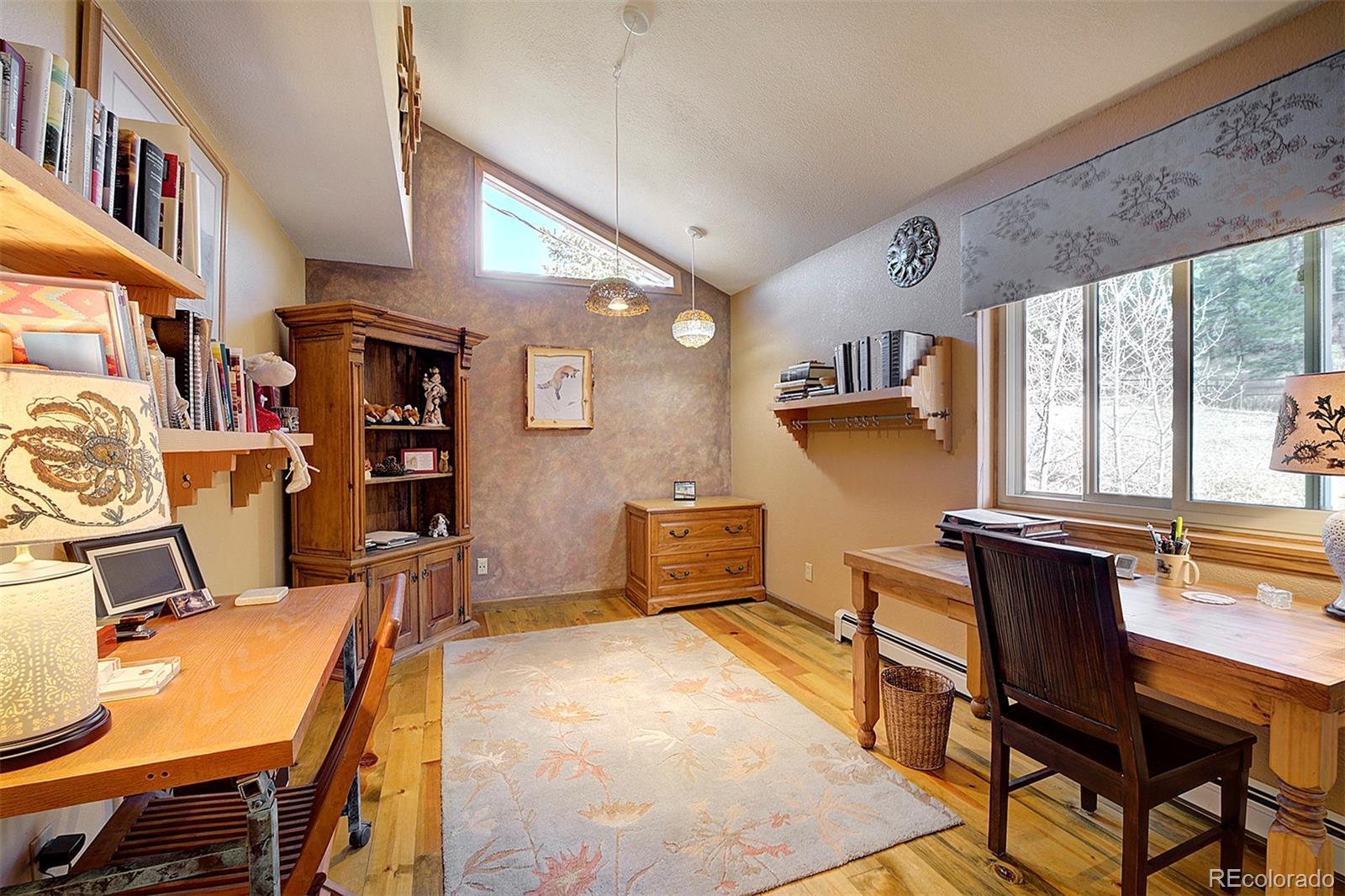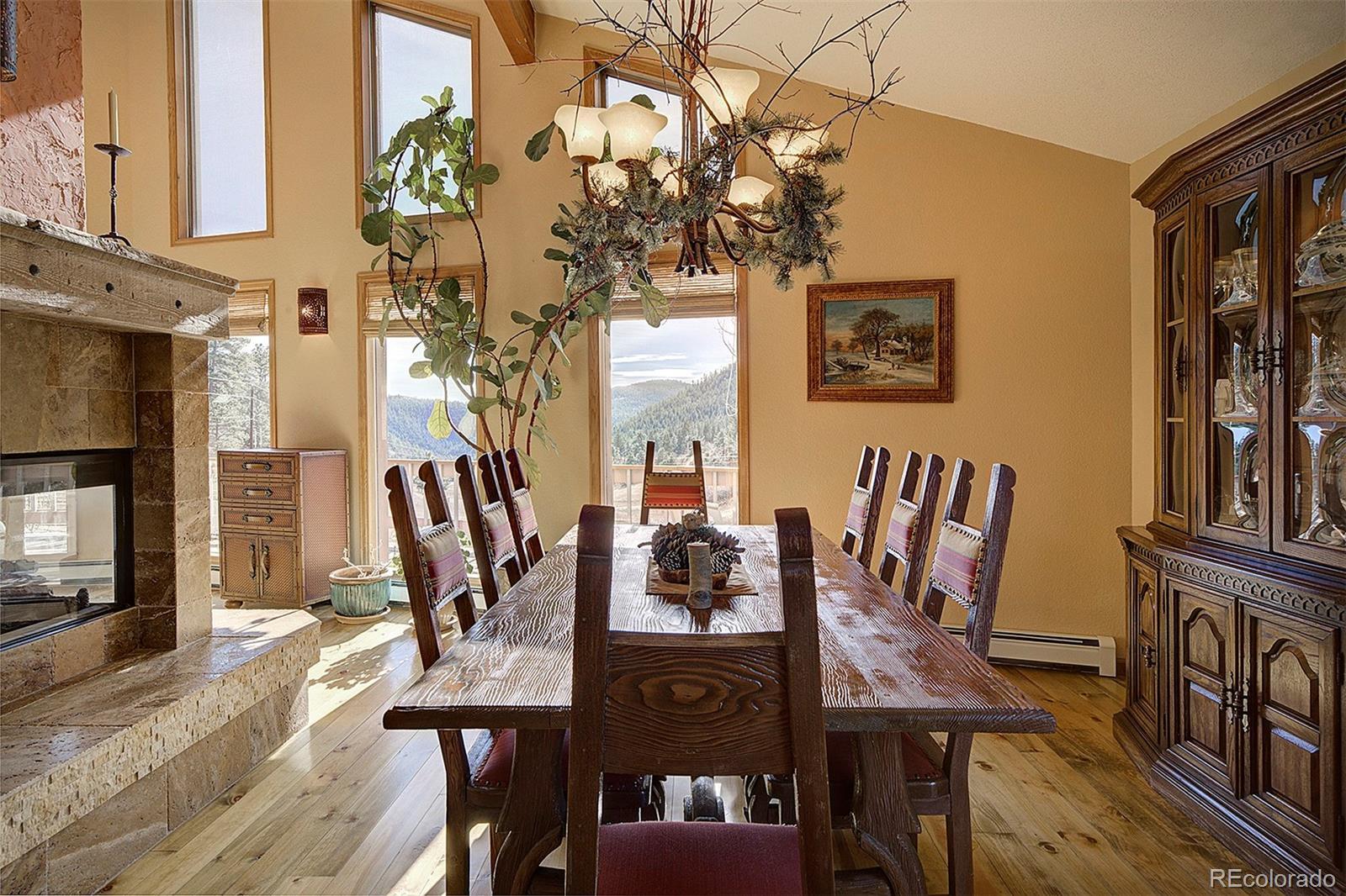 Bathed in natural light and framed by soaring windows, this inviting mountain home blends rustic elegance with open design. The main living areas feature vaulted ceilings with exposed wood beams, warm hardwood floors, and expansive walls of windows that capture peaceful views of the surrounding landscape and flood the space with sunlight throughout the day. A striking stone fireplace anchors the great room, creating a natural gathering place. The living room flows seamlessly into the dining and entertaining spaces, offering an effortless welcoming layout. Thoughtful architectural details, custom finishes, and natural textures throughout the home enhance its warm mountain character while maintaining a refined, timeless appeal. The spacious bedroom serves as a true retreat, featuring rich colors, charming metalwork, and generous windows that invite in soft natural light and tranquil views. The room’s layout allows for both comfort and functionality, creating a peaceful escape at the end of the day. Nearby, the spa-inspired bathroom elevates daily routines with elegant stone surfaces, vessel sinks, and carefully selected fixtures that reflect understated luxury. Step outside onto the expansive wraparound deck, where indoor and outdoor living blend seamlessly. This generous outdoor space is ideal for morning coffee, afternoon lounging, sunset dinners, and stargazing beneath wide-open skies, all surrounded by serene natural scenery. Whether hosting friends or enjoying quiet moments alone, the setting offers a true sense of escape. With abundant storage, thoughtfully designed living spaces, and a layout that balances openness with privacy, this beautifully maintained home is perfectly suited as a peaceful mountain getaway. From quiet mornings filled with light to cozy evenings by the fire, this property captures mountain living at its most inviting and refined. New roof and leaf-guard gutters December 2025. New water heater January 2026.