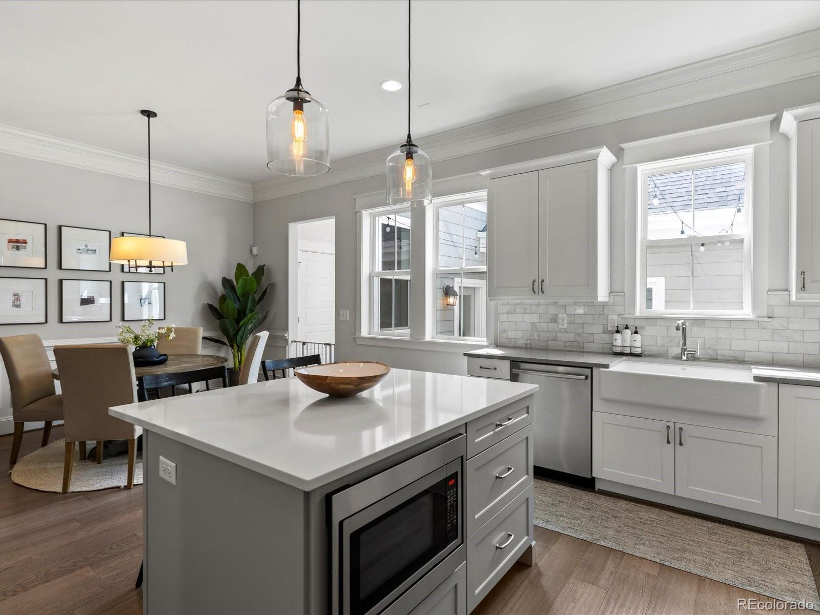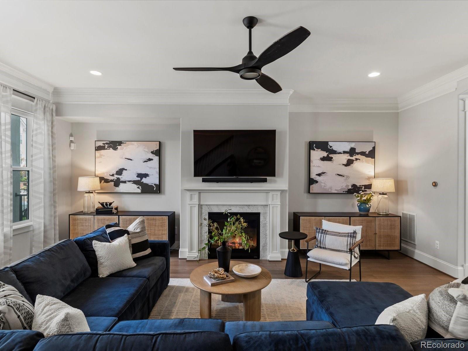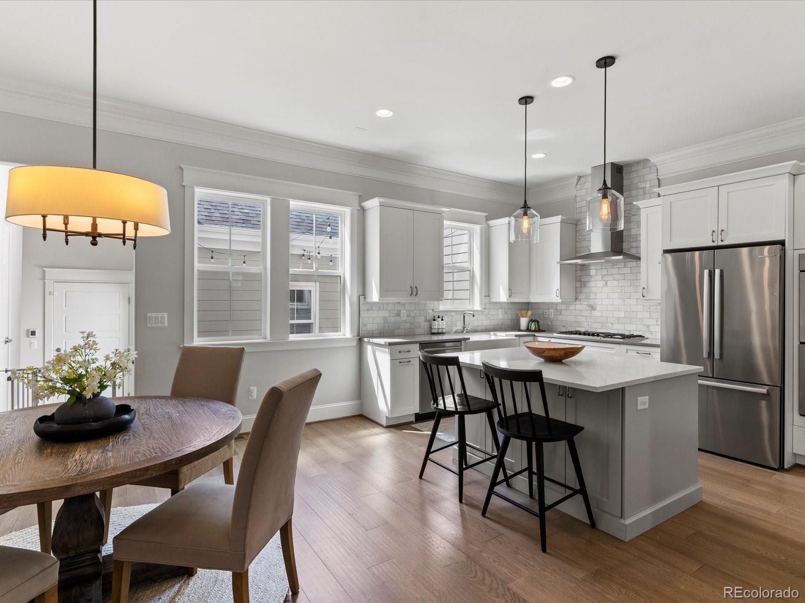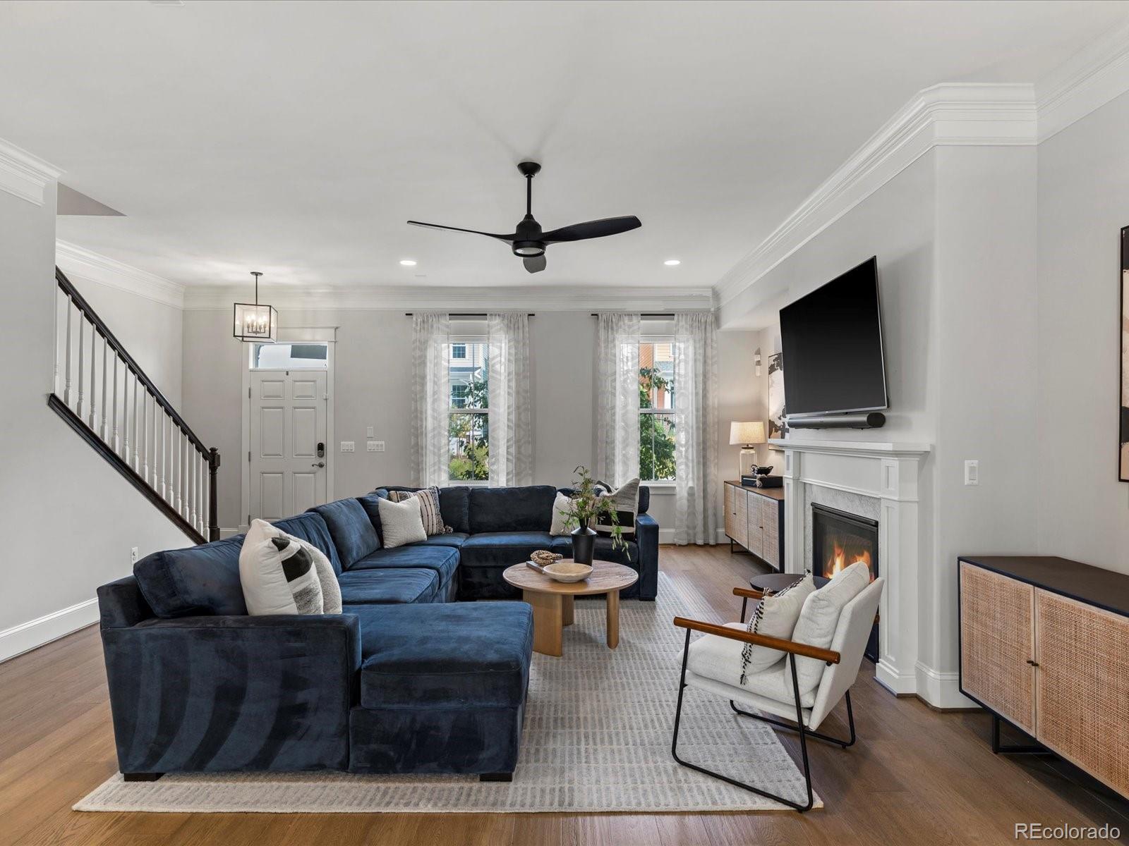 Discover refined elegance in this beautifully designed 4 bedroom, 4.5 bath Parkwood “Brookline” townhome, ideally located in Central Park’s sought-after North End. Just blocks from Splash Landing Pool, North Sports Fields, and nearby pickleball courts, this home offers the perfect blend of sophistication, comfort, and convenience. Inside, exquisite Parkwood millwork, rich wide-plank hardwood floors, and soaring 10-foot ceilings create a sense of grandeur throughout. The open-concept main level is anchored by a striking white-mantled gas fireplace in the living room, seamlessly flowing into a charming dining area with elegant wainscoting. The chef’s kitchen is a showpiece, featuring gleaming white-marble quartz counters, a central eat-up island, BOSCH stainless steel appliances, soft-close cabinetry, and a marble tile backsplash. From here, a spacious mudroom transitions effortlessly to the finished 2-car garage and a private patio complete with a low-maintenance turf dog run. The second level offers flexibility and function with a generous loft, perfect for a home office or playroom, two large secondary bedrooms each with stylish en-suite baths, and a convenient laundry room with cabinetry and a utility sink. On the third floor, retreat to the luxurious primary suite with dual walk-in closets, a spa-like 5-piece en-suite bath, and access to the expansive covered rooftop balcony, ideal for morning coffee or evenings entertaining. The finished basement extends the living space with a spacious bedroom, a bath with frameless glass shower, and a family/media room complete with a dry bar and beverage fridge. With a new roof (2024) for peace of mind, NO SUB-HOA, and quick access to Anschutz Medical Campus, Downtown Denver, and DIA, this property delivers luxury, lifestyle, and location in one exceptional home.