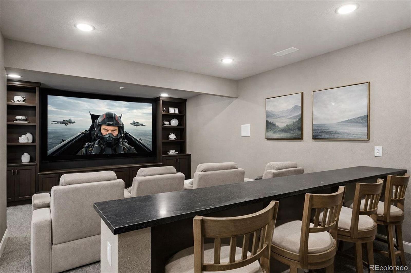 Open House | Saturday 12:00–2:00 PM | Price Improvement Now offered at an improved price, this move in ready Toll Brothers home in Regency at Montaine features a fully finished basement and over 3,700 finished square feet in one of Castle Rock’s premier 55+ communities. Built in 2021, the sought after Boyd floorplan offers 5 bedrooms, 3 bathrooms, and $200,000 in post construction upgrades, delivering new construction quality without the wait or added design center costs. The finished basement includes a custom home theater, surround sound, wet bar with full size refrigerator, two additional bedrooms, and a full bath, ideal for guests, multigenerational living, or hobbies. Situated on a premium lot backing to protected open space and greenbelt, the home captures mountain views and exceptional privacy. Outdoor features include low maintenance landscaping, a fenced yard, fire pit, and an extended patio overlooking open space. The main level offers tall ceilings, abundant natural light, and an open concept layout with fireplace and chef’s kitchen featuring granite countertops, stainless steel appliances, oversized island, and pantry. The main floor primary suite provides true single level living with a five piece bath and professionally designed walk in closet. Residents enjoy resort style amenities including a clubhouse, fitness center, pool, hot tub, pickleball and tennis courts, and scenic trails, just minutes from downtown Castle Rock and I 25.