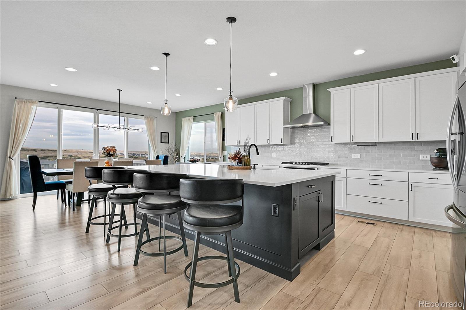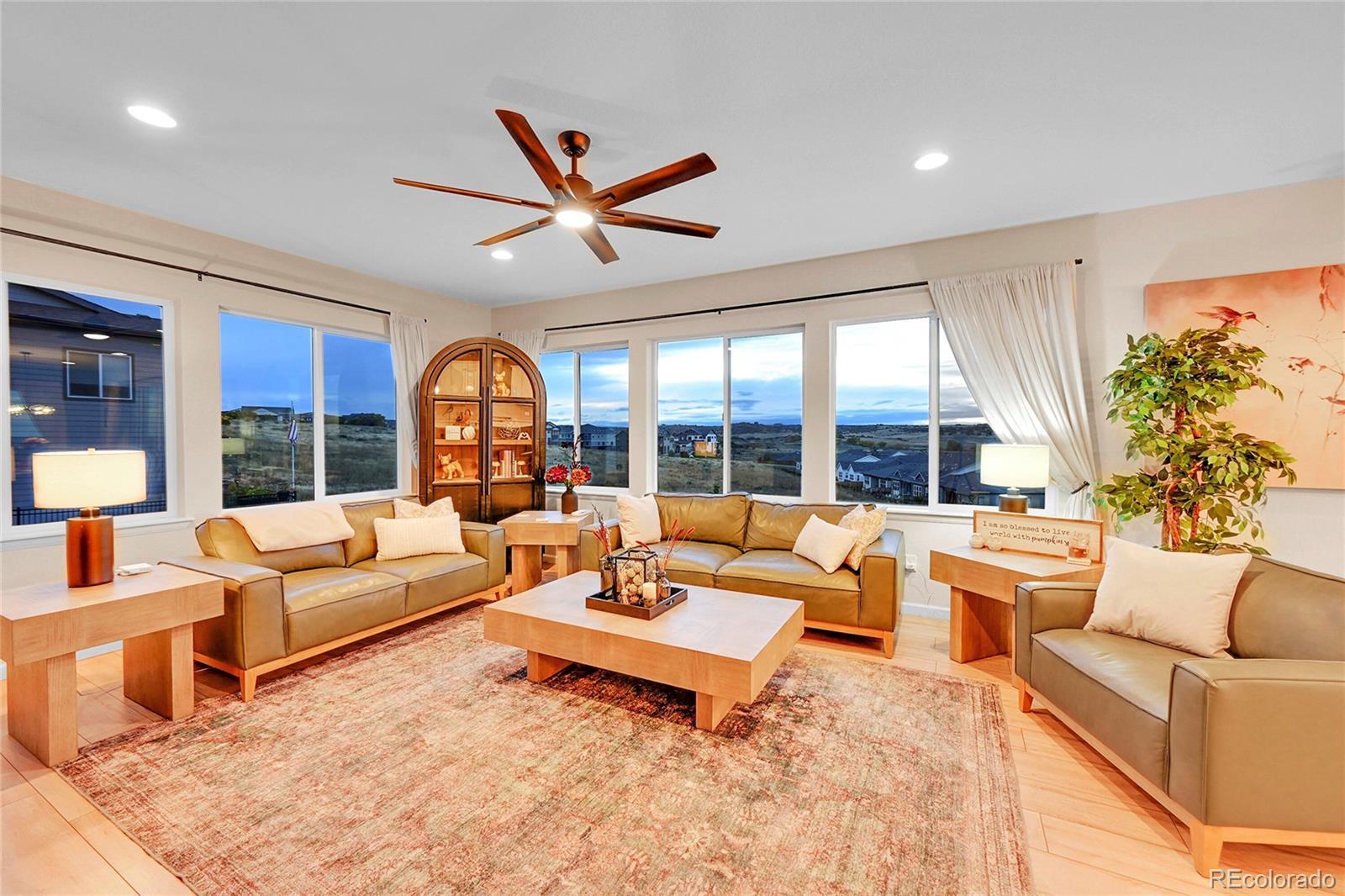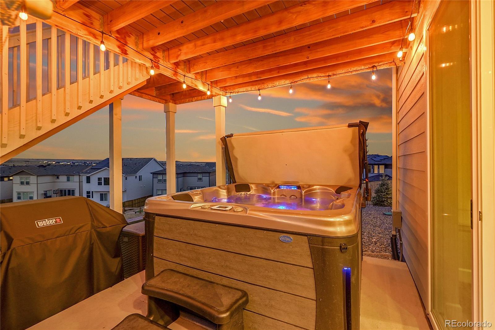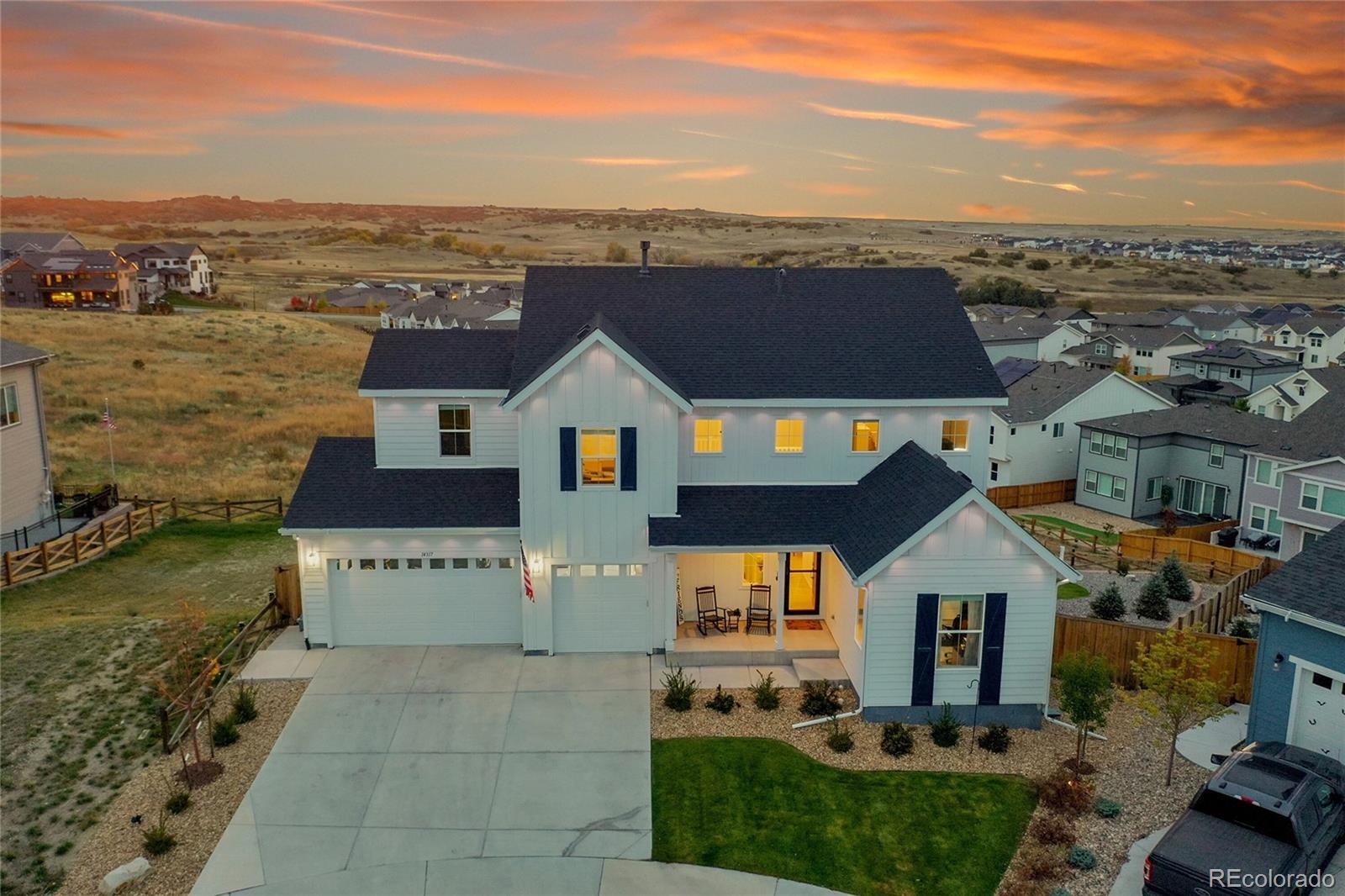 Welcome to 14317 Shasta Daisy Point — a beautifully designed home in The Trails at Crowfoot, offering modern living, breathtaking mountain views, and one of the largest lots in the community backing to open space. This 4-bedroom, 5-bath home blends luxurious finishes with a comfortable, open layout perfect for today’s lifestyle. The main level features gorgeous engineered wood floors, a private office, and a spacious great room with a sleek black shiplap fireplace surrounded by custom shelving. The gourmet kitchen is the heart of the home, showcasing a massive quartz island, stainless steel appliances, gas cooktop, subway tile backsplash, and a large walk-in pantry. The dining area opens to a deck where you can take in stunning sunsets and mountain views. Upstairs, you’ll find a spacious loft, and a luxurious primary suite featuring expansive views, a custom dual-entry shower with multiple shower heads, and a large walk-in closet. The finished walkout basement adds exceptional living space with a huge rec room, full bath, and access to the covered patio and private hot tub—ideal for relaxing or entertaining. Outside, enjoy the professionally landscaped yard, wide-open skies, and peaceful setting with no neighbors directly behind. Attached 3 car garage that is fully finished with custom coated floors and upgraded app controlled garage door openers. Exterior includes gemstone lighting that can change color and number of lights. Located near community parks, pool, and trails, with convenient access to Parker Road, I-25, and top-rated Douglas County schools, this exceptional home combines elegance, space, and location—everything you’ve been waiting for in Parker!