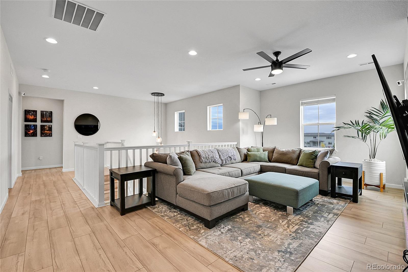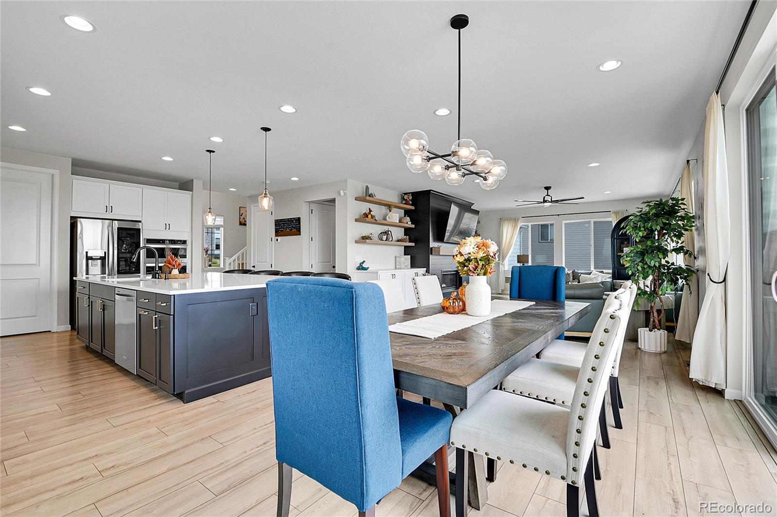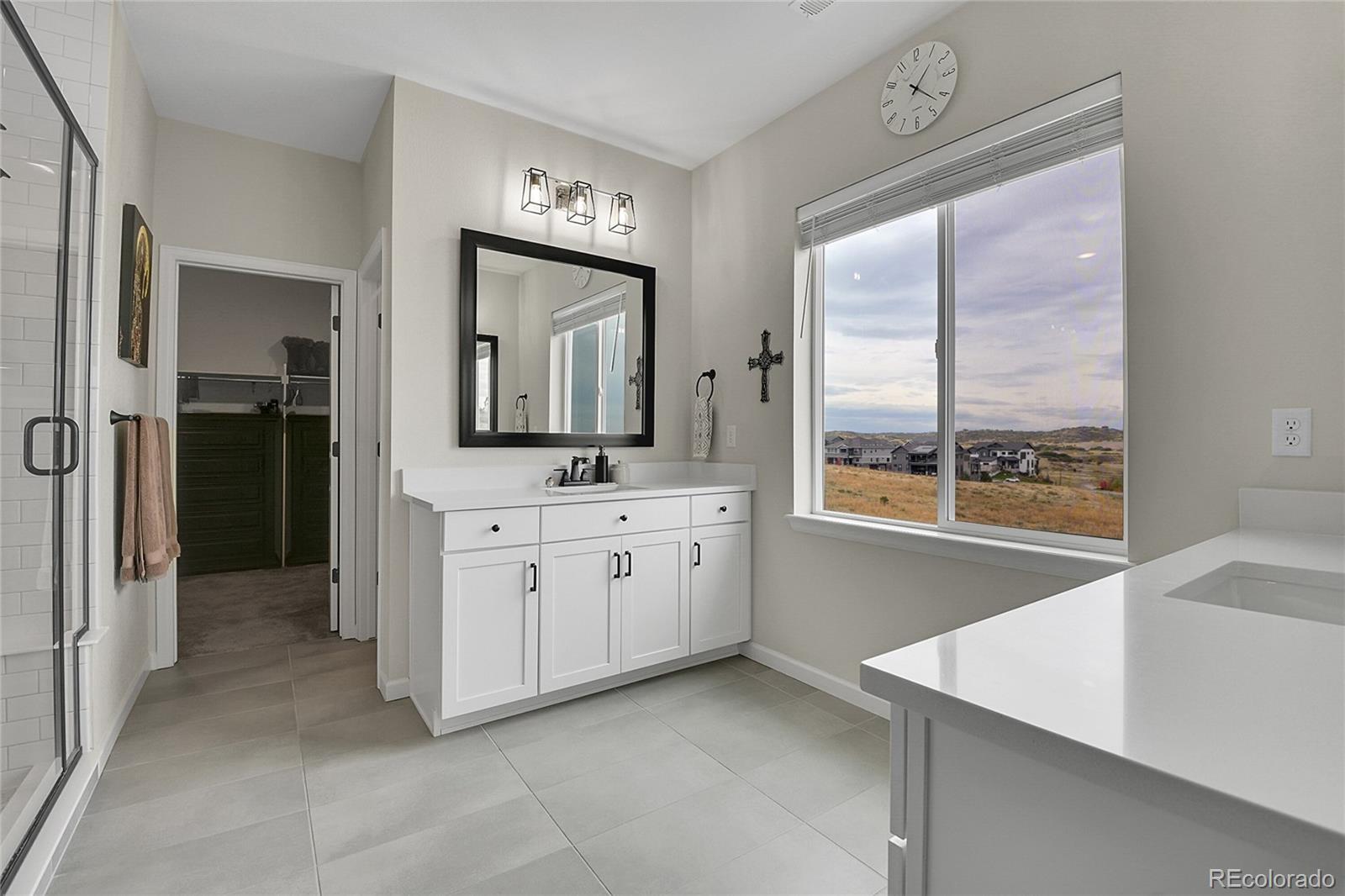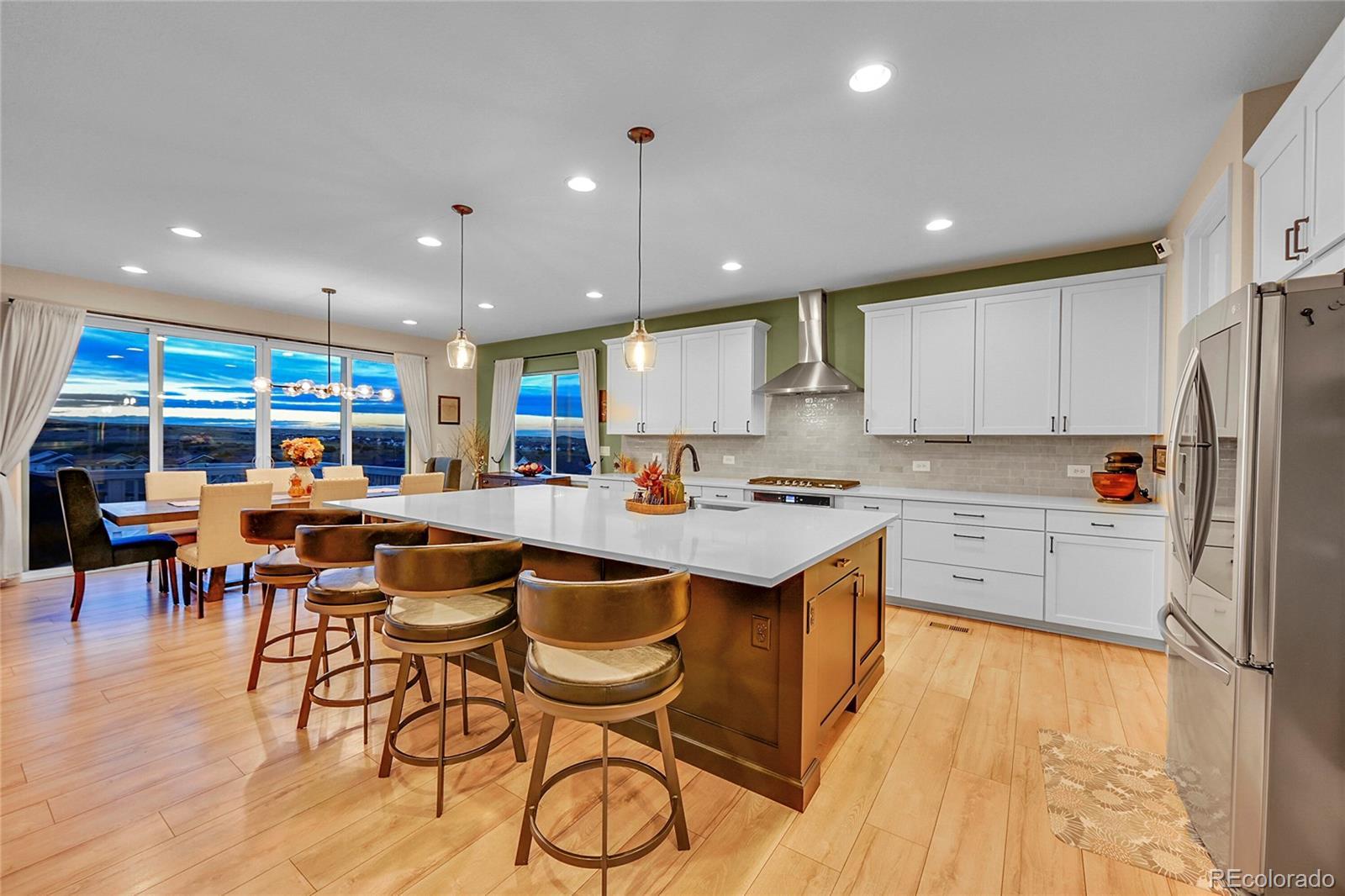 Welcome to 14317 Shasta Daisy Point — a beautifully designed home in The Trails at Crowfoot, offering modern living, breathtaking mountain views, and one of the largest lots in the community backing to open space. This 4-bedroom, 5-bath home blends luxurious finishes with a comfortable, open layout perfect for today’s lifestyle. The main level features gorgeous engineered wood floors, a private office, and a spacious great room with a sleek black shiplap fireplace surrounded by custom shelving. The gourmet kitchen is the heart of the home, showcasing a massive quartz island, stainless steel appliances, gas cooktop, subway tile backsplash, and a large walk-in pantry. The dining area opens to a deck where you can take in stunning sunsets and mountain views. Upstairs, you’ll find a spacious loft, and a luxurious primary suite featuring expansive views, a custom dual-entry shower with multiple shower heads, and a large walk-in closet. The finished walkout basement adds exceptional living space with a huge rec room, full bath, and access to the covered patio and private hot tub—ideal for relaxing or entertaining. Outside, enjoy the professionally landscaped yard, wide-open skies, and peaceful setting with no neighbors directly behind. Attached 3 car garage that is fully finished with custom coated floors and upgraded app controlled garage door openers. Exterior includes gemstone lighting that can change color and number of lights. Located near community parks, pool, and trails, with convenient access to Parker Road, I-25, and top-rated Douglas County schools, this exceptional home combines elegance, space, and location—everything you’ve been waiting for in Parker!